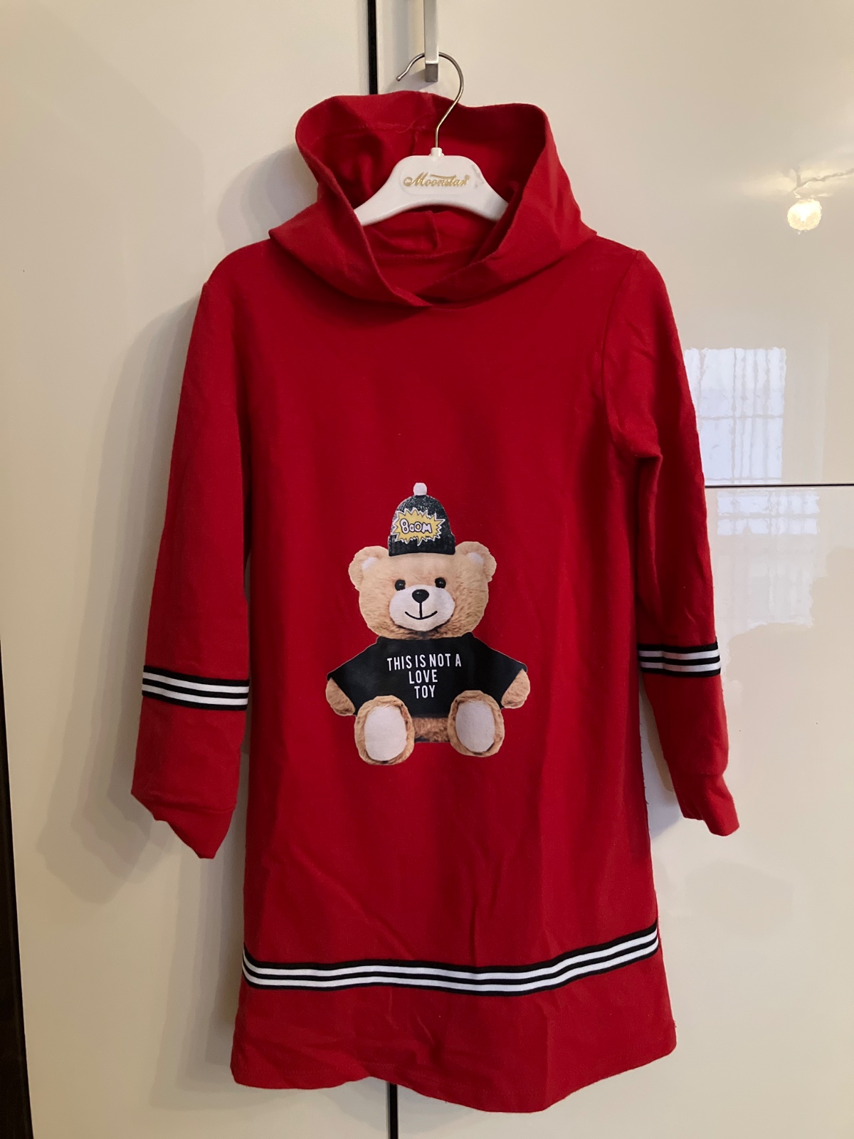 Krásne mikinove šaty s kapucňou. Bežné známky prania. Bez dierok a fľakov