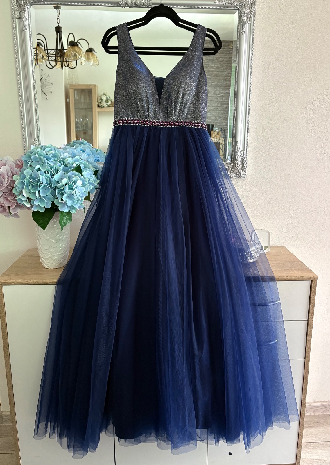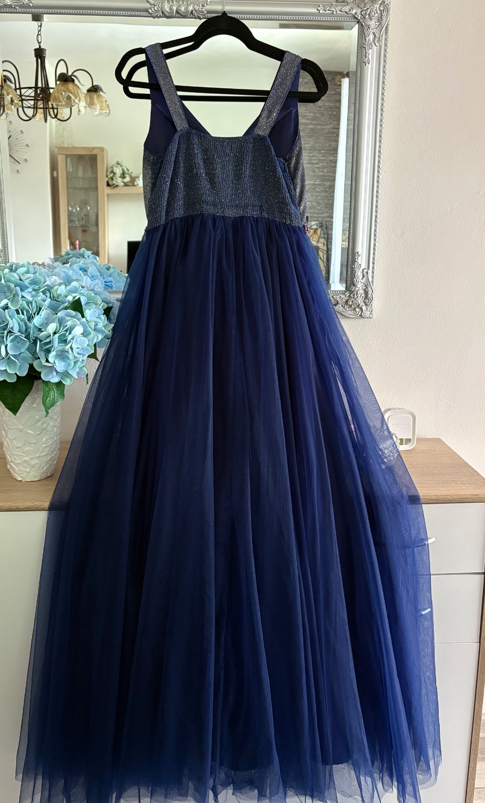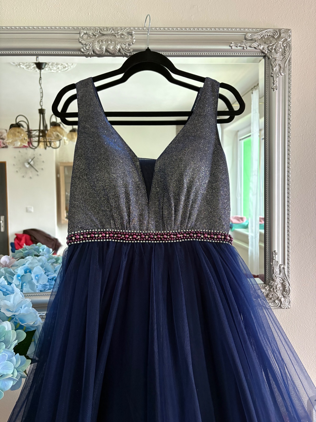 Tieto krásne modré tylové spoločenské šaty sú tou správnou voľbou pre dámy, ktoré sa chcú cítiť ako v rozprávke. Bohatá tylová sukňa šiat sa skladá z viacerých vrstiev jemného tylu, horná časť šiat je vystužená, na dvoch hrubších ramienkach. Celý vrch je prešitý striebornou niťou, ktoré dodávajú šatám nádych luxusu. V páse je pás ktorý je vykladaný perličkami. Šaty sa zapínajú vzadu