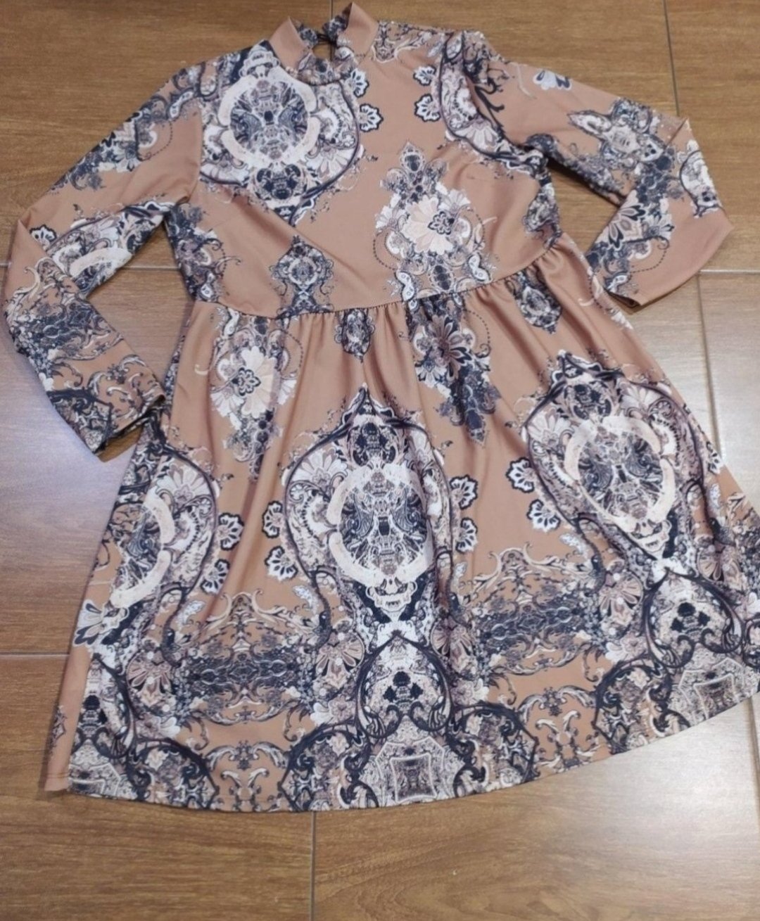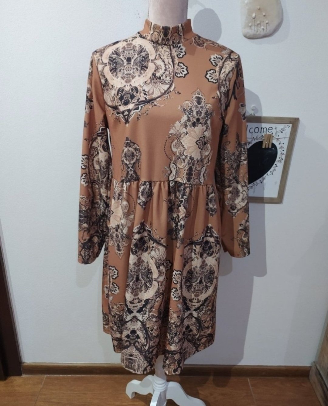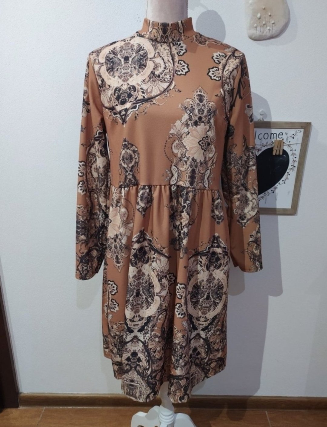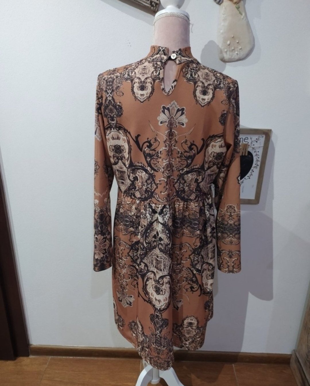 Šaty sú škoricovej farby. Sú nové, len vyskúšané. Do šiat mi treba iný objem pŕs ako mi bol daný do vienka.