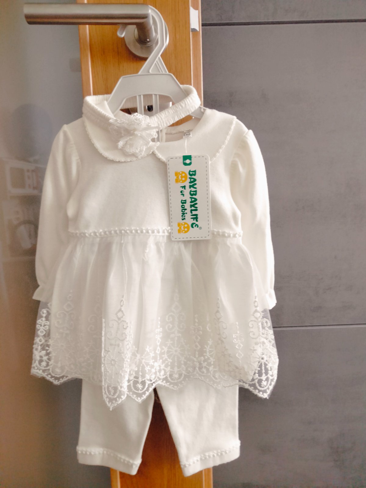 Set obsahuje šatočky, nohavice a čelenku. Sú nové ešte s visačkou. Nie sú úplne biele. Cena je 10e s poštovným