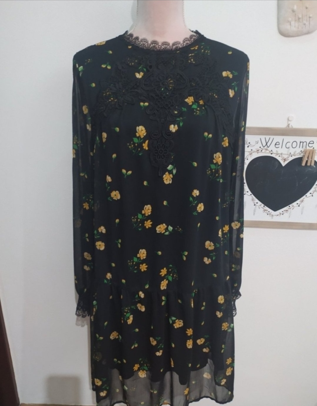 Málo nosené čierne kvetinové šaty s viazaním na krku. Zapínanie na boku na zips. Šaty majú podšité čierne šaty