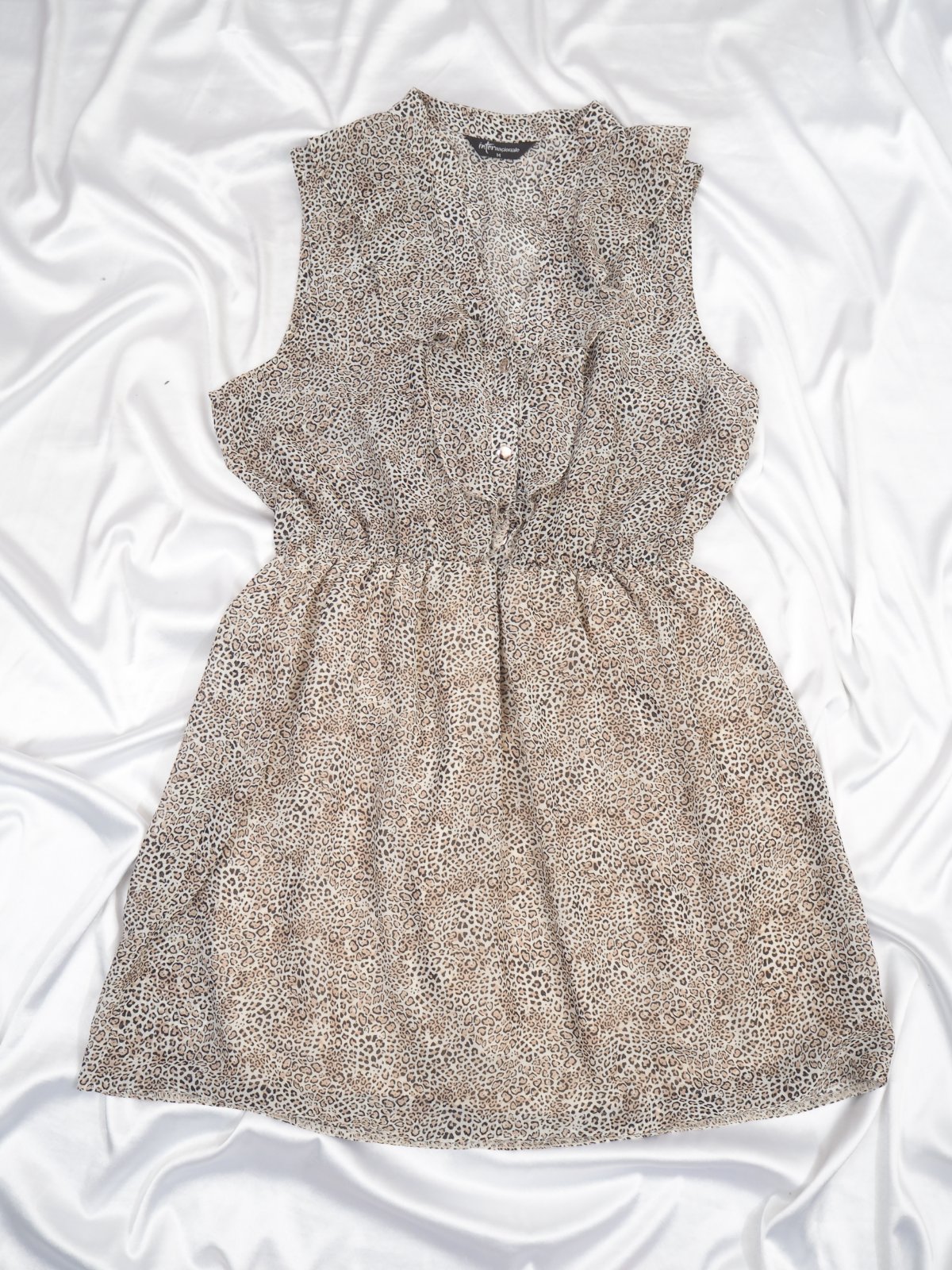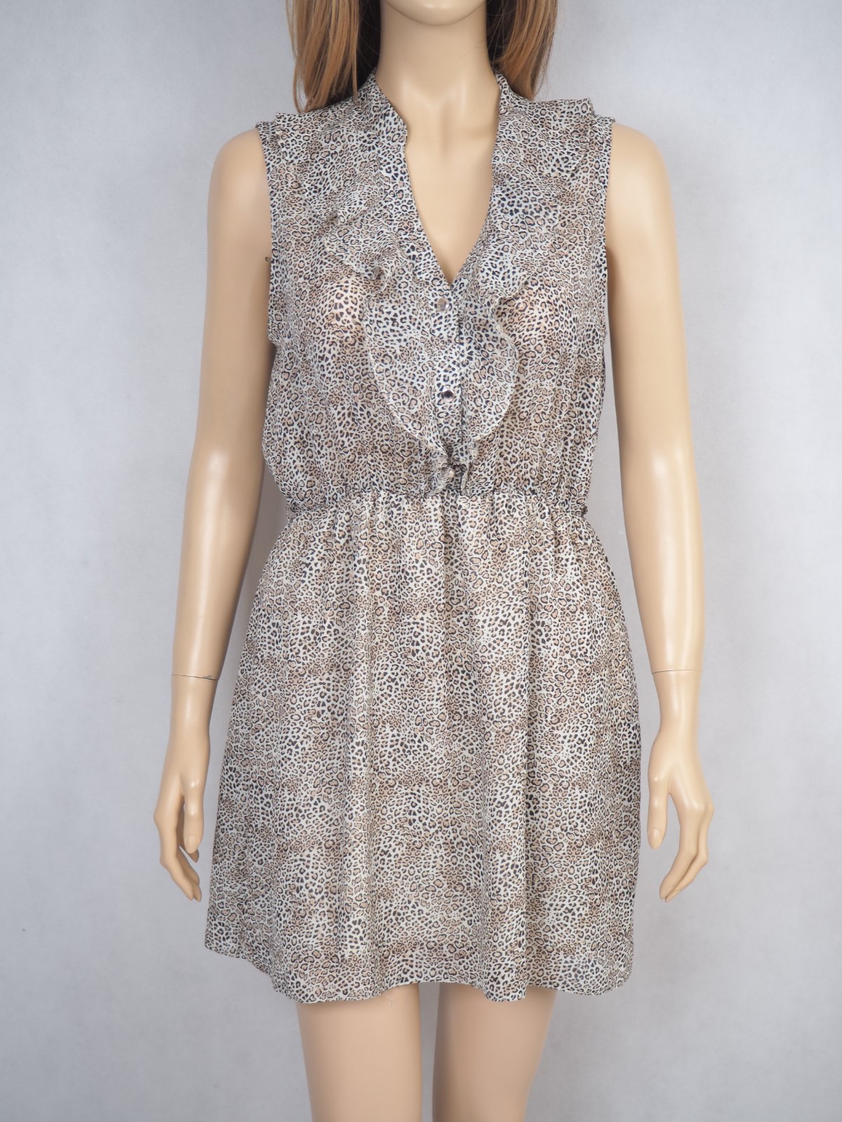 Kvalitné letné šaty béžovej farby s potlačou, vpredu zapínanie na gombíky, sukňová časť podšitá, materiál 100% polyester, super stav.