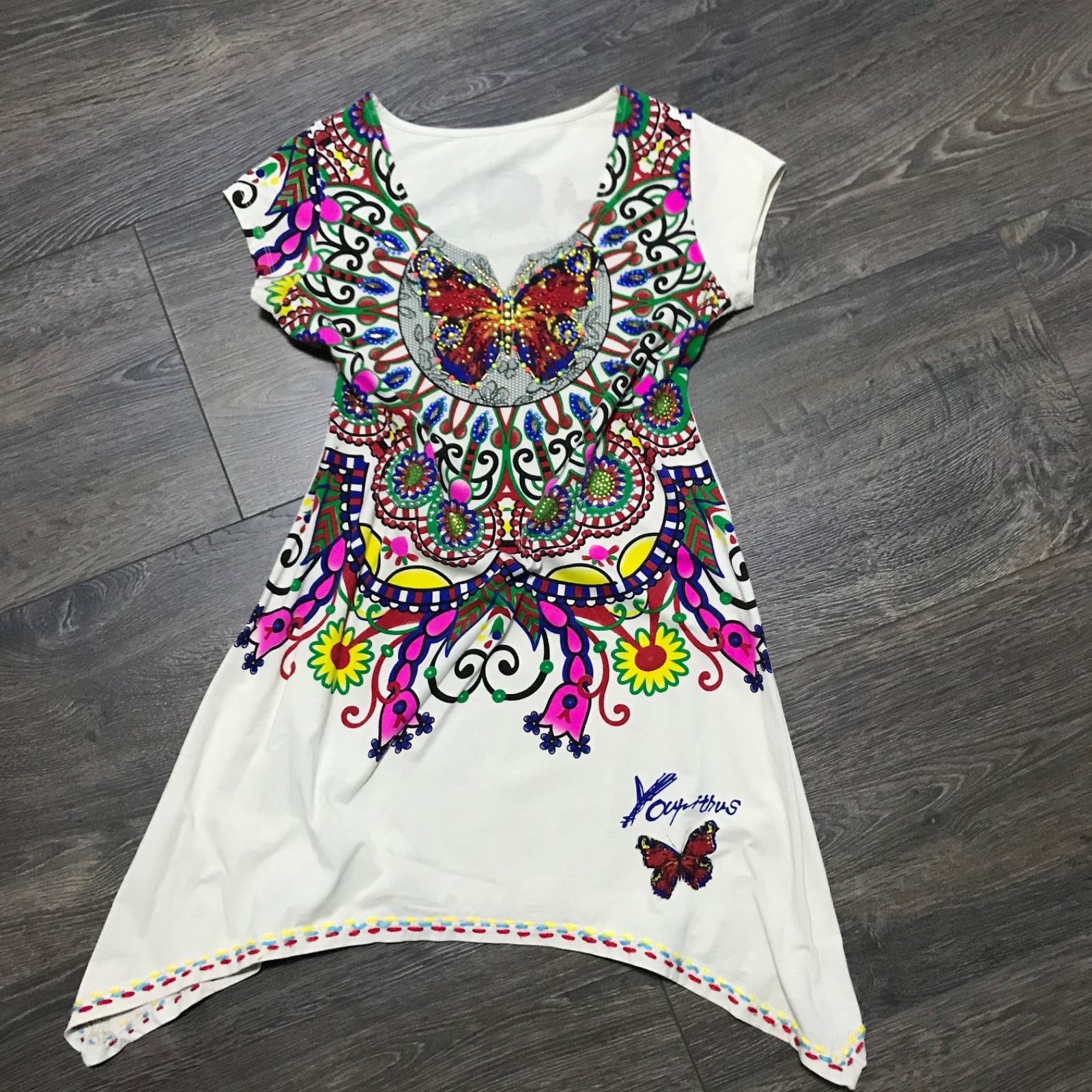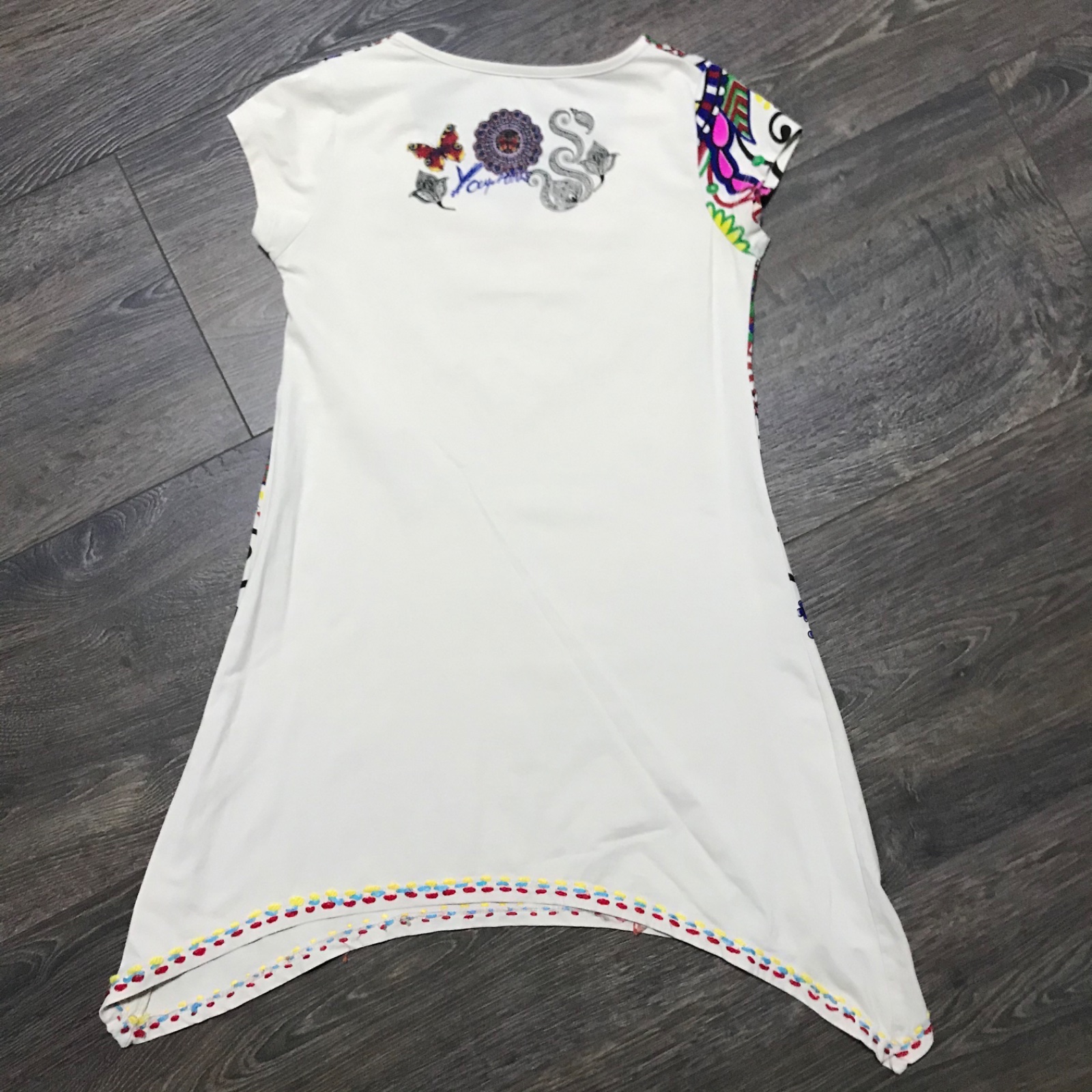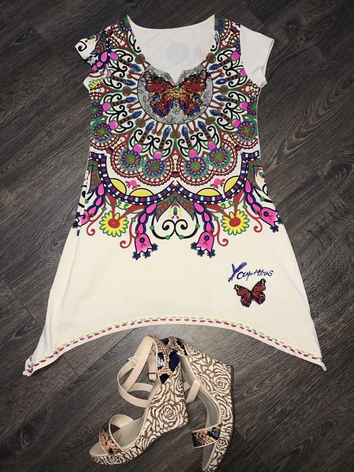 Predám nádhernú tuniku, ktorá sa dá nosiť aj ako kratšie šaty. Krásne detaily, zdobené korálkami, na štýl značky Desigual. Veľkosť UNI. Len opraná a skladovaná.