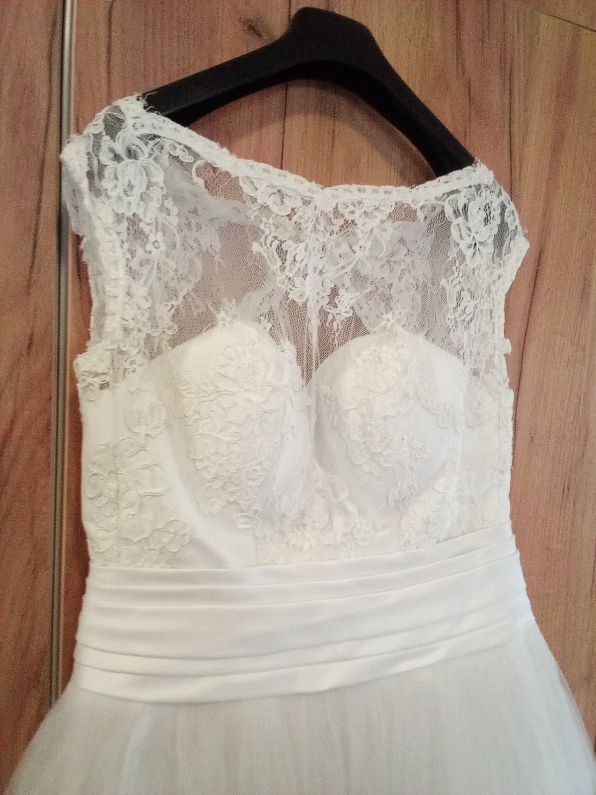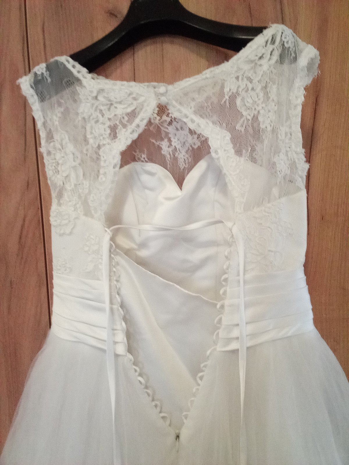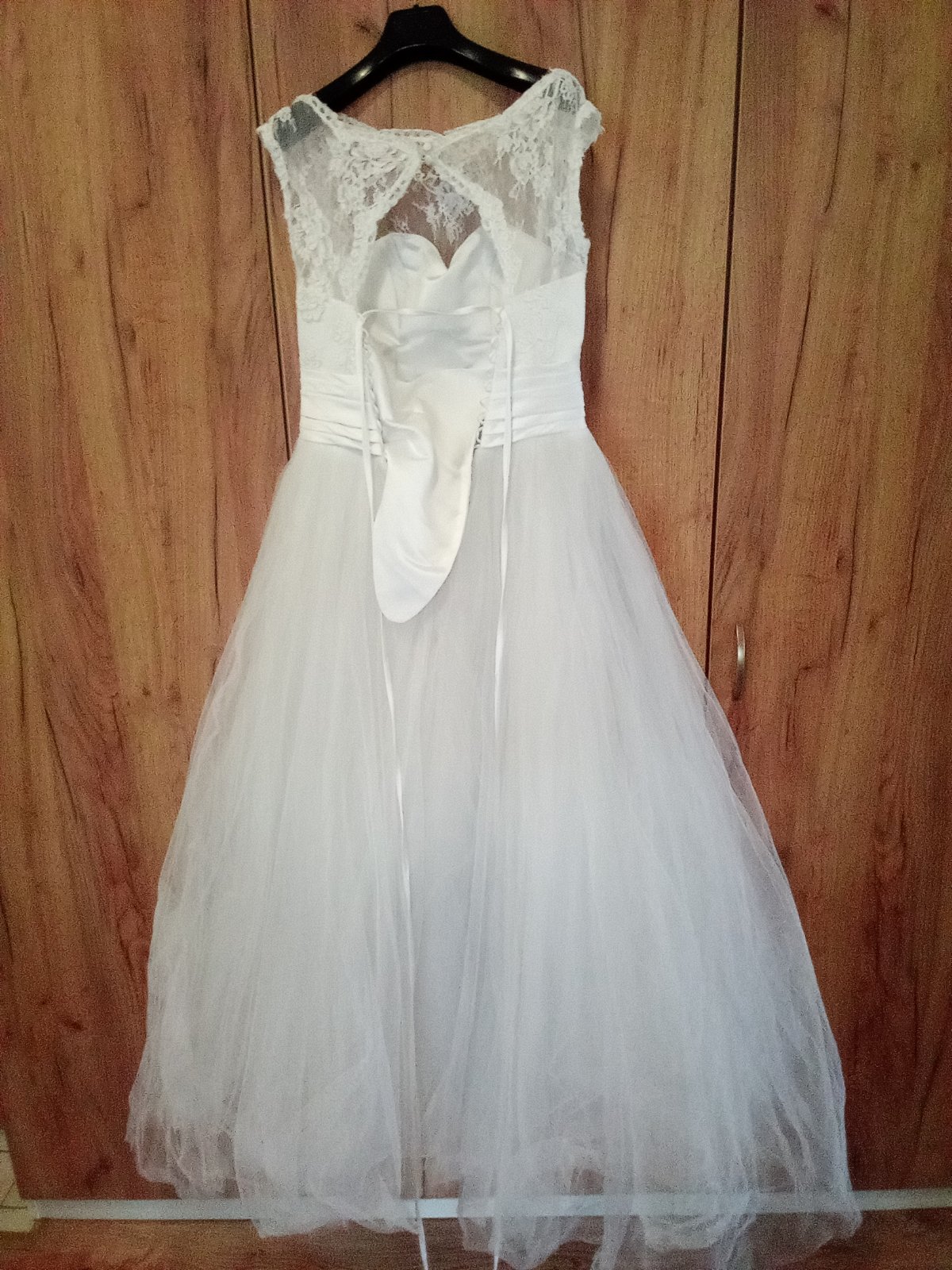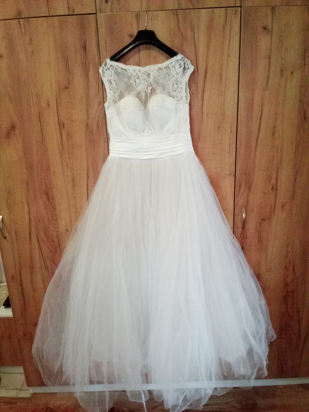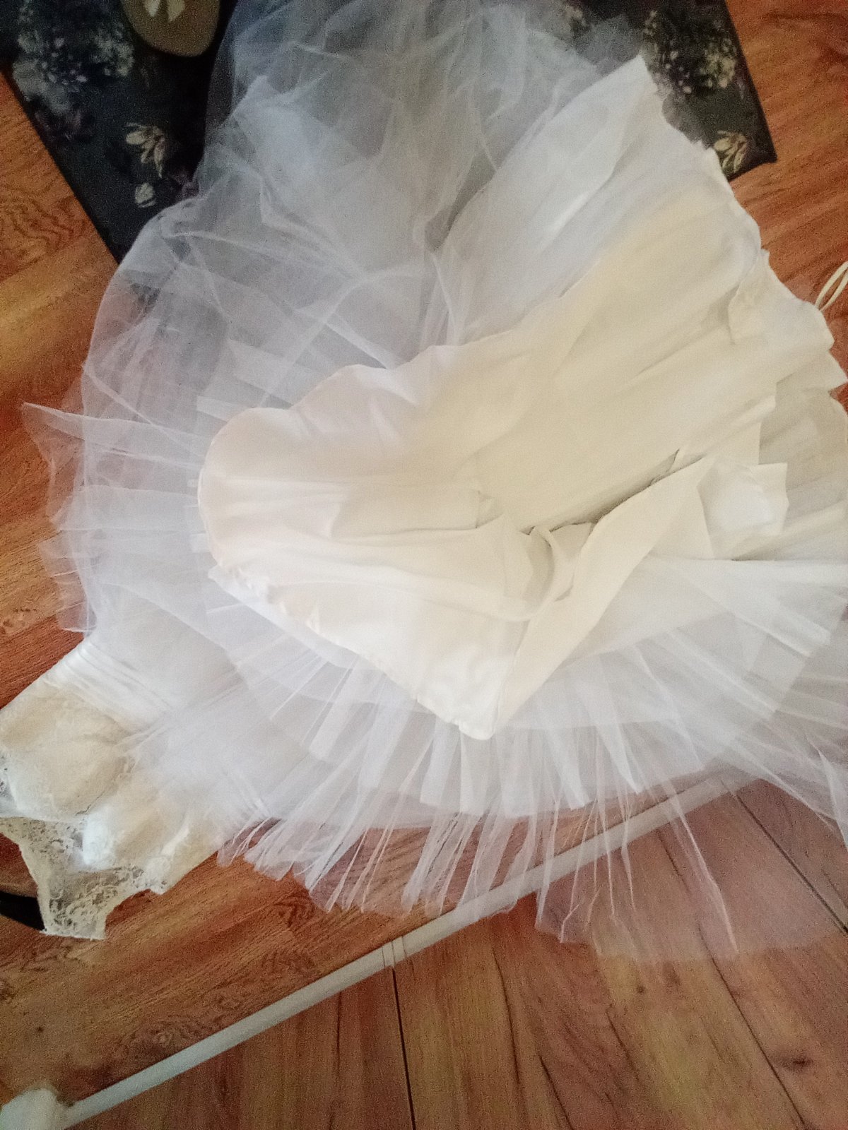 Svadobné šaty biele..... rám..... 42 cm....... pás... 42 cm...... p. p...... 42 cm..... dĺžka........ 145 cm..... 6 vrstiev sukniciek .