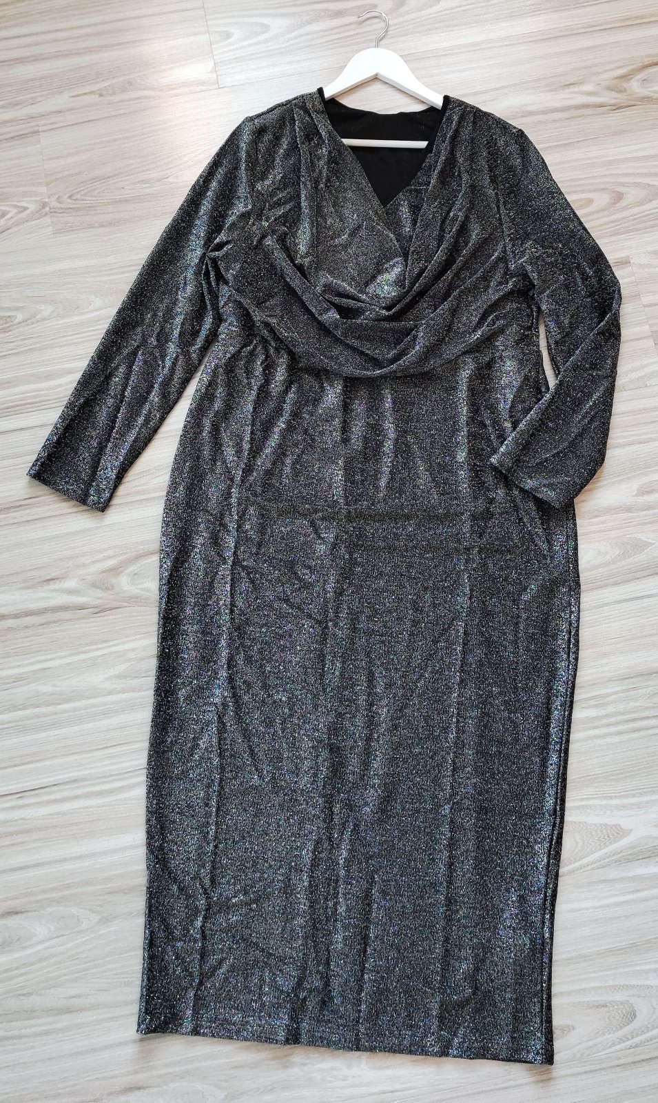 Krásne trblietavé šaty vo veľkosti 3XL, majú dieru na pravej ruke, skoro pri pazuche, treba si to len zošiť, viď foto. Prikladám rovno aj miery šiat: prsia šírka 53-66, pás šírka 48-59, boky šírka 58-70, dĺžka 129, rukáv dĺžka 61. Šaty sú veľmi elastické, preto väčšie miery sú reálnejšie.