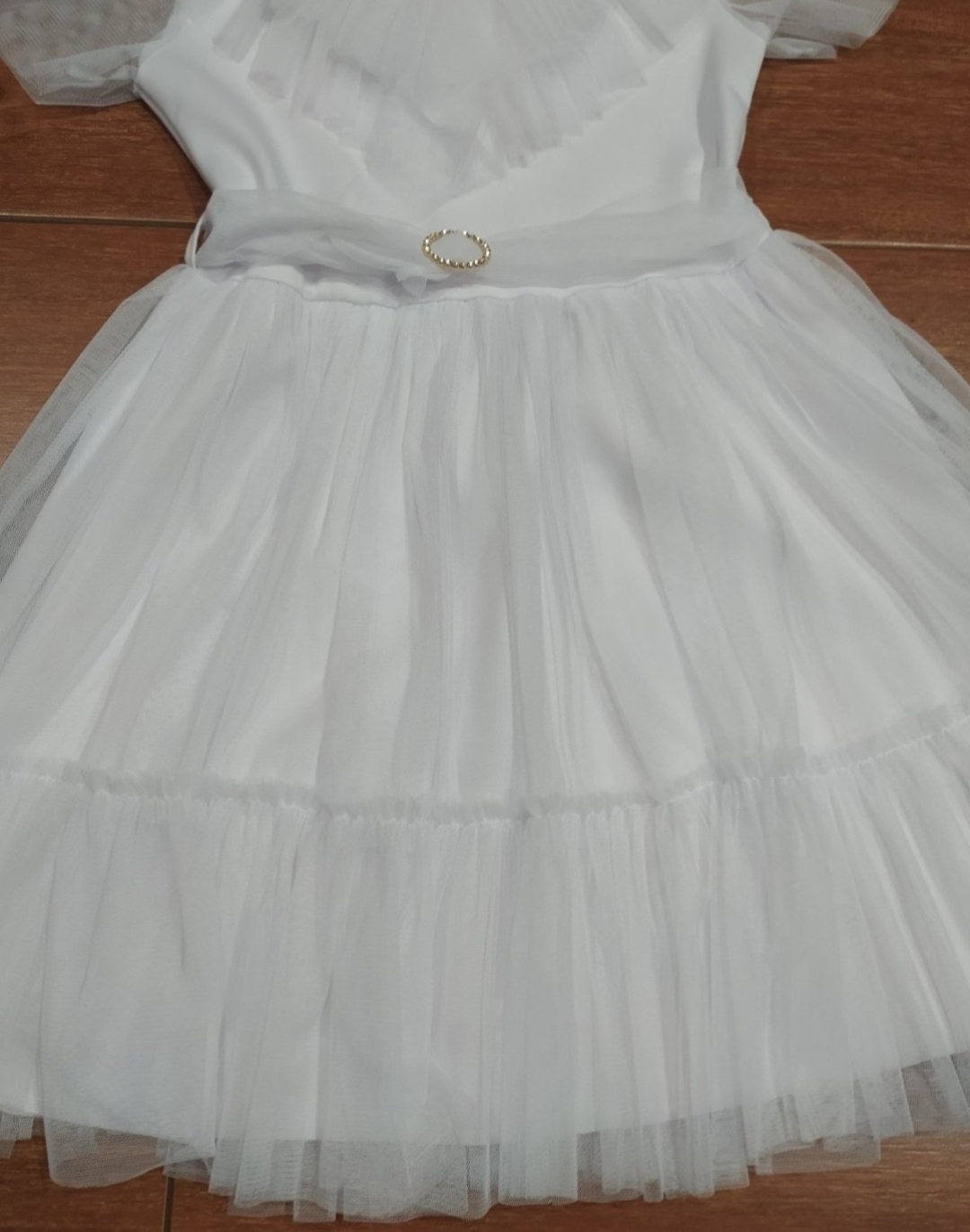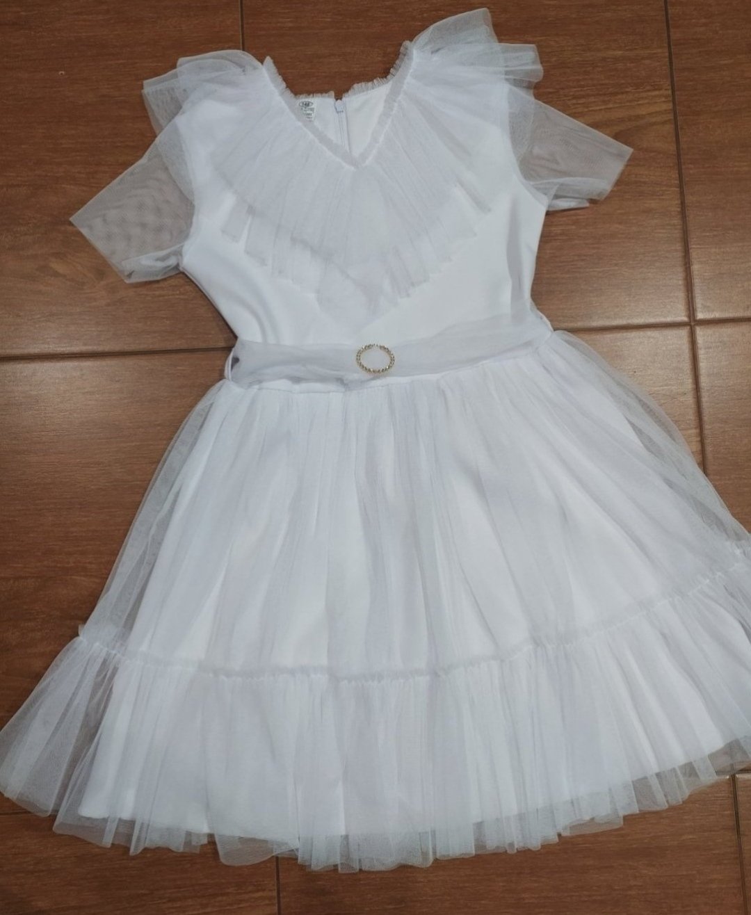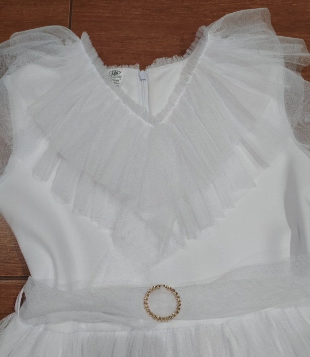 Krásne jemné šaty na slávnostnú príležitosť..Veľ.152 podľa mňa o niečo menšie,nositeľné už od 140.Raz vzaté.Vrchný diel s jemnými miniflitríkmi.PC 60€ v zľave. Vhodné na svadbu,narodeniny,fotenie,1...