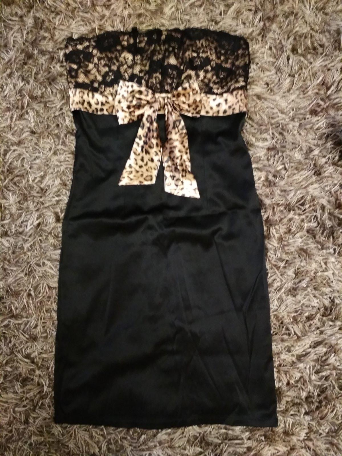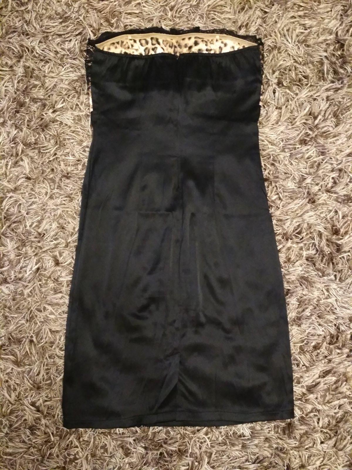 Iba raz použité, krásne čierne šaty. Bez ramienok. Vrchná časť čipka, spodná časť šifon so spodničkou. Celková dĺžka 74 cm. Veľkosť M. Vzadu na chrbte vykrojeny chrbát.