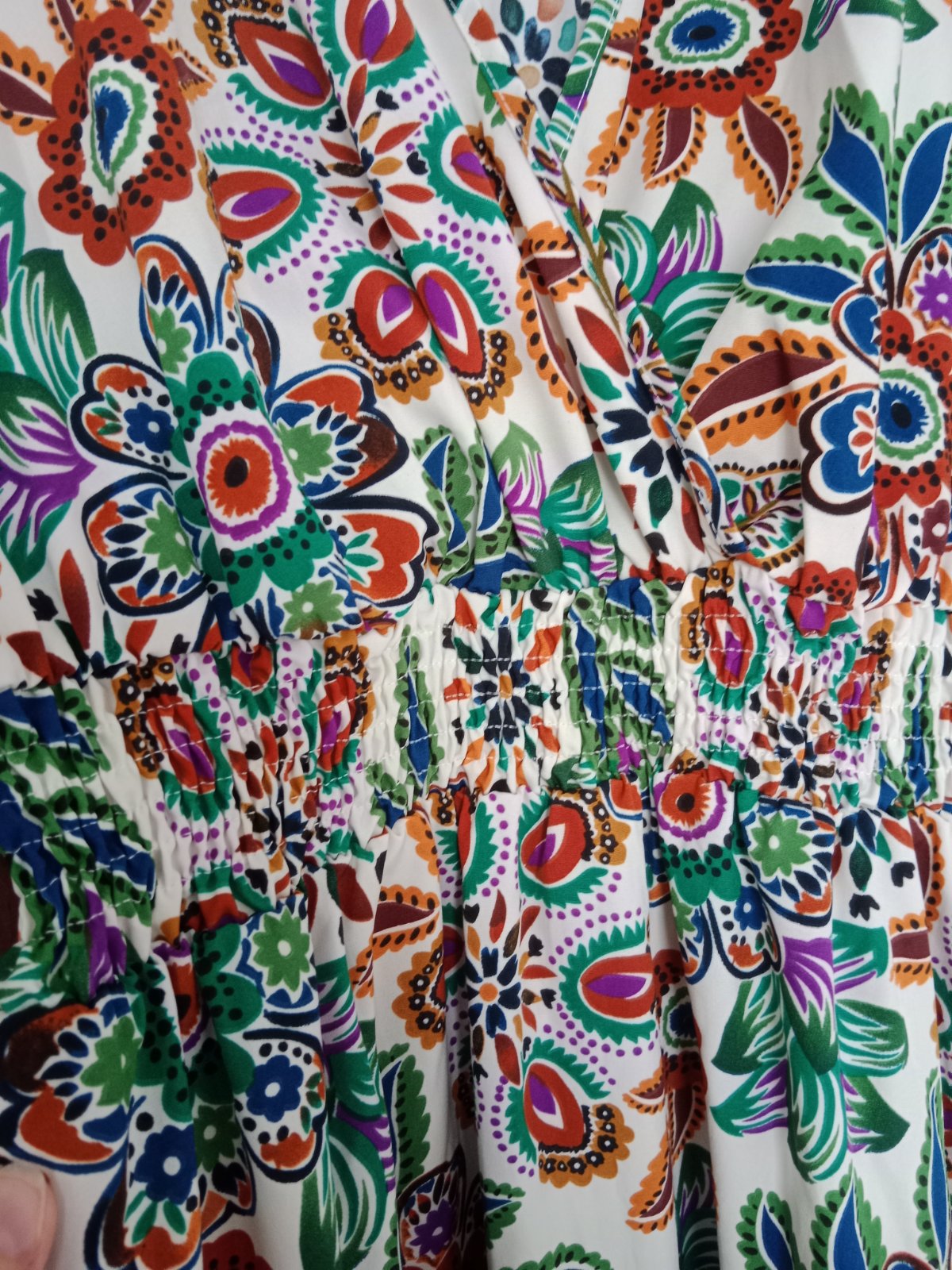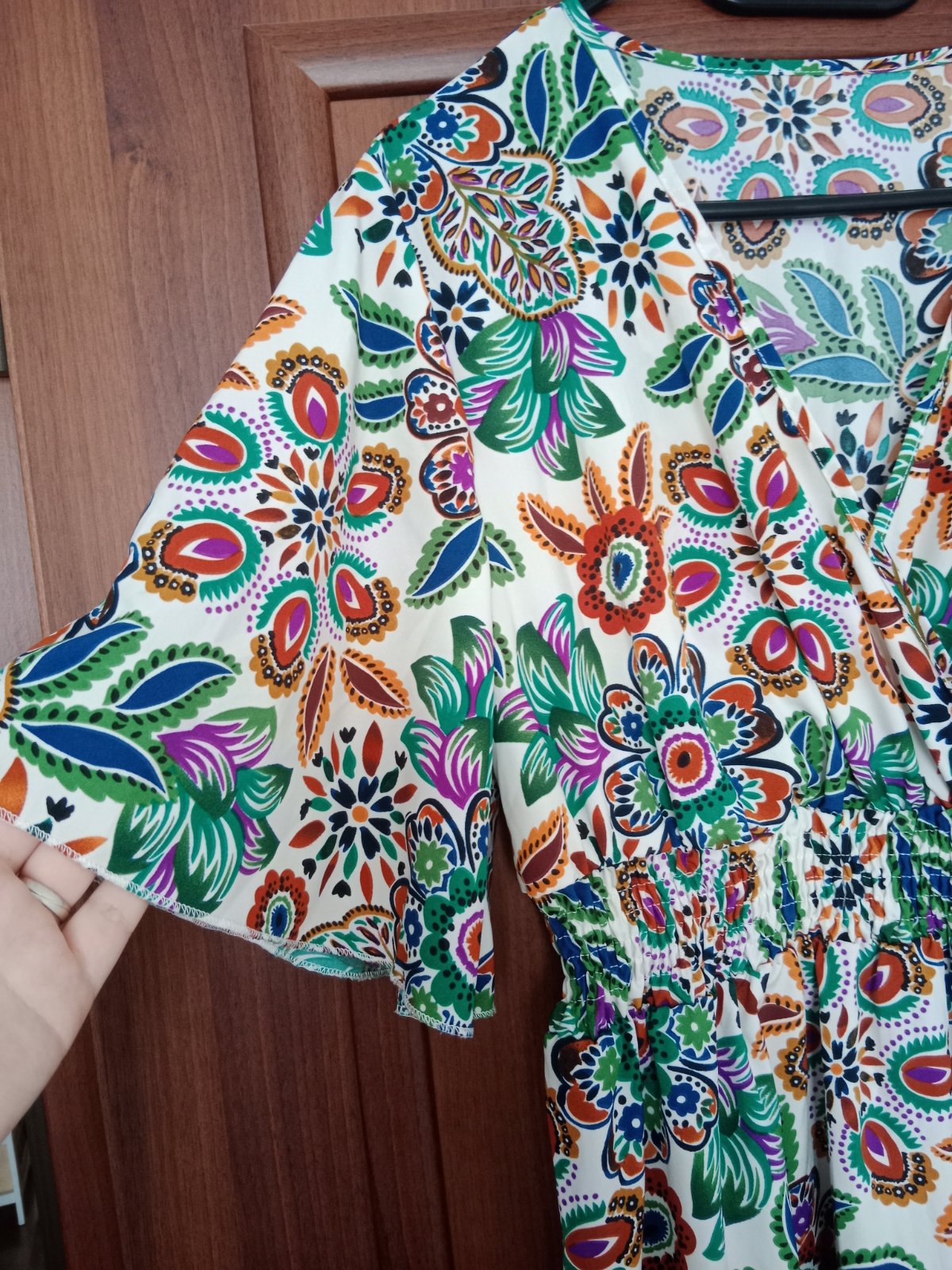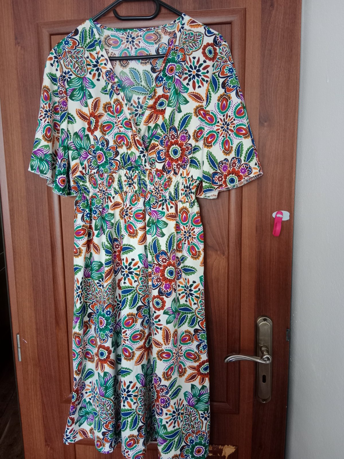Kúpené z druhej ruky, nesadli mi. Rozmery sú nafotené. Rozmer cez prsia sa nedá lepšie odfotiť, je to tam mierne nazbierkané, takže rozmer je väčší. V páse je hrubšia gumička, ktorá sa natiahne. Bez poškodenia, top stav. Vhodné na bežné aj na príležitostné nosenie.