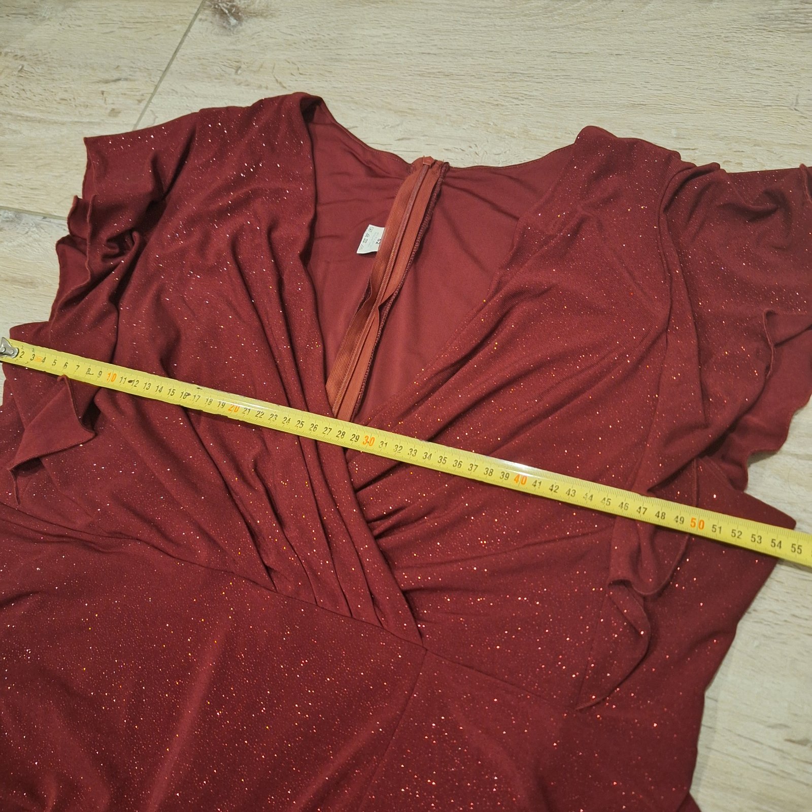 Krasne a pohodlne dlhe saty s trblietkami, velmi kvalitné, trblietky vôbec neodpadavaju. Raz oblecene na svadbe. Velkost 52. Elastické, vinovocervenej farby, s rozparkom. Jednoduchý strih a pritom su velmi štýlové.