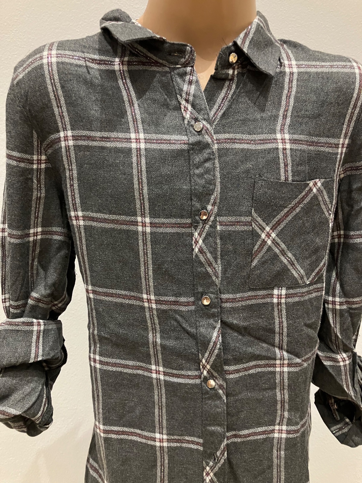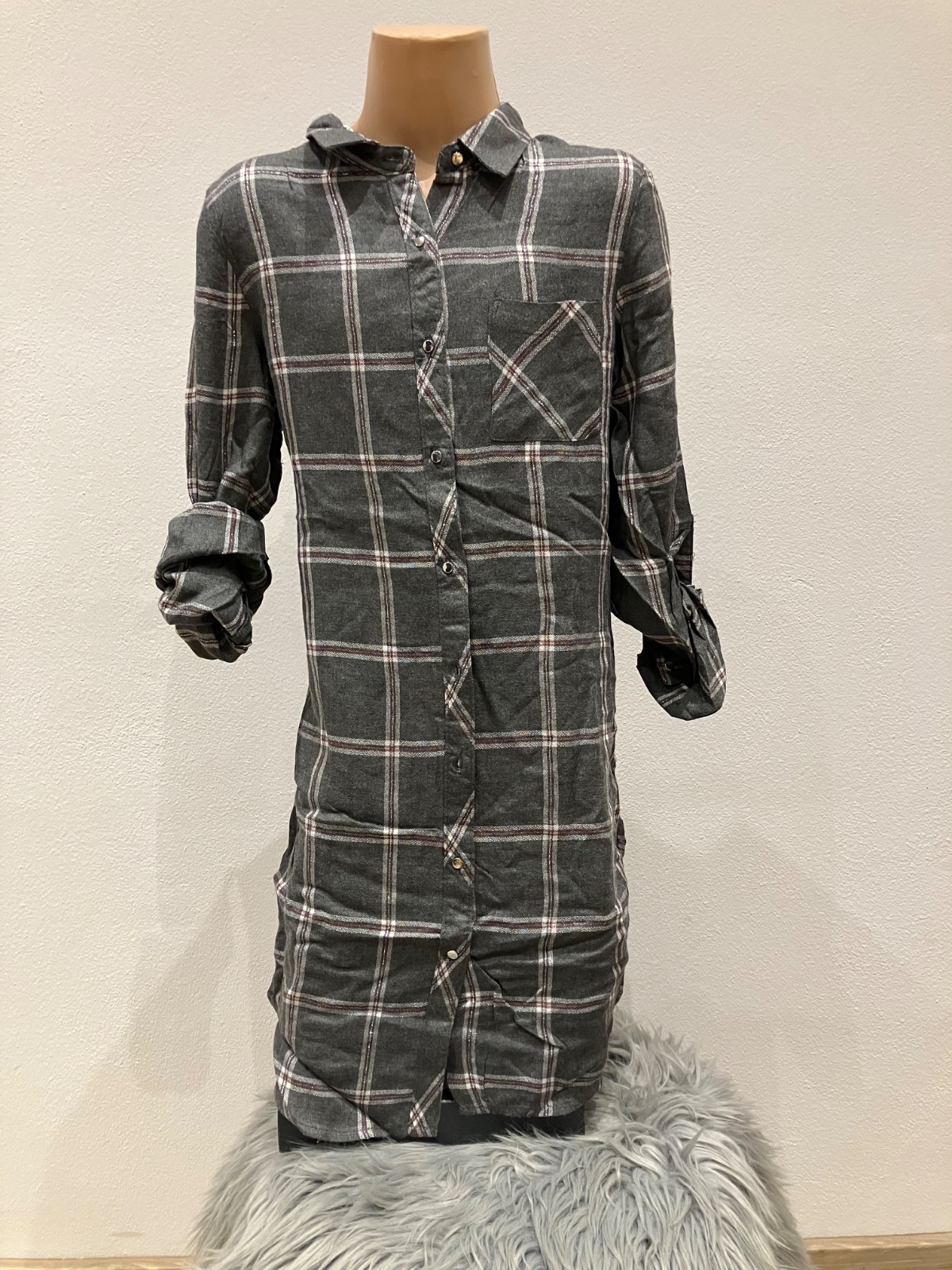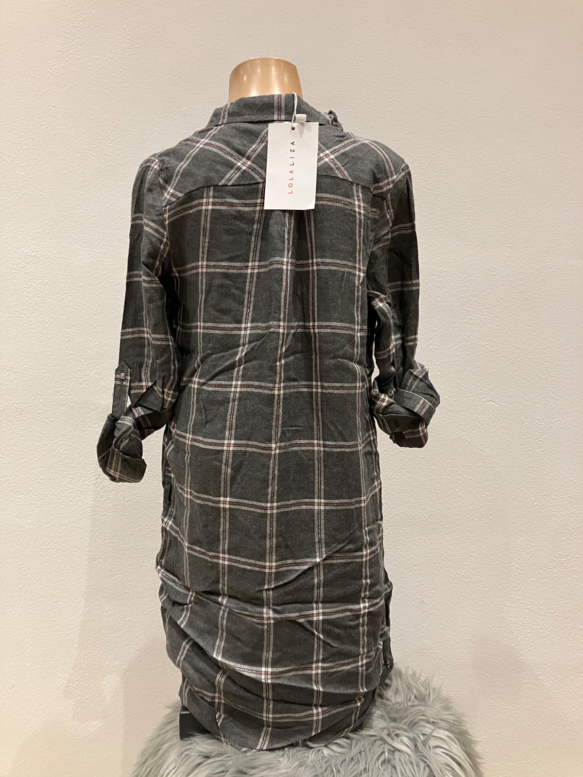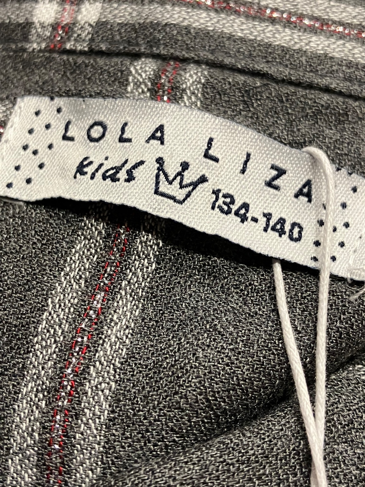 Dievčenské tenké košeľové šaty s roll-up rukávmi Lola Liza, kockované, klasický golier, zapínanie na gombíky (malé strieborné), dvojité číslovanie 134-140, materiál: 100%viskóza. Farba: tmavosivá so striebornou niťou Bez opasku!