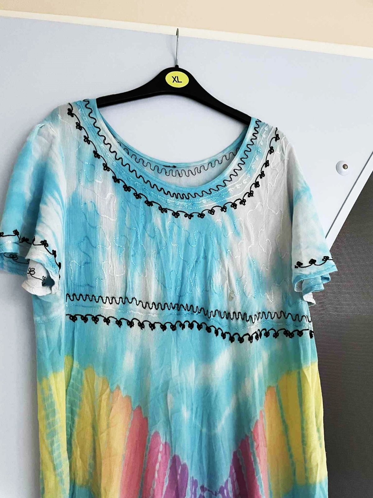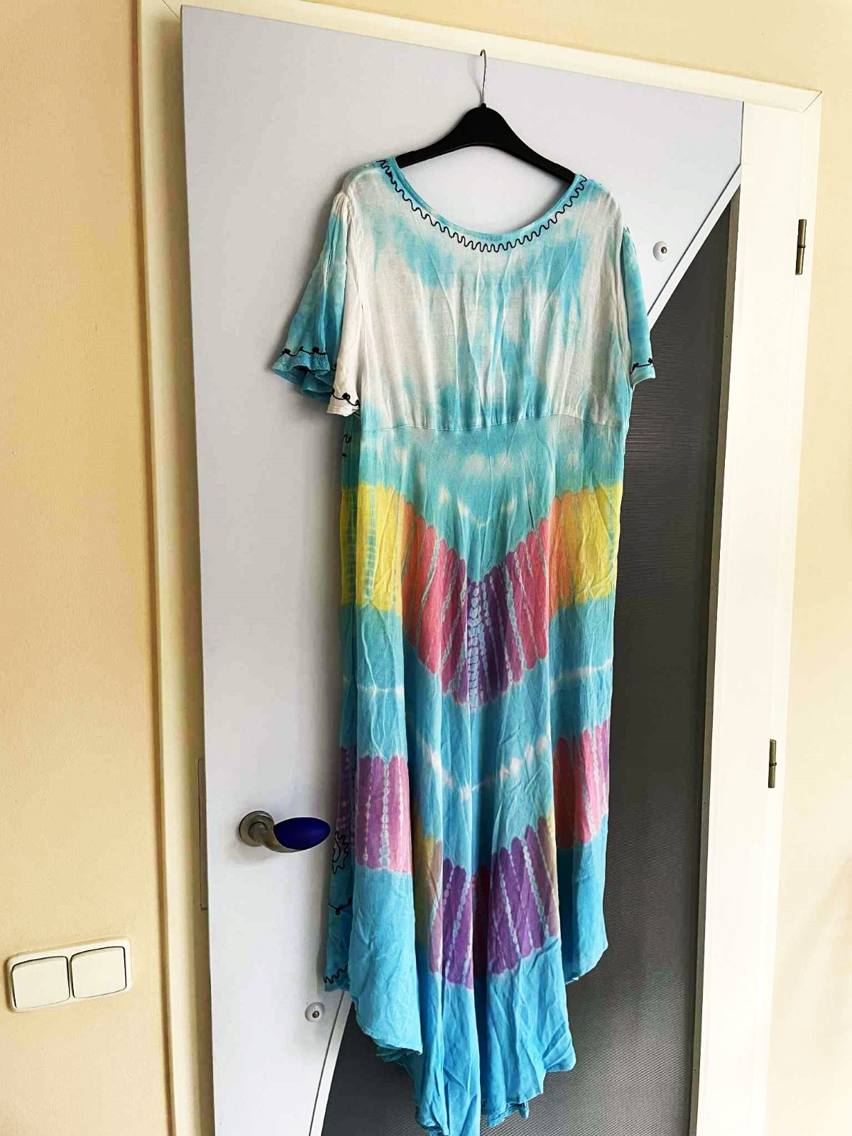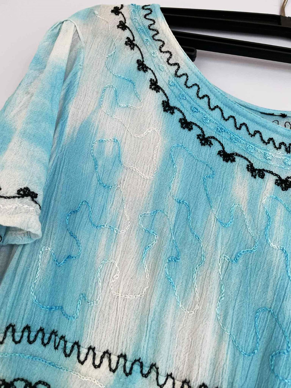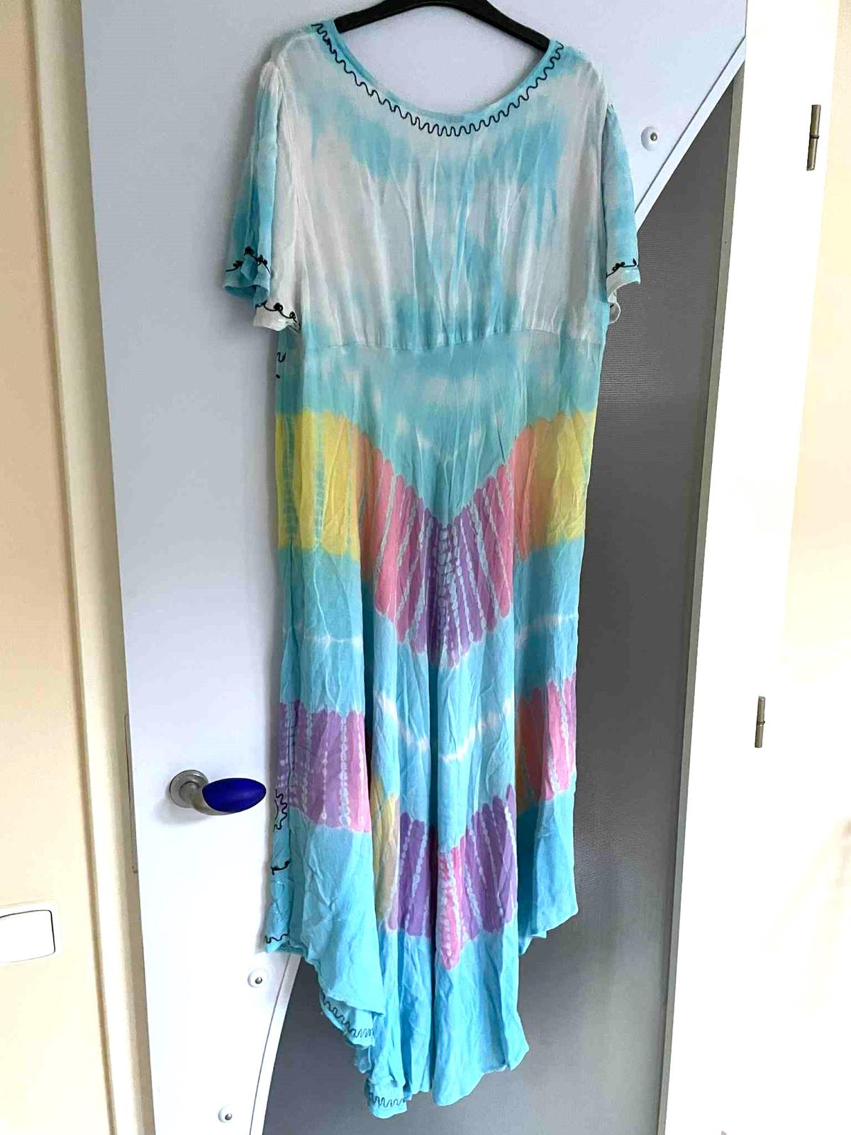 krásne neznosené zaujímavé etno maxi šaty z tenučkej bavlny,pekné letné farby - batikovaný materiál,super na dovolenky,na pláž ale aj inak,výborná údržba,nosia sa jemne vykrčené,tkaná tenučá indická bavlna,nosia sa ako over size,pekne sedia od L - XXL veľkosť,dlžka celkom na boku = 111 cm, v strede - cíp = 135 cm, šírka meraná pod pazuchou - obvod prsia = max 65/66 x 2 cm,dlžka meraná na boku od pazuchy smerom dolu = 80 cm