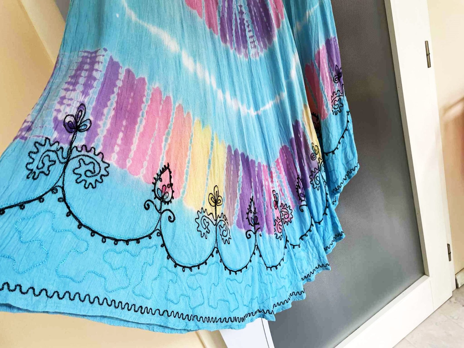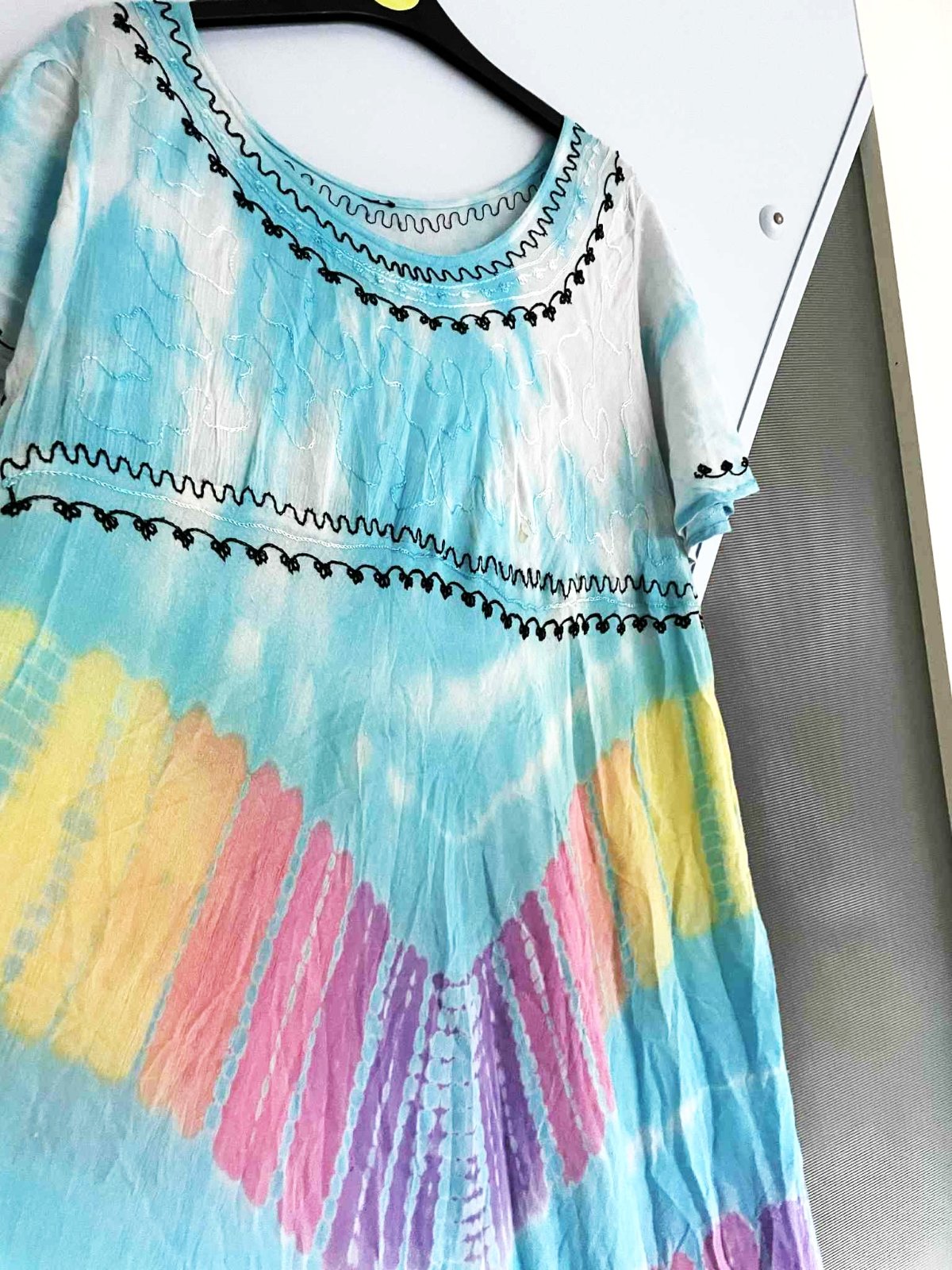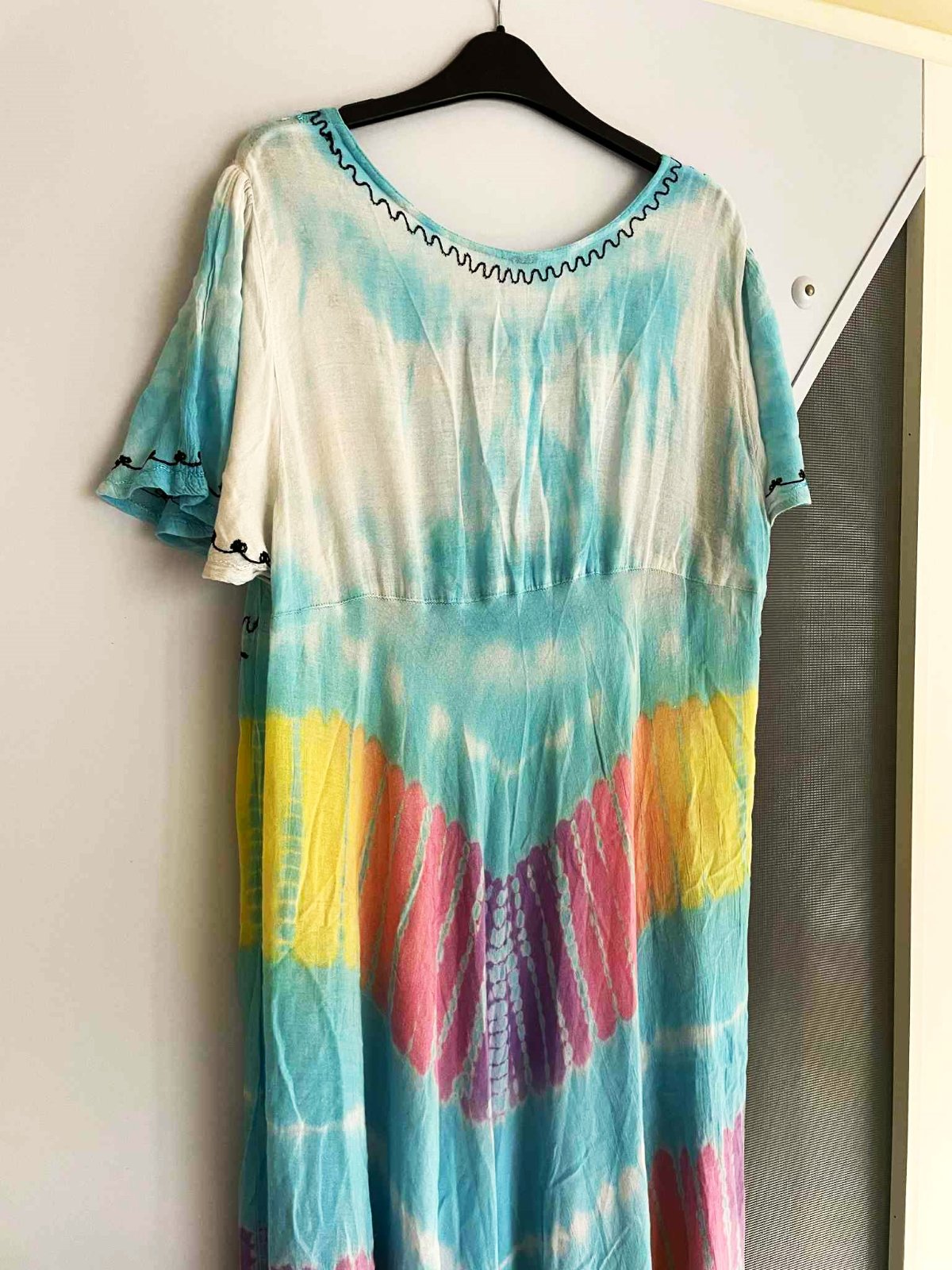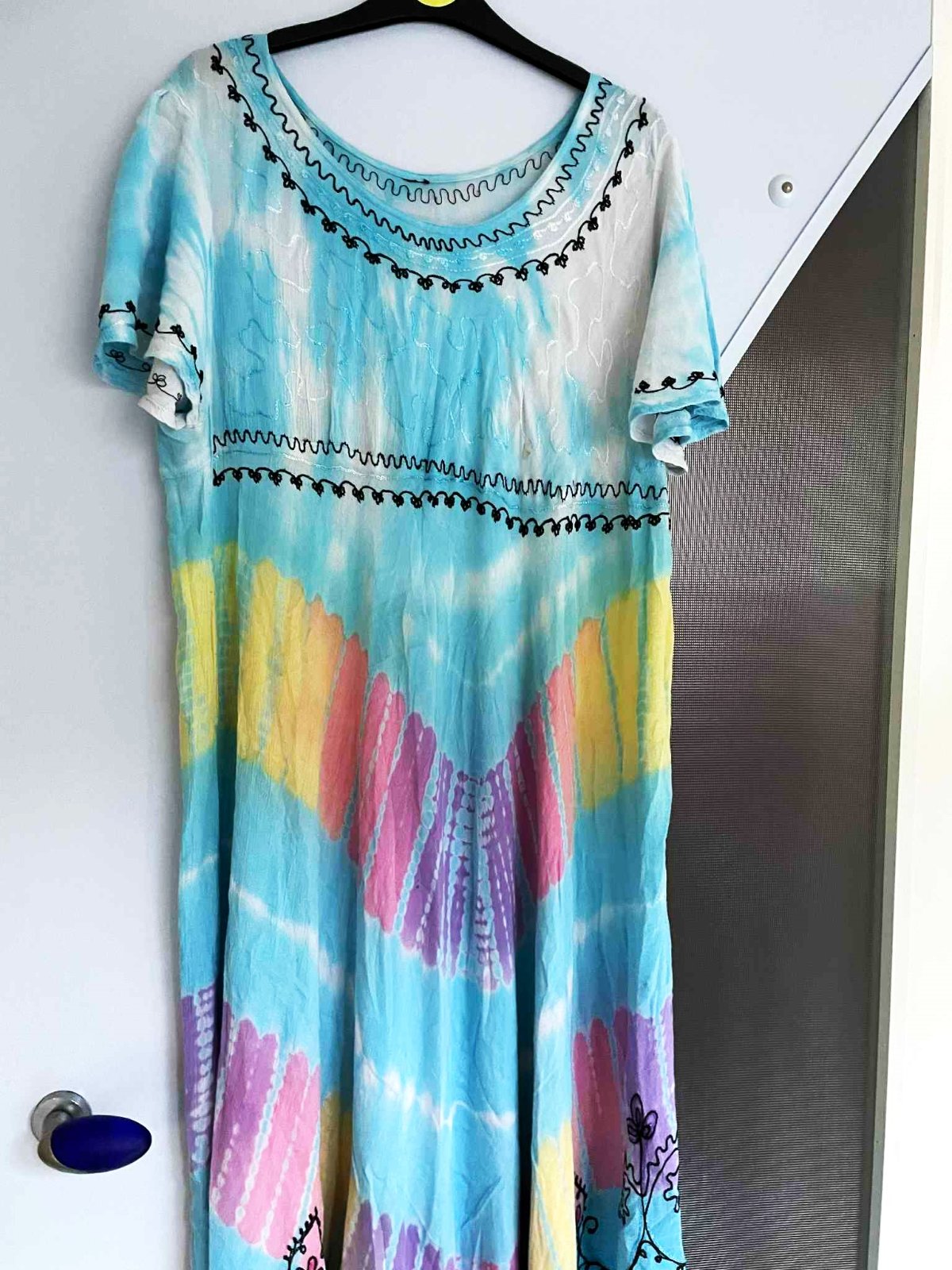 krásne neznosené zaujímavé etno maxi šaty z tenučkej bavlny,pekné letné farby - batikovaný materiál,super na dovolenky,na pláž ale aj inak,výborná údržba,nosia sa jemne vykrčené,tkaná tenučá indická bavlna,nosia sa ako over size,pekne sedia od L - XXL veľkosť,dlžka celkom na boku = 111 cm, v strede - cíp = 135 cm, šírka meraná pod pazuchou - obvod prsia = max 65/66 x 2 cm,dlžka meraná na boku od pazuchy smerom dolu = 80 cm