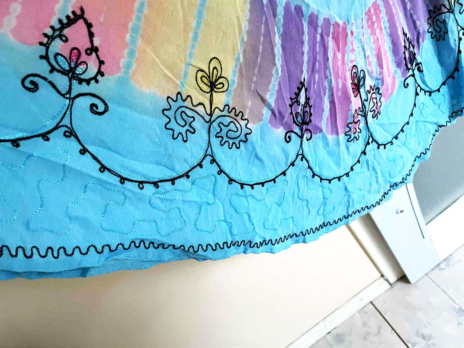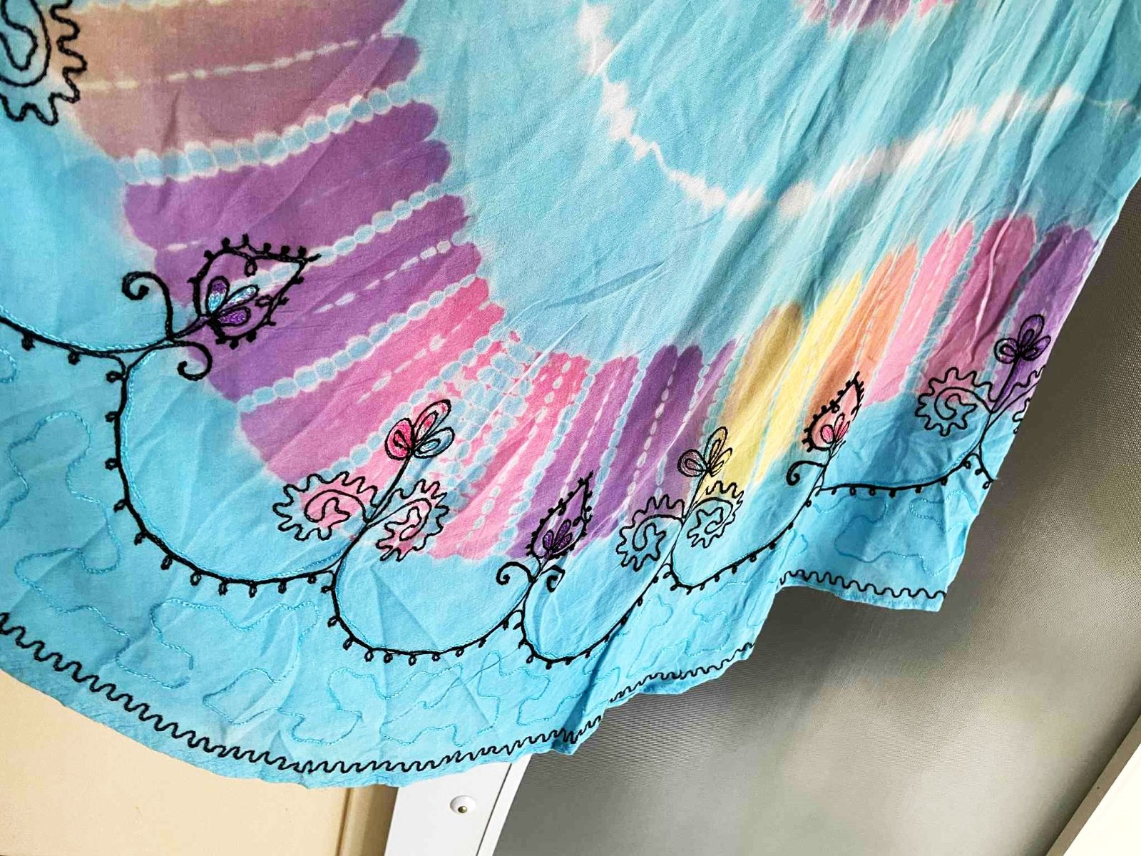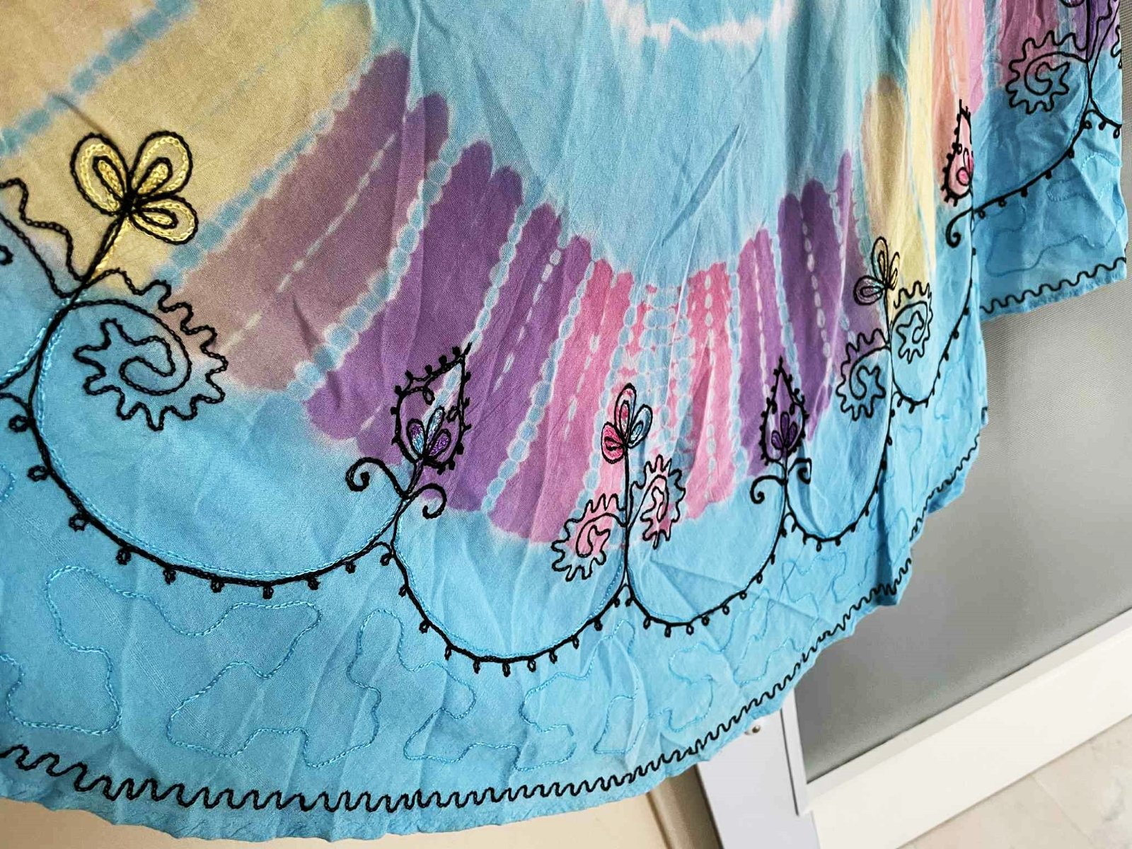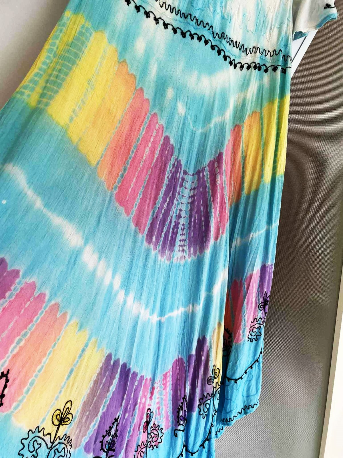 krásne neznosené zaujímavé etno maxi šaty z tenučkej bavlny,pekné letné farby - batikovaný materiál,super na dovolenky,na pláž ale aj inak,výborná údržba,nosia sa jemne vykrčené,tkaná tenučá indická bavlna,nosia sa ako over size,pekne sedia od L - XXL veľkosť,dlžka celkom na boku = 111 cm, v strede - cíp = 135 cm, šírka meraná pod pazuchou - obvod prsia = max 65/66 x 2 cm,dlžka meraná na boku od pazuchy smerom dolu = 80 cm