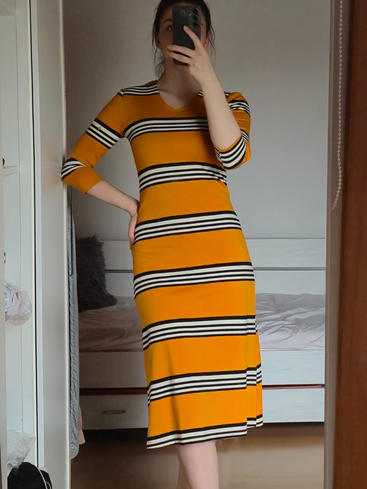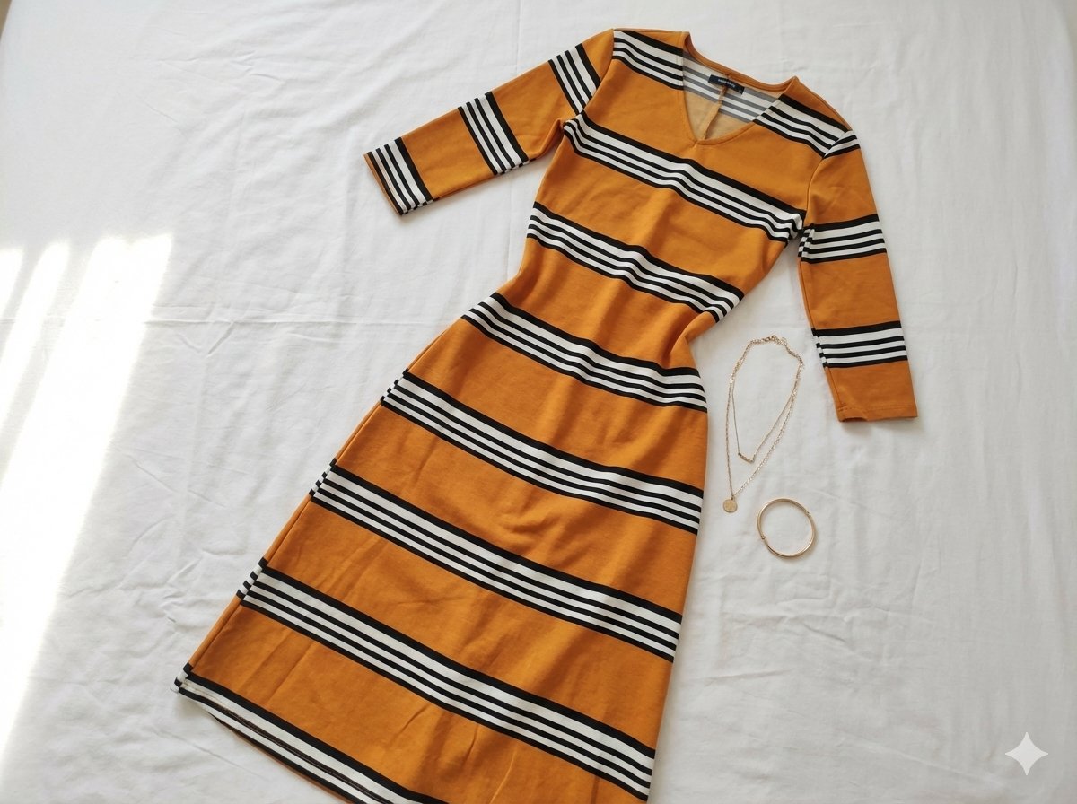 Farba/Vzor: horčicová oranžová, čierno-biele pásiky, pásikavý vzor.