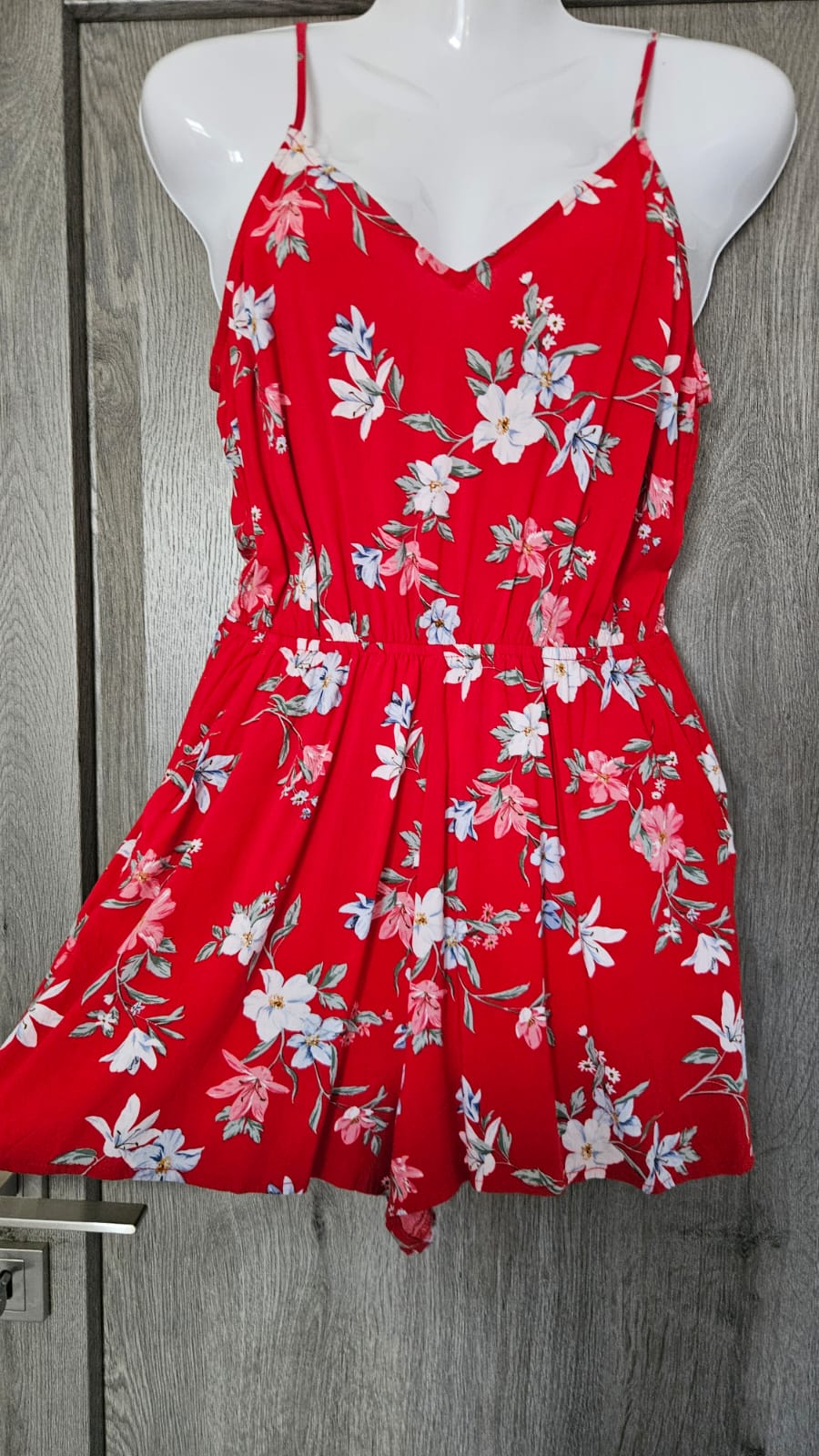 Šaty sú v super stave. Veľkostne sadnú na S-M. Cez prsia 37cm, dlhé 88 (ramienka nastaviteľné). Štítok som odstrihla, ale materiál je z väčšej časti bavlna, sú mierne elastické.