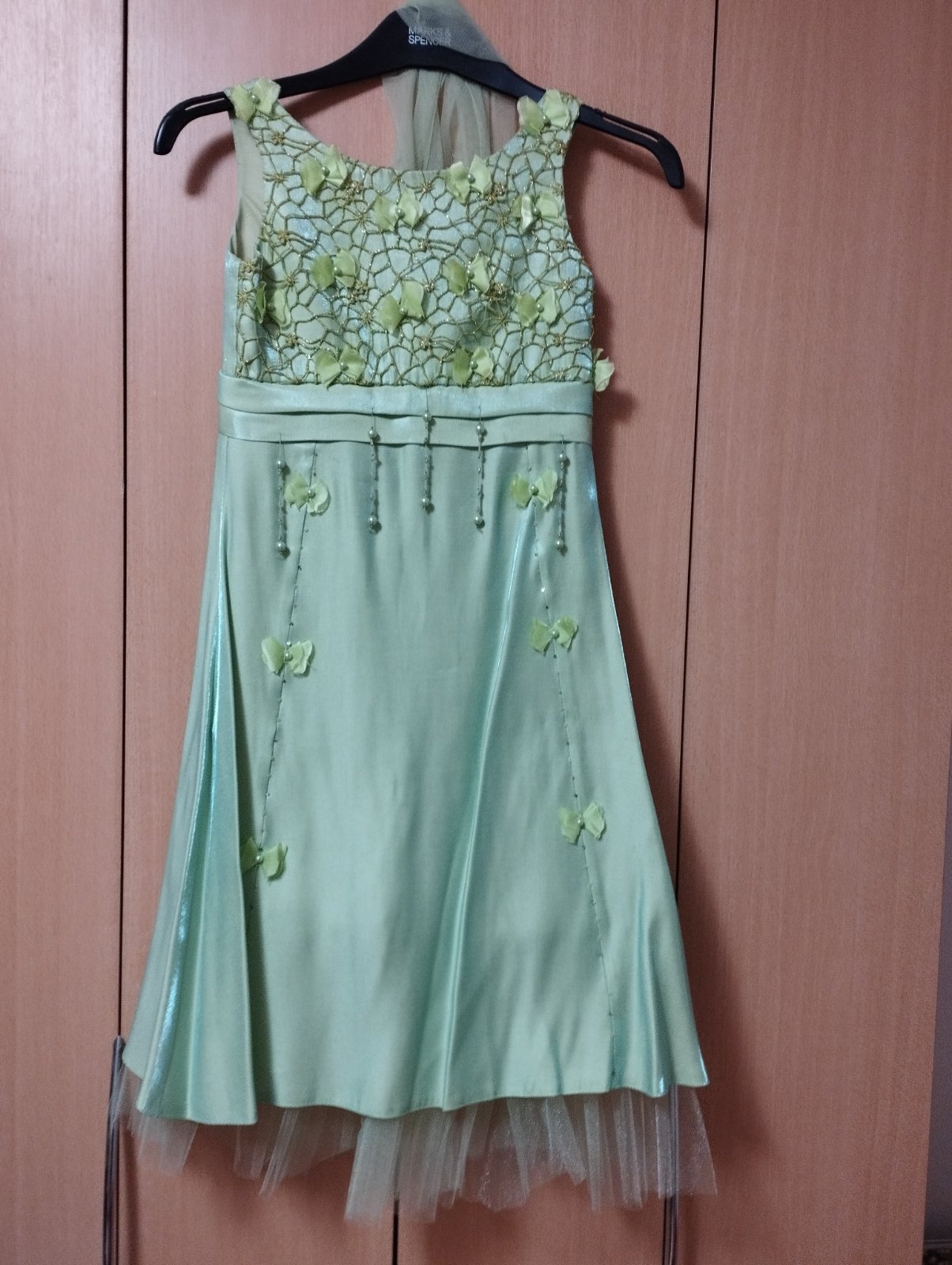 Krásne dievčenské šaty, bez poškodenia. K šatám je šalik s aplikáciami motýlikov. Farba jemná zelená. Poštovné podľa taríf.