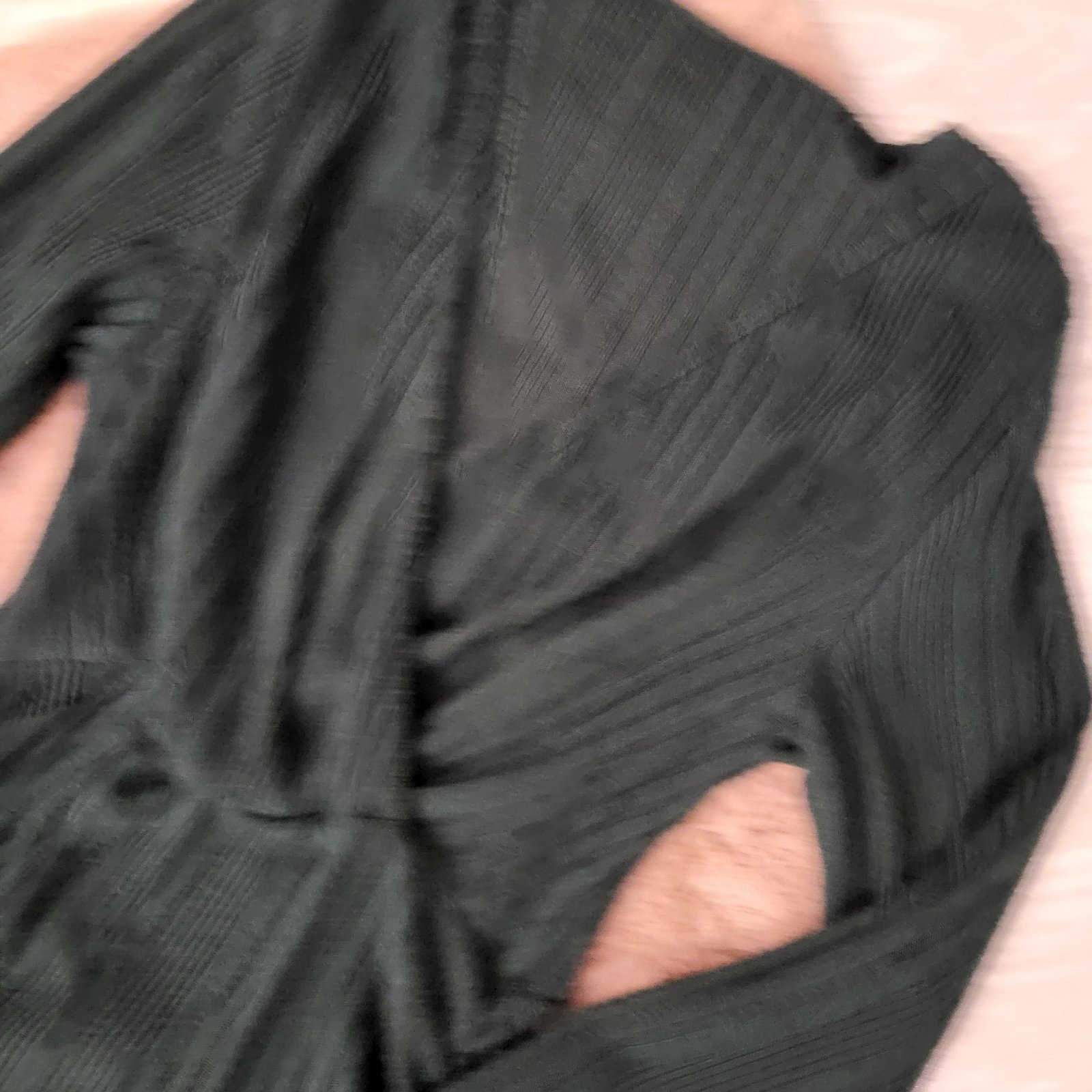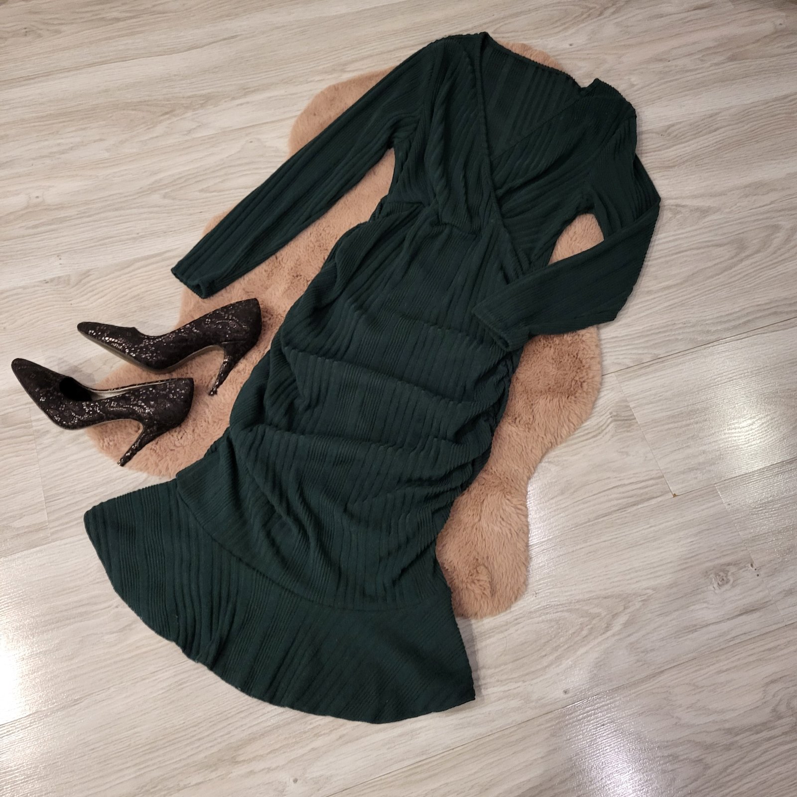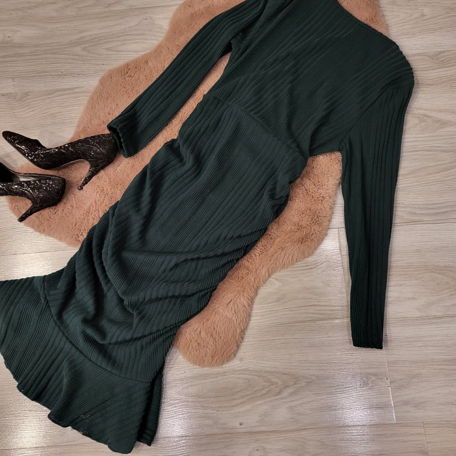 Svetrikove saty, tmavozelená farby, s prekladané vystrihom, veľmi ženský strih, zvyraznujuci ženskú siluetu. Veľkosť je uni (0XL).