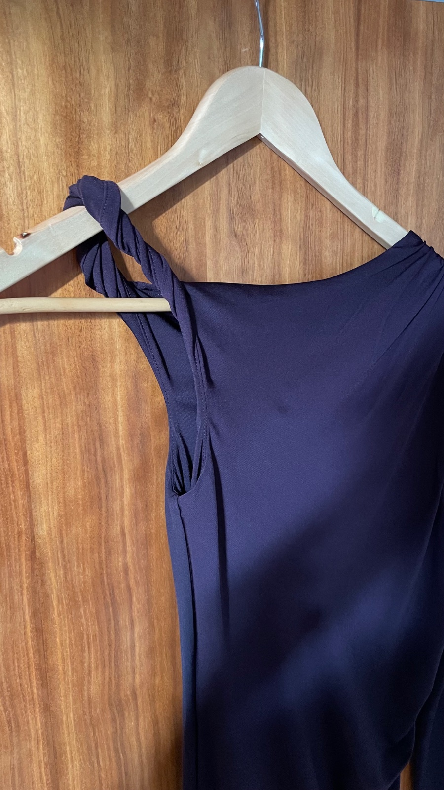 Predám tmavofialové šaty do pol lýtok s odhaleným plecom oblečené pri 1 príležitosti. Šaty sú priliehavého strihu s asymetrickým výstrihom, so skrúteným rukávovým dielom a s jedným dlhým rukávom. Zámiky na jednom pleci a na jednej strane na vytvorenie mierne nariaseného efektu. Podšitý diel cez prsia a chrbát.