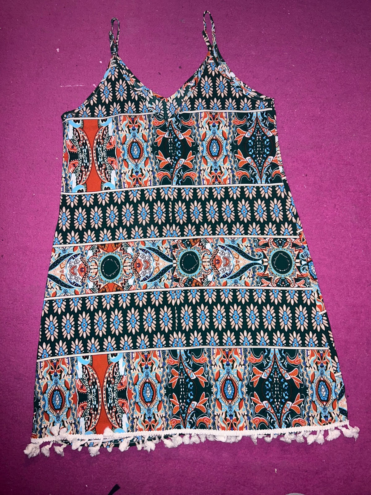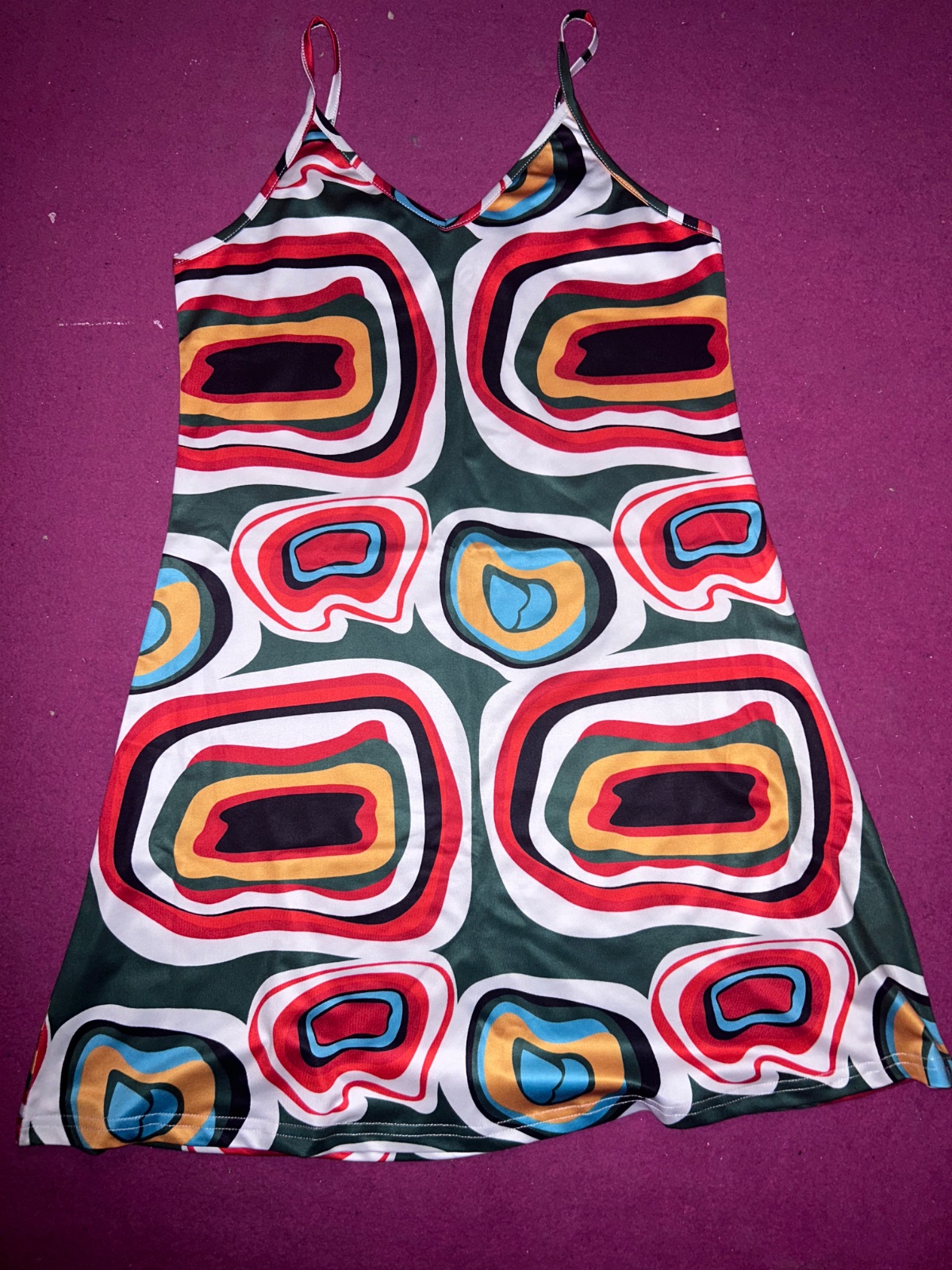 Bez poškodení, dĺžka 89cm, šírka cez prsia 42 cm, v páse gumička, elastický materiál, sedia na v. 36-38.