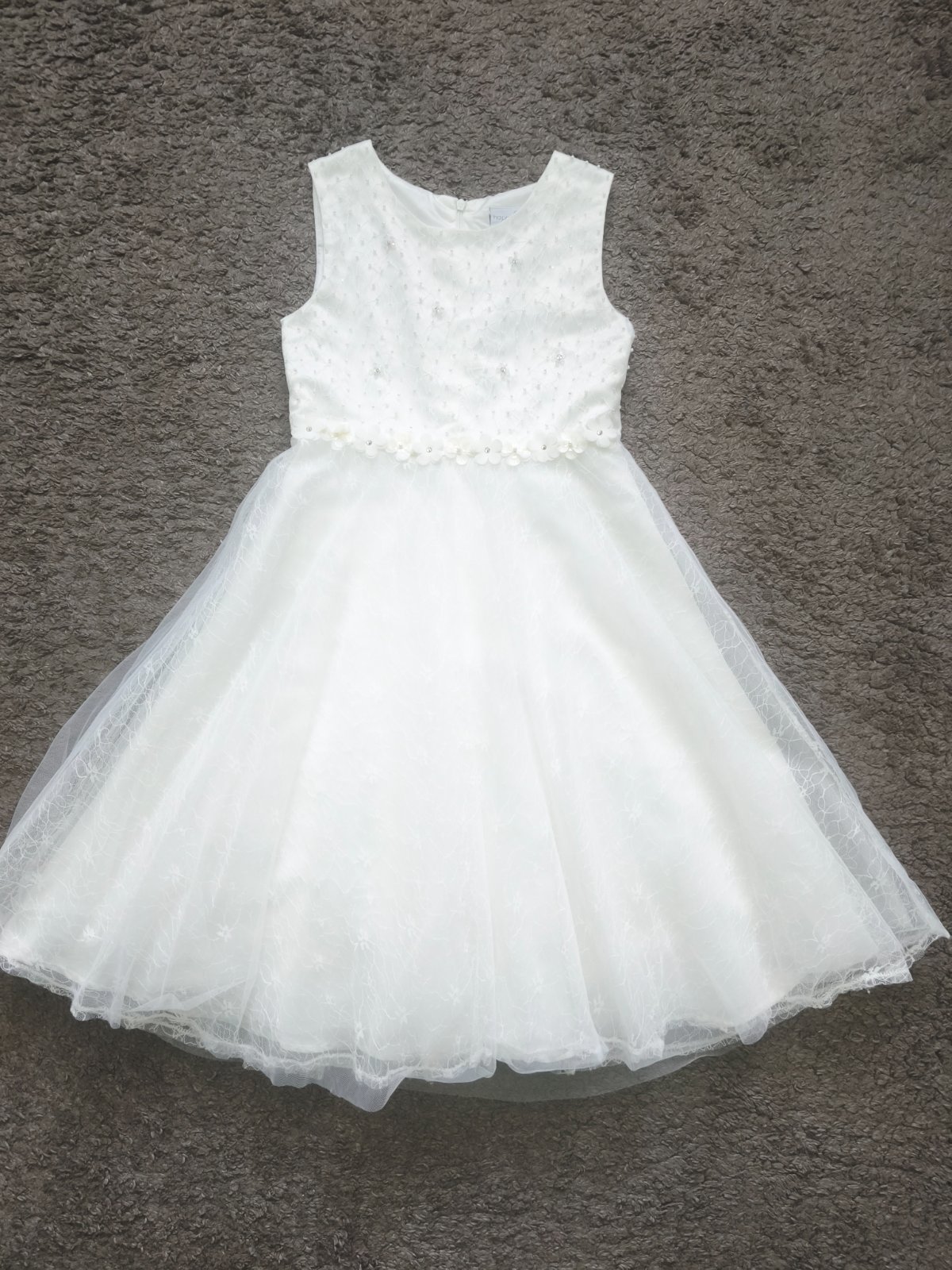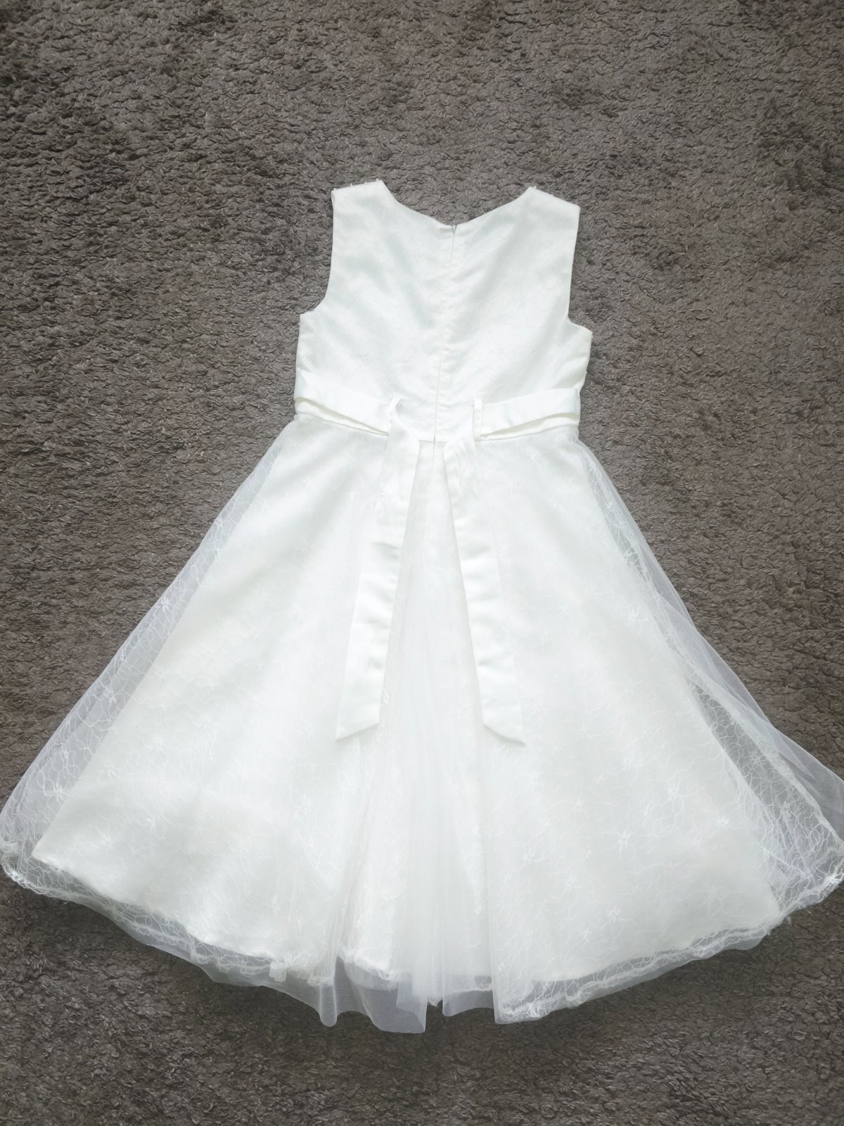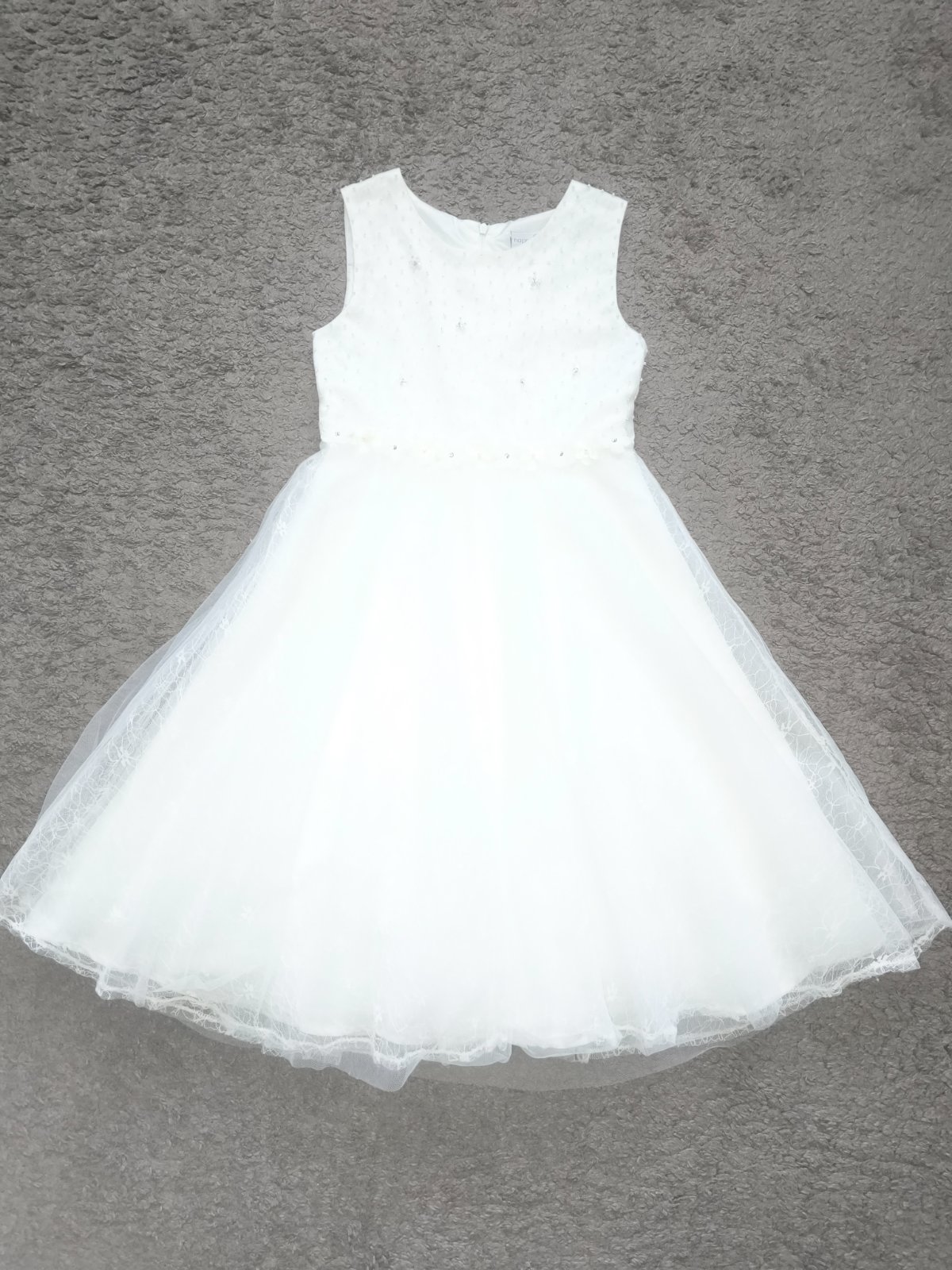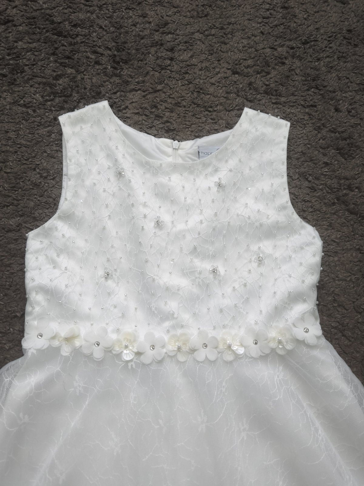 Predám krásne šaty pod kolená na 1.sv.prijmanie - použité boli raz. Značka Happy Girls z AboutYou. Vzadu skrytý zips a viazanie na mašľu. Celková dĺžka cca 82 CM (zle sa to meria tým že to má viacero vrstiev). Šírka pod pazuchami 34 CM. Cena je vrátane poštovného - ako balíček na poštu.