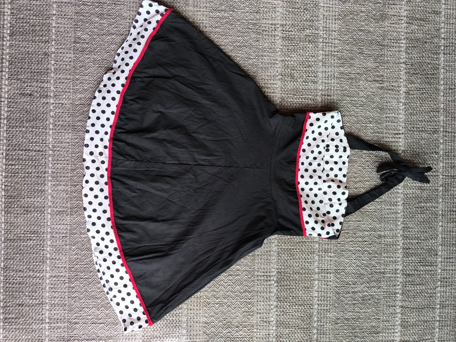 Retro vintage šaty v štýle pin-up girls 50-tych rokov. Hravé, ženské, sexi. Na zaväzovanie okolo krku, zboku zips. Sukňa je kruhová, točivá, vrch je obtiahnutý, pekne drží prsia aj bez podprsenky. V super stave. Návrat do minulosti a oslava ženskosti. Prepracovaný vintage šiat zaručene pritiahne pozornosť a vy sa v nich budete cítiť ako ozajtstná dáma! Ľahko k nim skombinujete topánky na vysokom podpätku a výrazný červený rúž. Ramienka je možné uviazať za krkom. Zvýraznený pás vďaka dekoratívnym gombíkom. Bočný skrytý zips. Odporúčam pre väčší efekt sukne dať pod ňu nejakú tylovú spodničku. Veľkosť M, bočná dĺžka je približne 77 cm, šírka cez prsia 42-48cm, v páse 41-45cm, cez boky 65cm. V super stave.