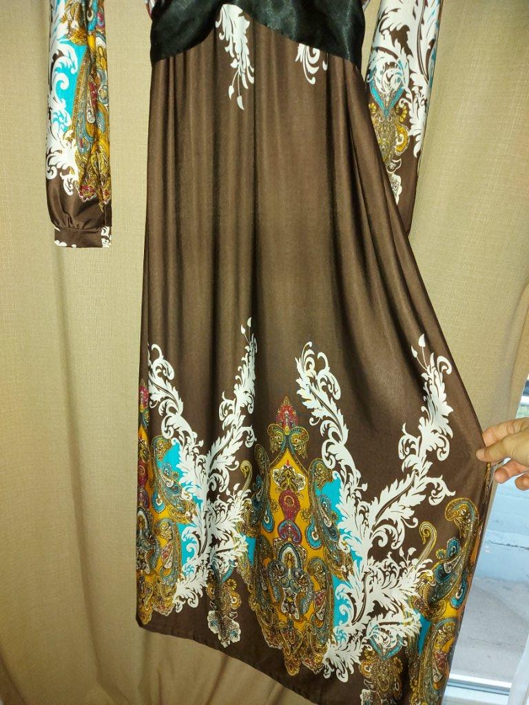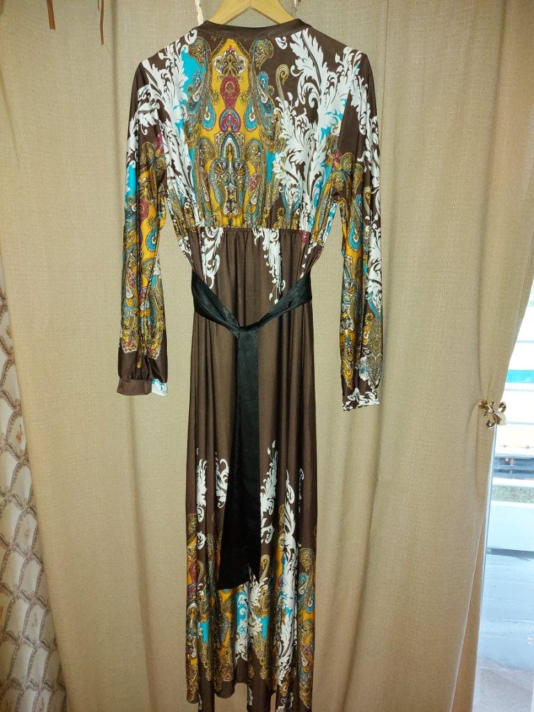 Dlhé šaty, kde prevláda tm. hnedá farba. Okrúhly výstrih, rovný dolný okraj, bez rukávov. Mat. 95 viskoza, 5 elastan. Šaty, ktoré zvýrazňujú Vašu postavu. Pútač pohľadov na párty. Malá dierka na ...