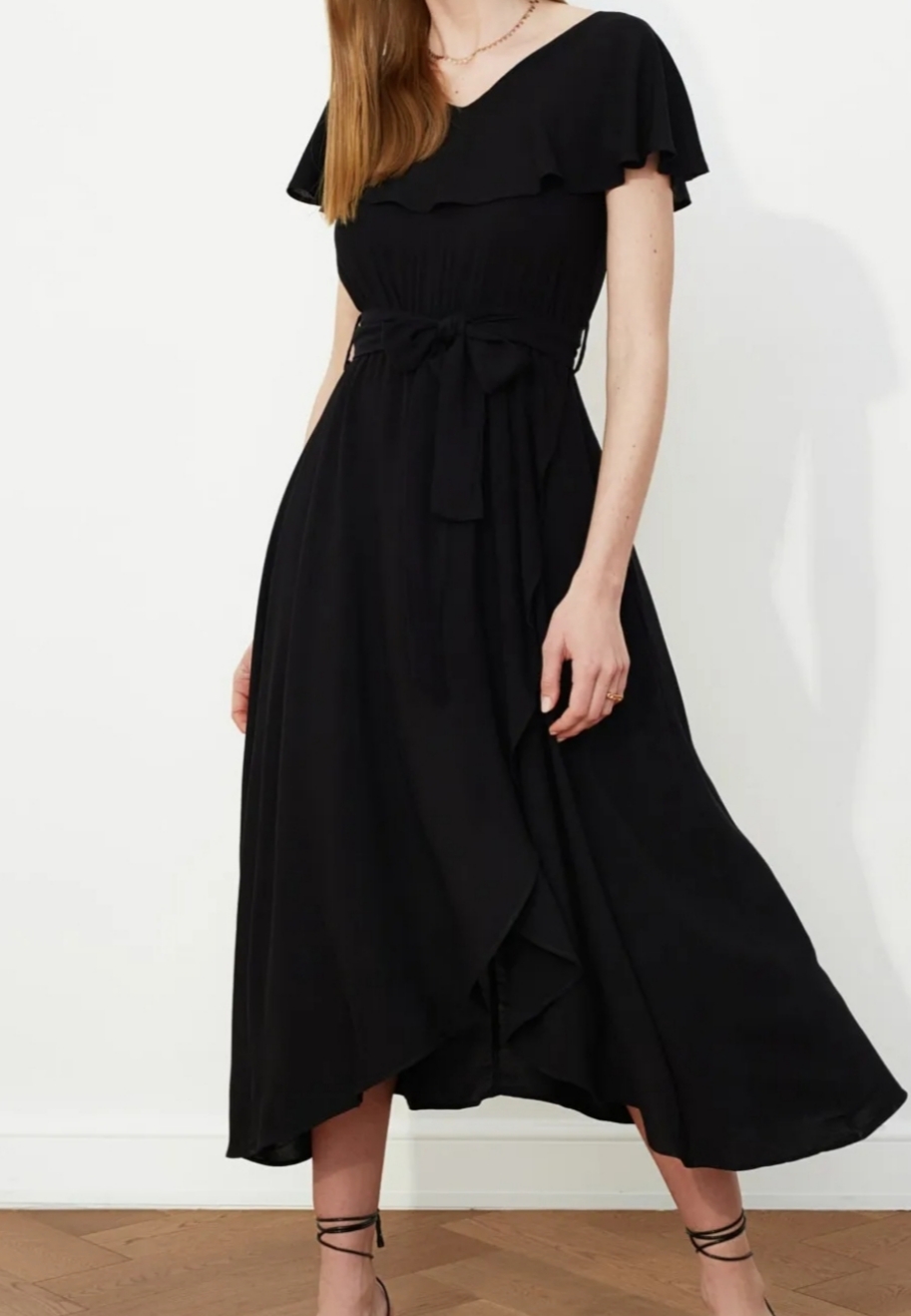Šaty sú úplne nové. Nepresvitajú, pretože majú podšívku. Sú z príjemného, nekrčivého materiálu. Rozmery: obvod hrudníka je 104 cm, veľkosť pása je 86 cm, dĺžka šiat je 118 cm.
