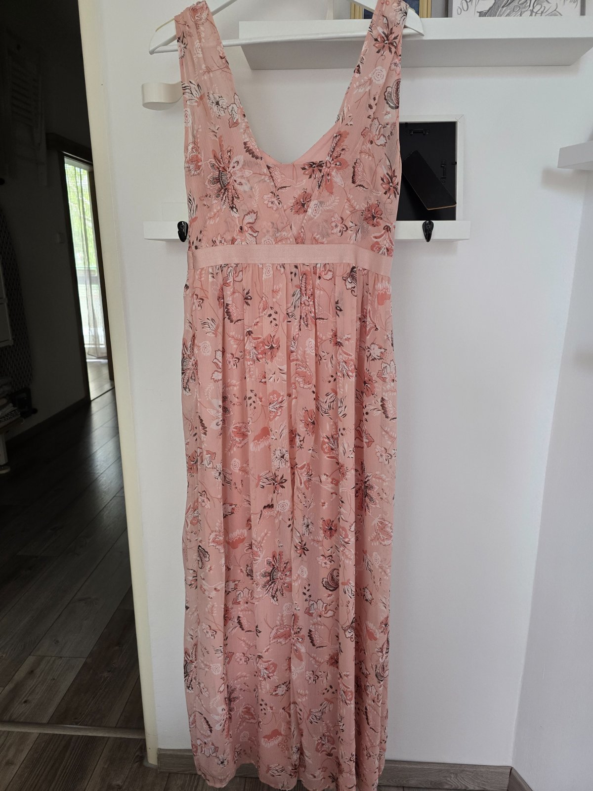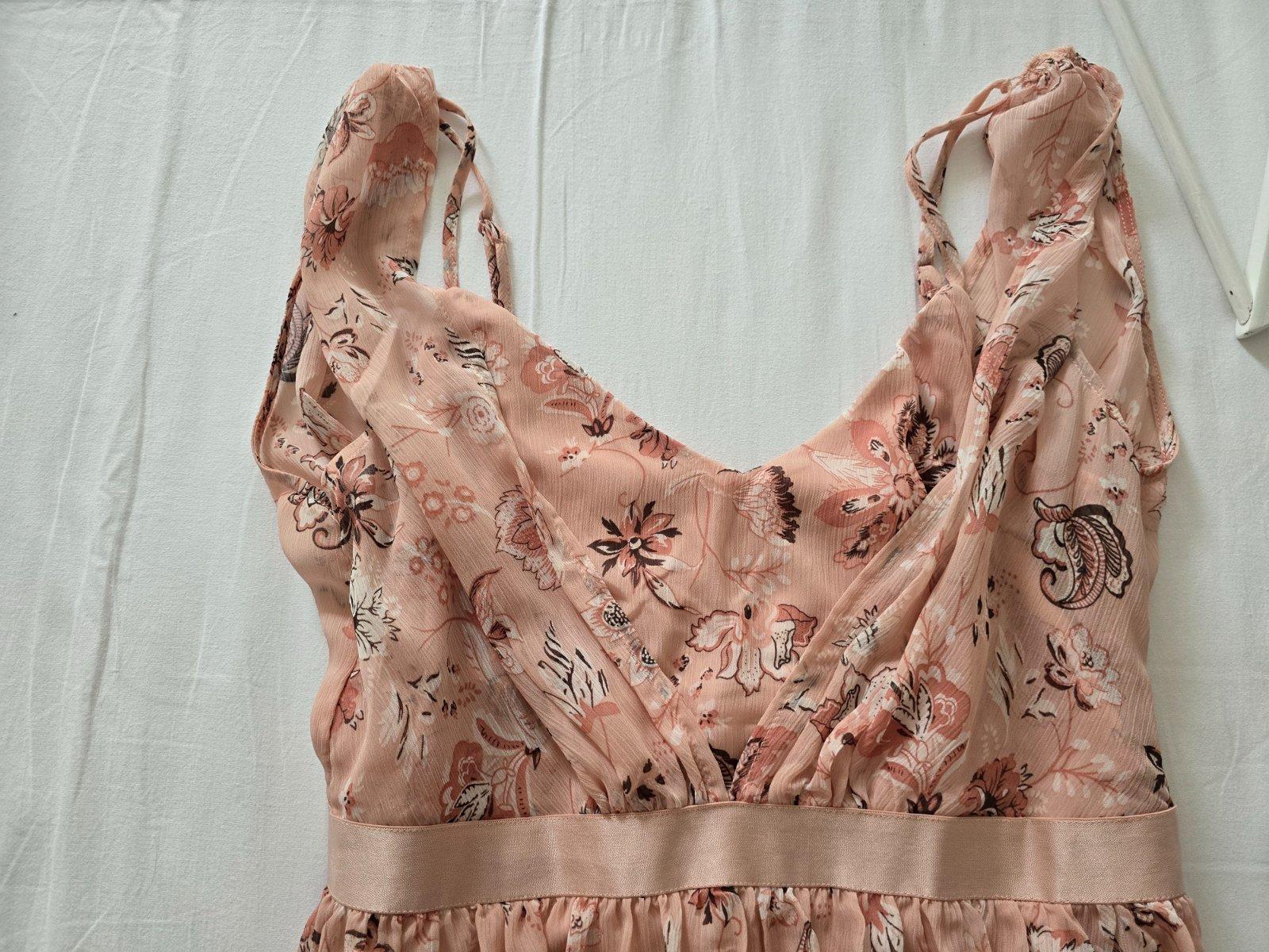 Predam nadherne letne saty, so sirsimi ramienkami, vrstveny vzhlad, lahky vrchny material, so spodnickou. Farba jemna ruzova, s kvetmi. Z boku je zips, vrchny diel oddeluje od sukne ozdobna ripsova stuha. Dlzka je 150cm, takze odporucam skor pre vysku nad 170cm. Kupila som ich na About You, mala som ich raz oblecene.
