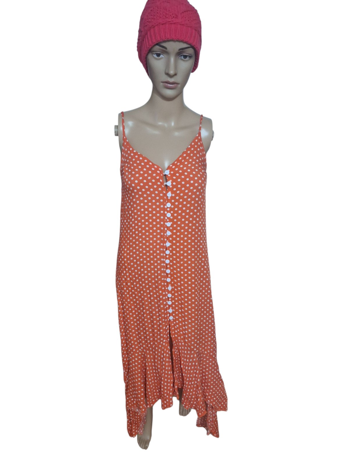 Dámske letné bodkované šaty. Dĺžka je 130cm,obvo hrudníka je 72cm a obvod pása je 74cm. kód 292