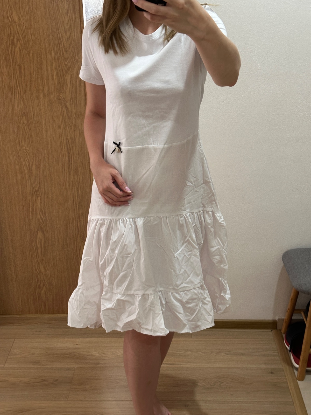 Šaty len vyskúšané. Mám rada krátke na leto. Materiál príjemný na nosenie. Biele s čiernymi bodkami. Cca od pása podšité tenkým materiálom, nie po spodok. Nie sú úplne dlhé. Po bokoch jemne dlhšie,...