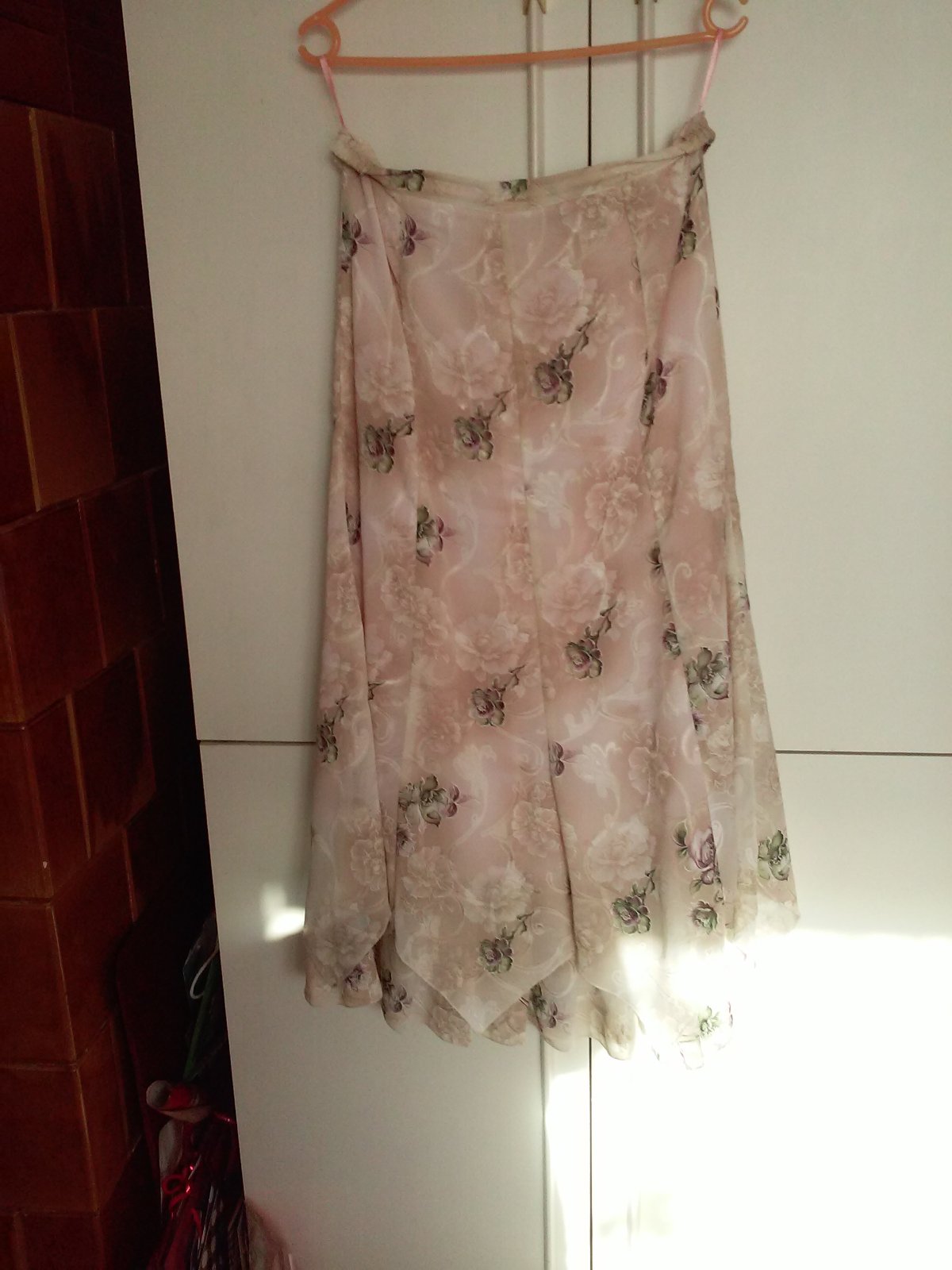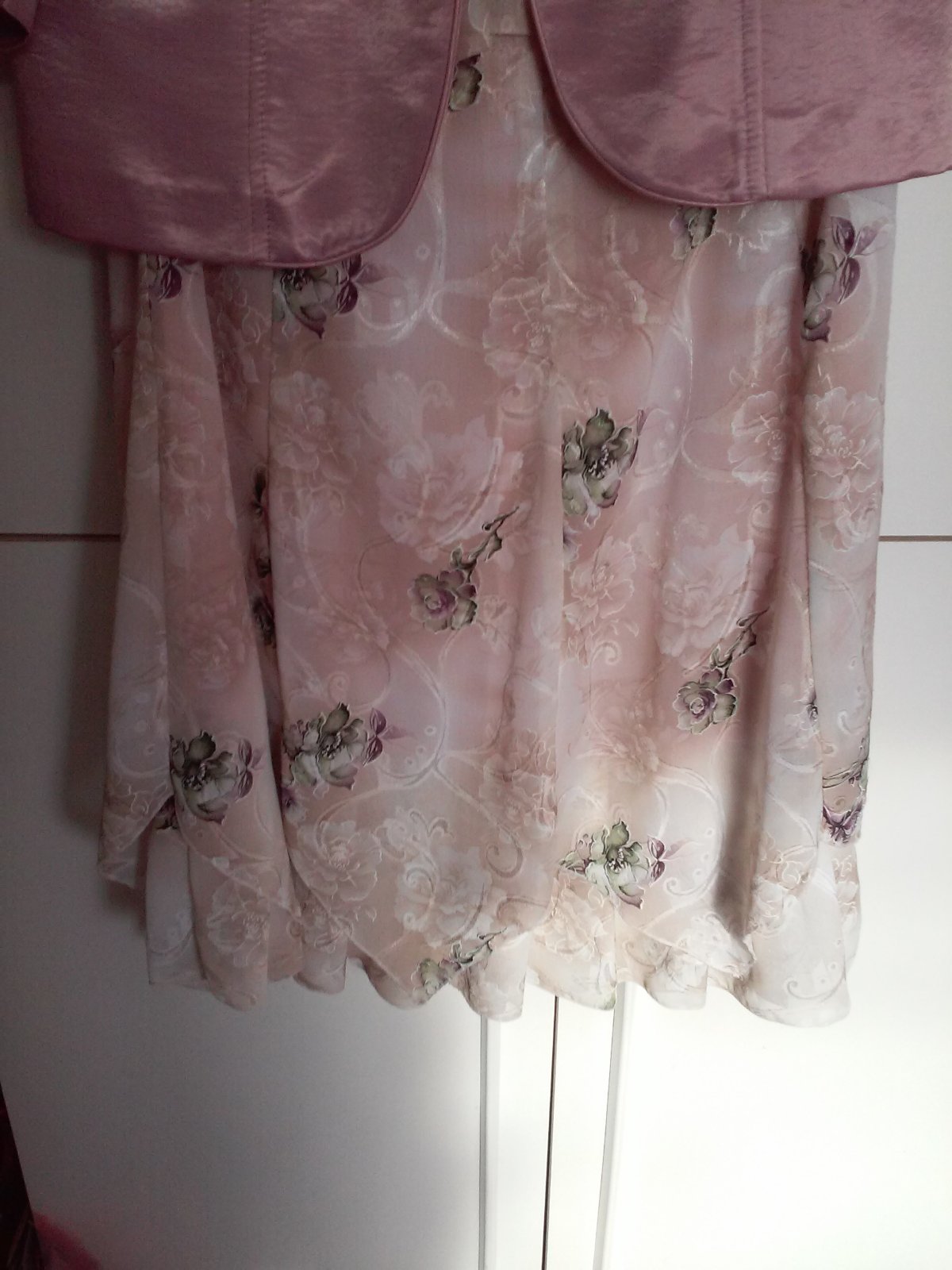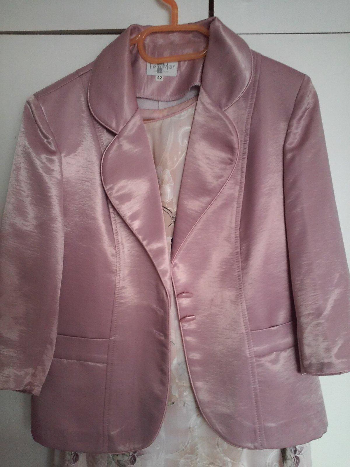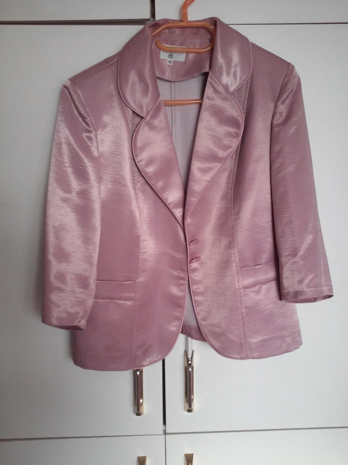 Predám jedenkrát oblečený kostým. mala som ho oblečený iba raz v kostole. Skladá sa zo sukne, topu a saka. Rozmery. Sukňa, pás 38, je tam guma, ešte povolí, dĺžka cca 92, na spodku je tak zvláštne veľmi pekne zakončený. Top: dĺžka 49, šírka pod pazuchami 49. Sako dĺžka 58, pazuchy 50, rukáv je trištvrťový, cca 44. Napriek tomu, že bol oblečený iba raz, stihla som asi prsteňom zachytiť na rukáve, nie je to veľmi vidno, no pre istotu píšem a prispôsobila som tomu aj cenu. všimla som si to len keď som išla fotiť.