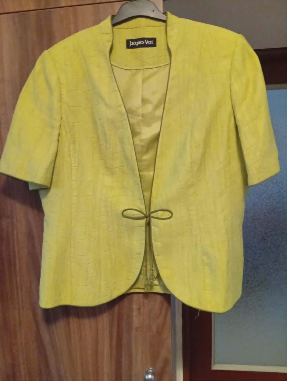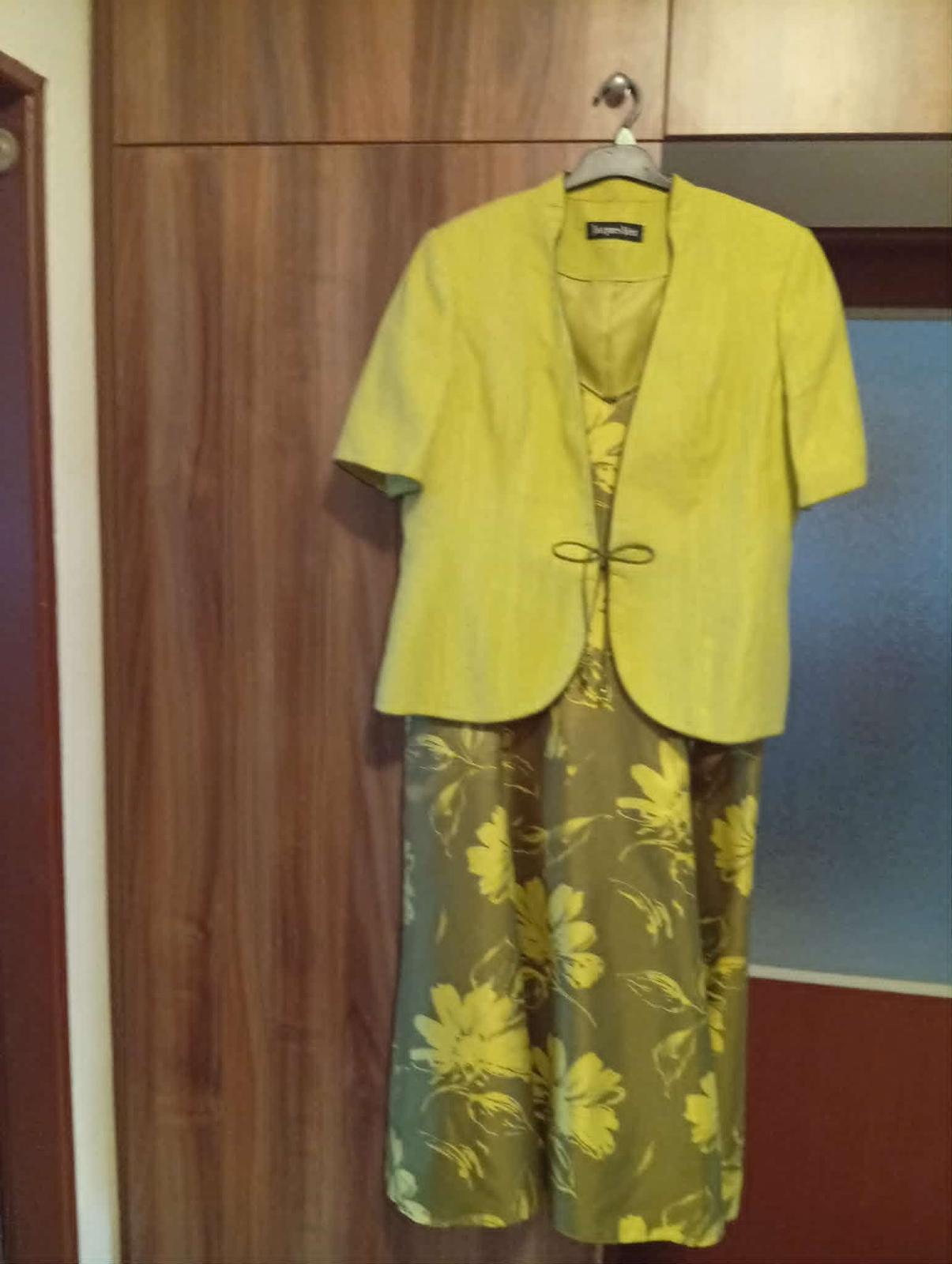 Raz oblečený kostým na sviatočnú príležitosť, kúpený v UK, výborná kvalita, podšité šaty aj sako, ľahká, nekrčivá látka. Značka Jacques Vert. Pôvodná cena 159£