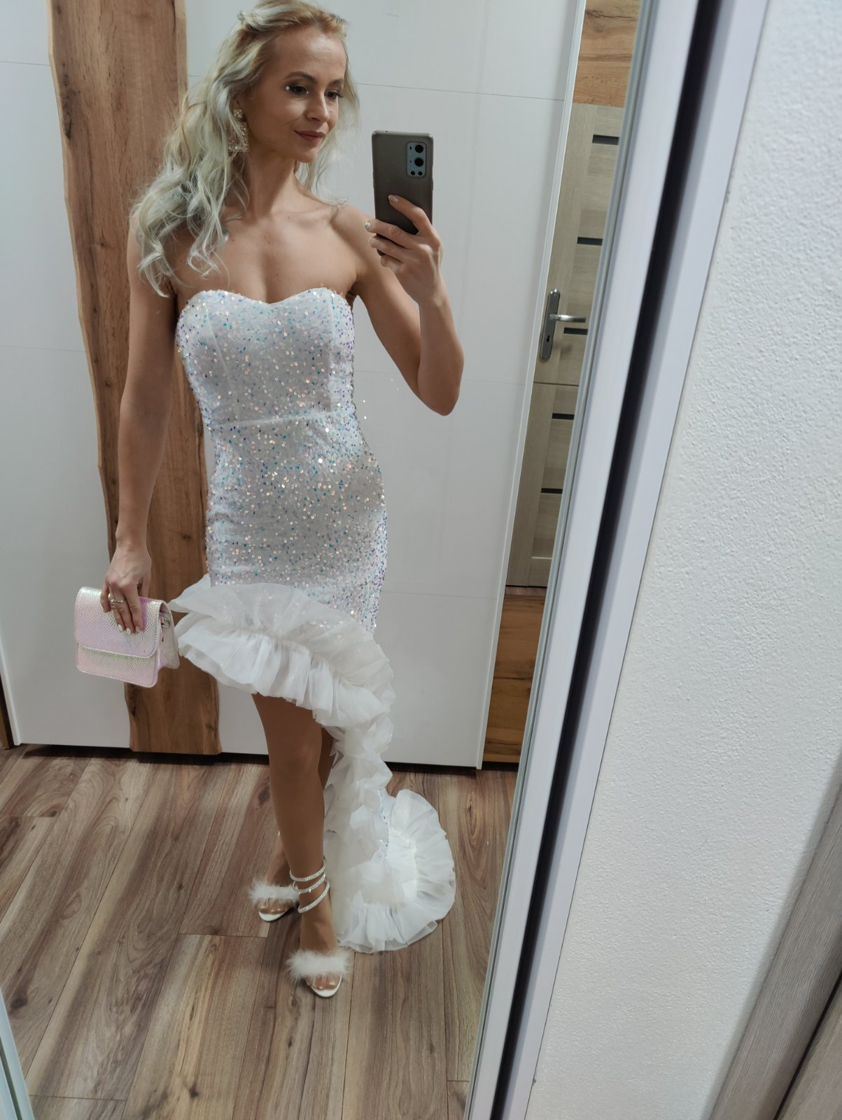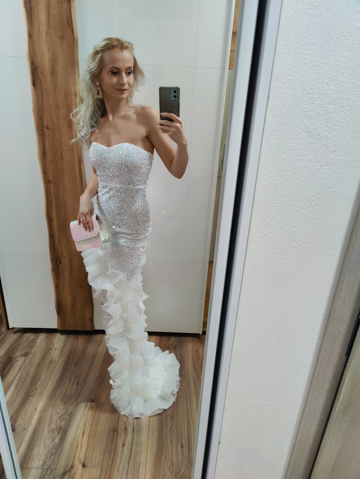 Raz oblečené, rozmery na foto, vzadu zips, prsia vystužené. Šaty sú ľahké, pevne držia, nešmýkajú sa. Flitre neškrabú a sú pružné, prispôsobia sa, zo spodu vlečky je stužka na zavesenie na ruku, aby pri tanci nezavadzala