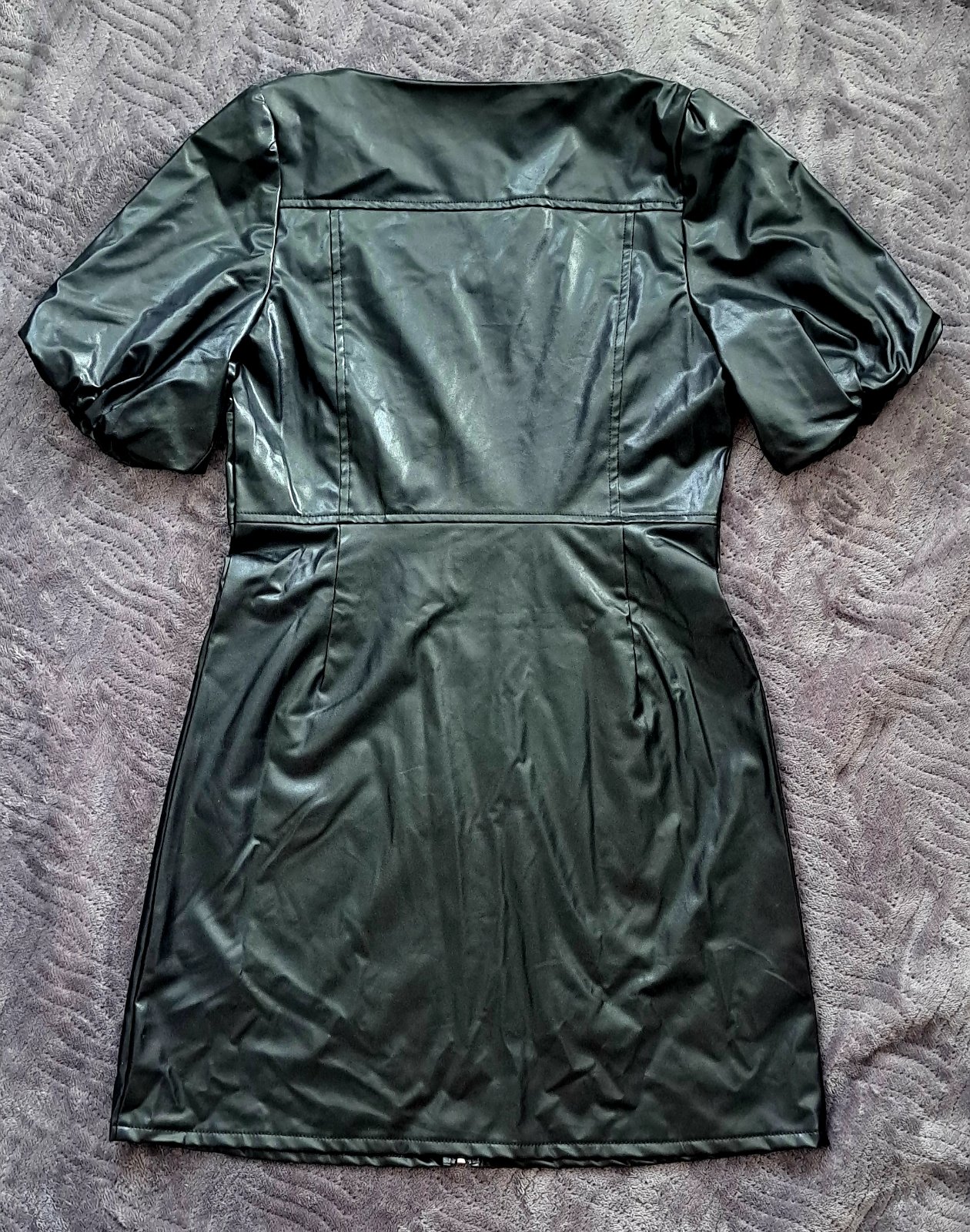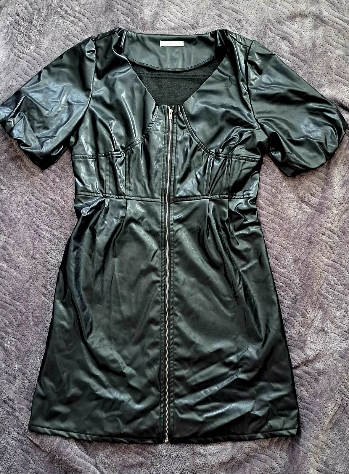 Moderné čierne šaty z koženky so zvýrazneným strihom – štýlový kúsok na párty, večer do mesta či na špeciálne príležitosti.