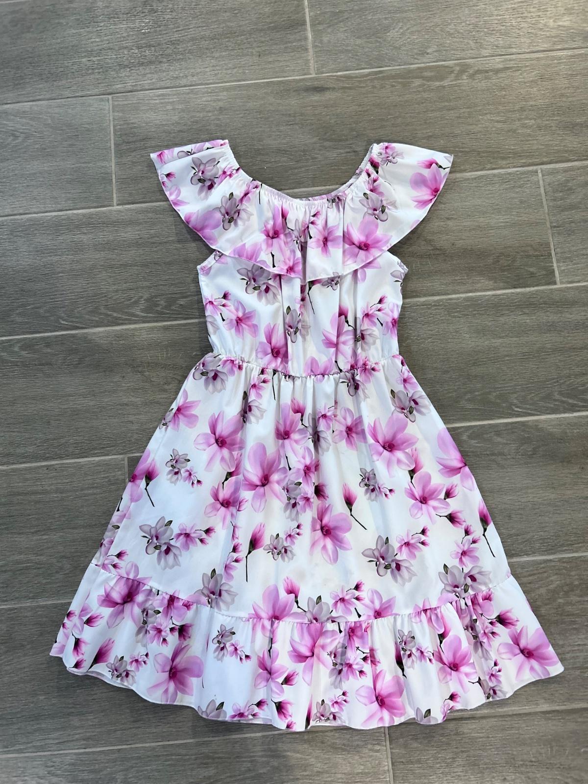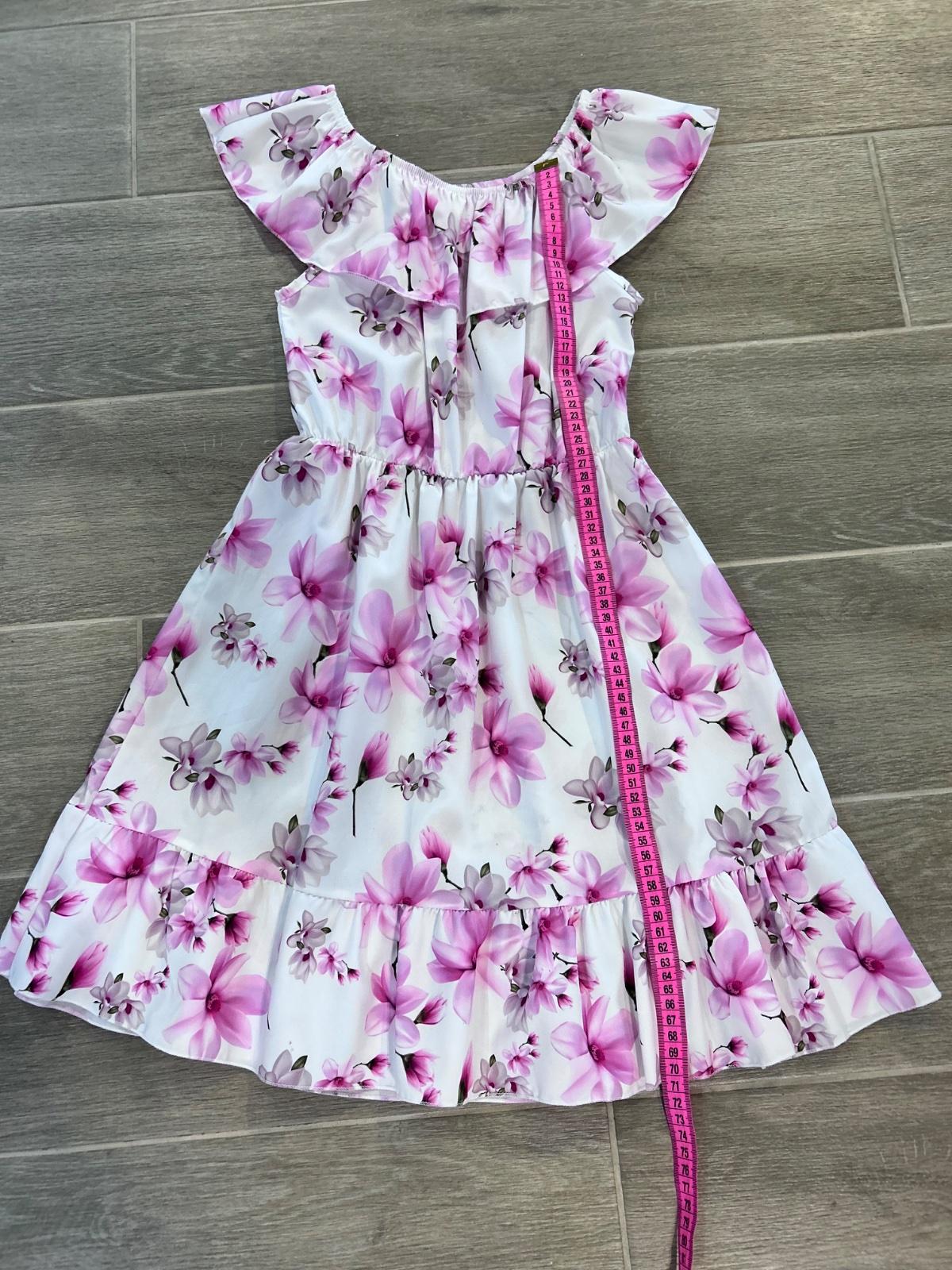 Krásne šatky nosené príležitostne. Veľmi pekne ukážu na postave. Veľkosť nie je uvedená, nosili sme ako 128-134. Miery na foto