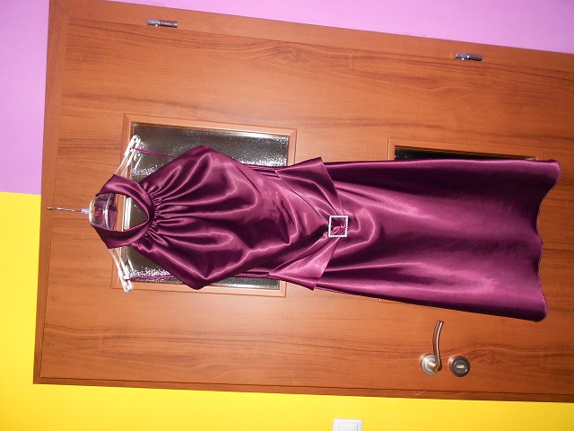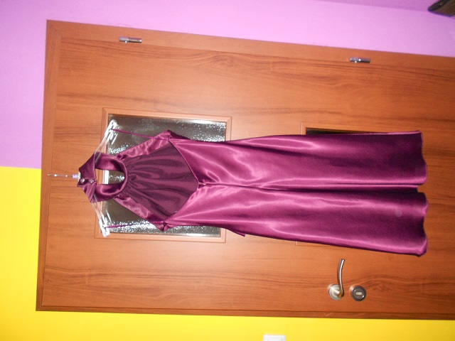 Tieto fialové spoločenské šaty sú so zapínaním okolo krku a vzadu na zips. Majú poloobnažený chrbát, z materiálu satén a majú opasok so štrasom.Celková dĺžka šiat od krku po spodok je 100 cm.Ich zakúpením získate ako darček náušnice dlhé 9 cm a náramok univerzálnej veľkosti rovnakej farby ako šatky.