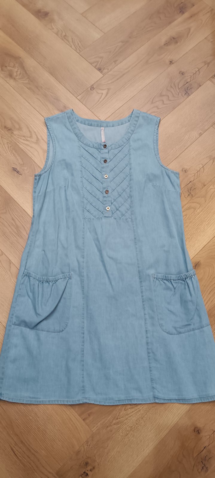 Predám dámske riflove šaty. Veľkosť 40,su svetlomodrej vysuchanej farby, zapínanie po celej dĺžke šiat na cvoky. Vpredu 2 vrecka, príjemný mäkký materiál,bez poškodení. Cena 5€ plus poštovné.