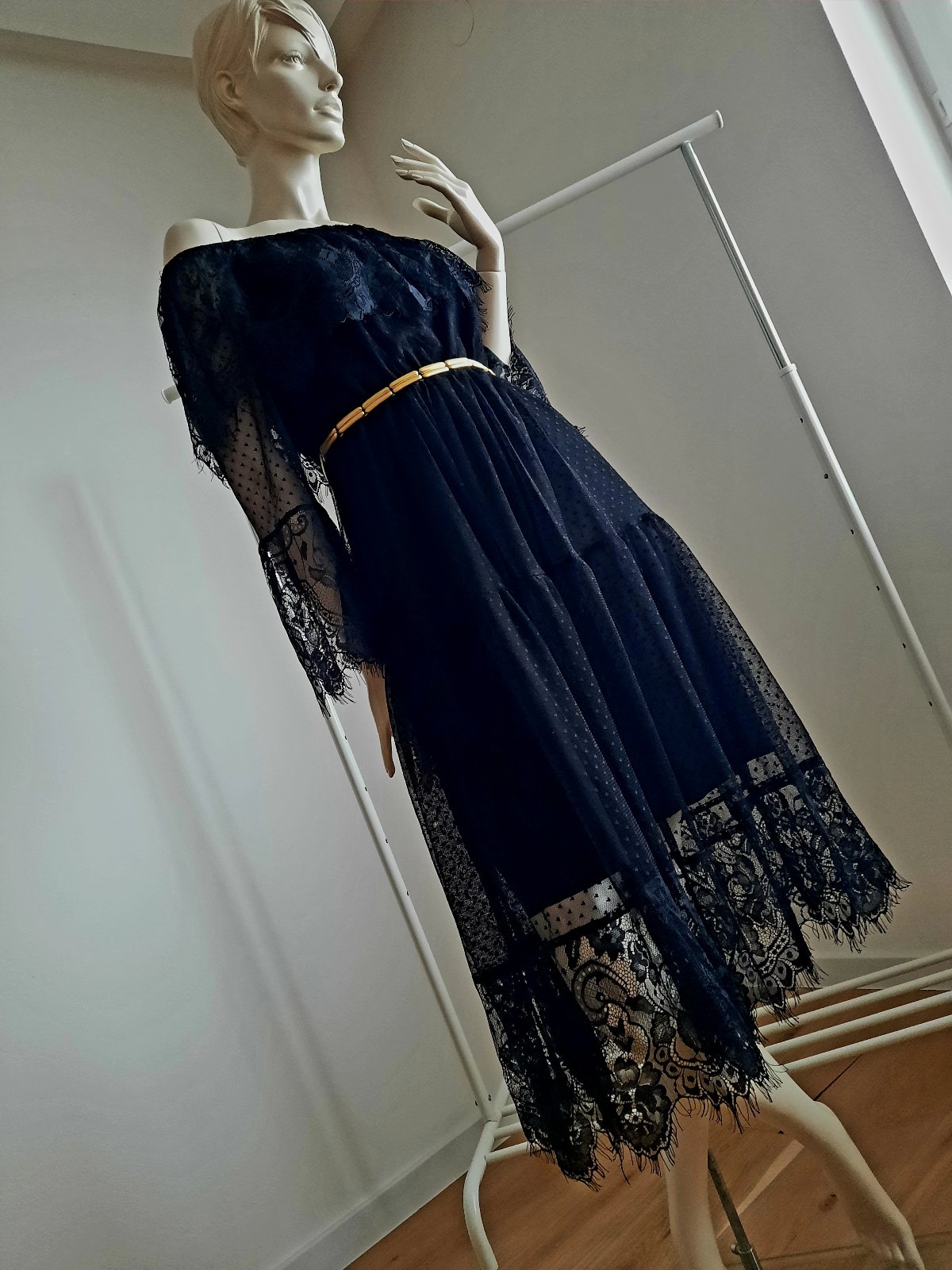 "španielky" ...čierne krajkove saty so spanielskym vystrihom, elasticke, prisposobive, v pase je gumička, su ciernej farby, na foto ich taha skor do čiernomodra, opasok zlaty je len dekoracny/nepredajny... vel M