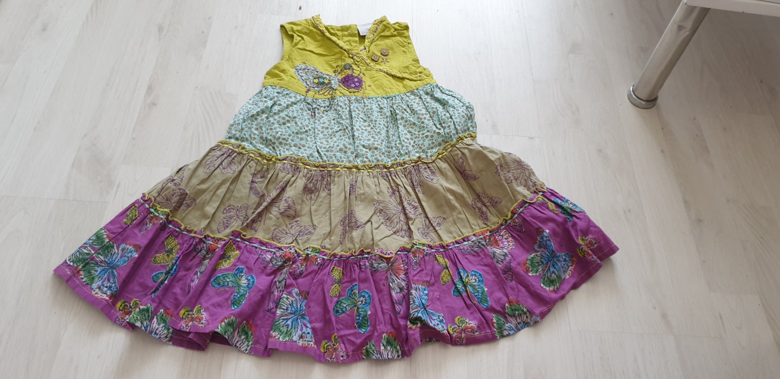 Krasne kvetinkove saty s volanikmi. Su nadherne velkost 98, farba je bleducka nie ako na foto skor taka do pudrova. 100%bavlna. Zo zadnej strany na gombiky, maju aj spodnicku. Nosene bez poskodenia...