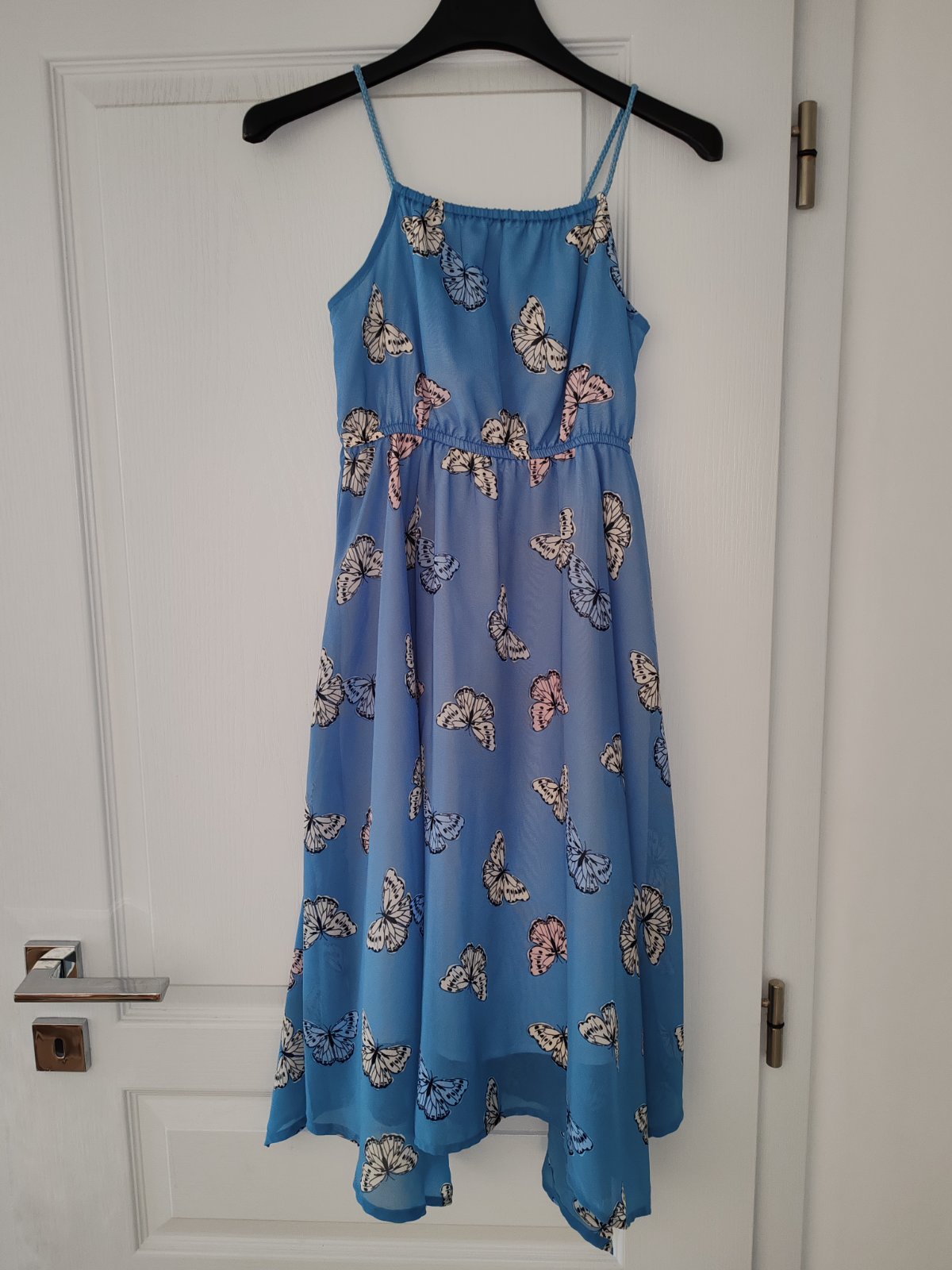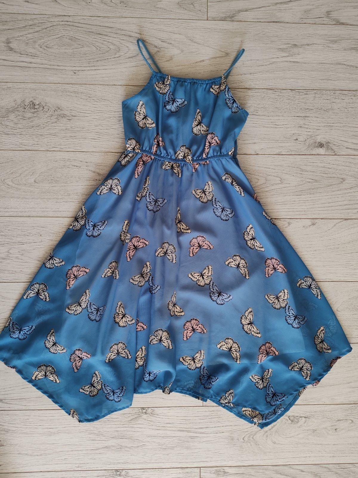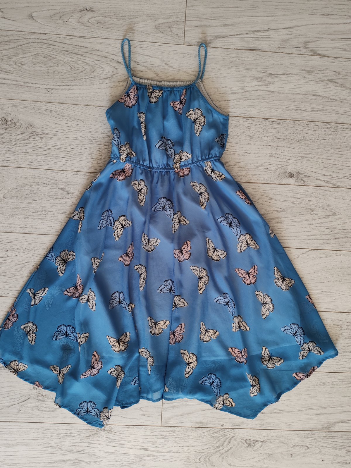 Predám šaty, veľkosti 140/150, celková dĺžka od ramien je cca 95cm, šírka v časti kde je guma je cca 32cm, šírka pod pazuchami je cca 35cm. Šaty sú nepoškodené a veľmi pekné. Na fotke sa nedala dobre zachytiť farba. Šaty majú podšívku.