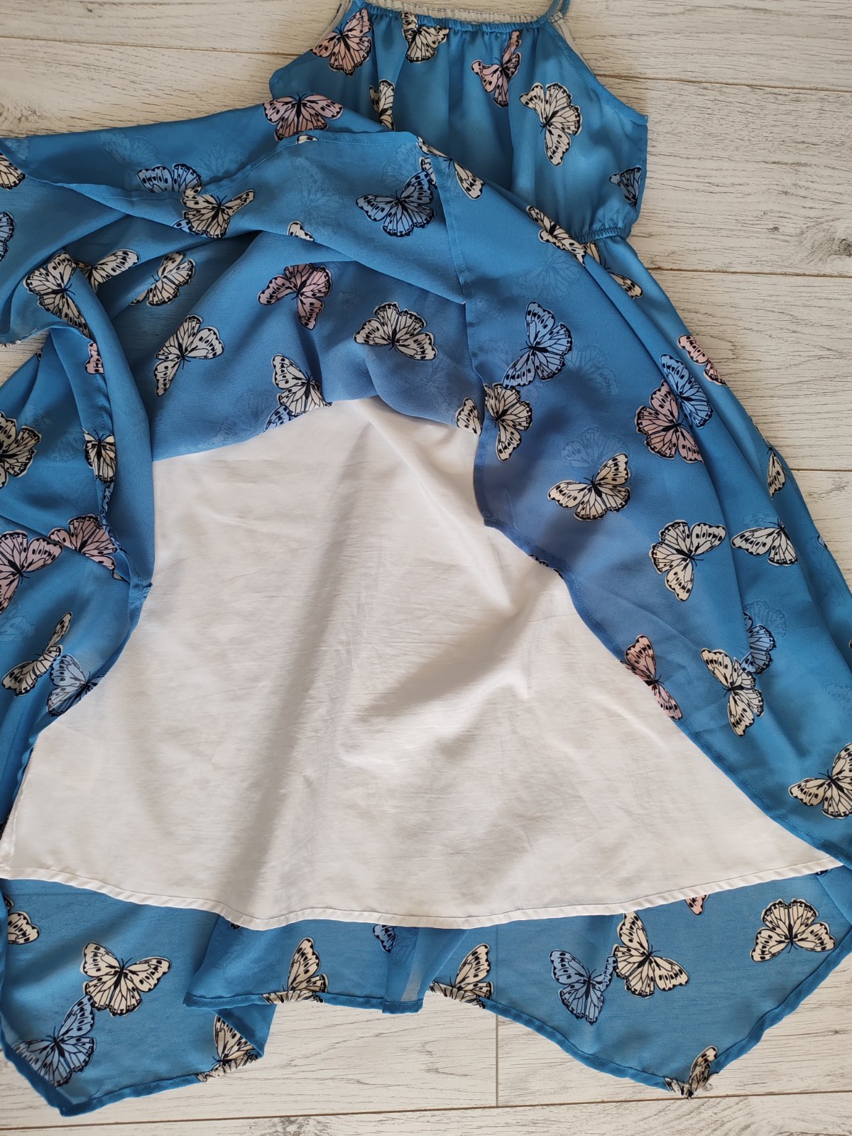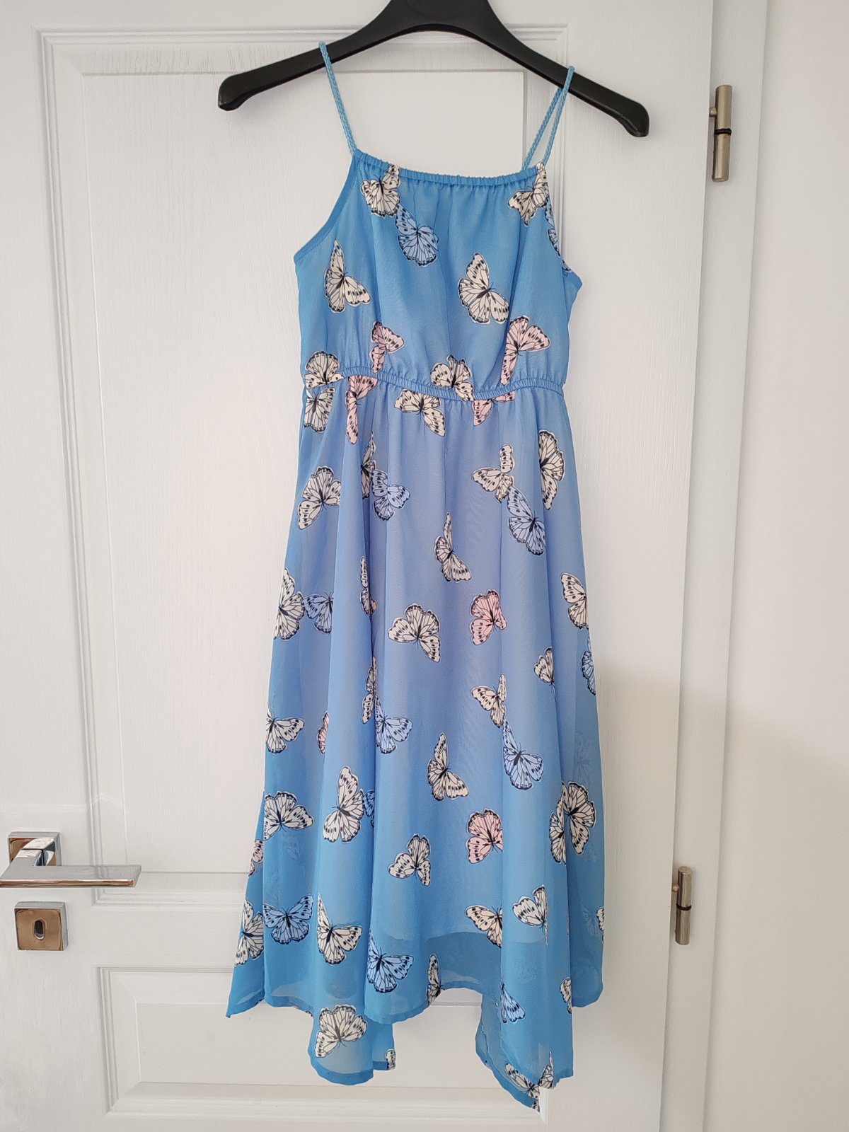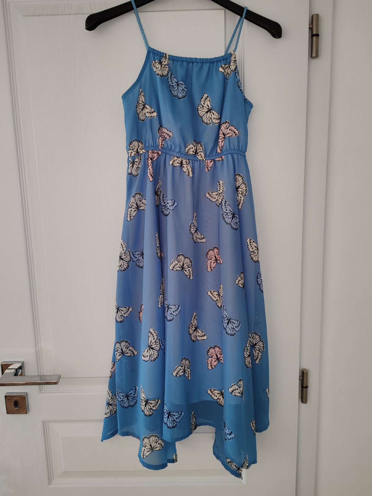 Predám šaty, veľkosti 140/150, celková dĺžka od ramien je cca 95cm, šírka v časti kde je guma je cca 32cm, šírka pod pazuchami je cca 35cm. Šaty sú nepoškodené a veľmi pekné. Na fotke sa nedala dobre zachytiť farba. Šaty majú podšívku.