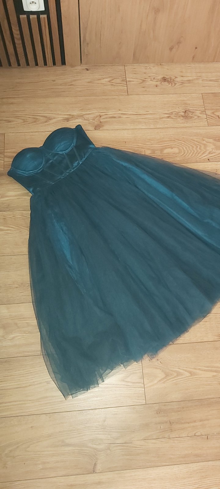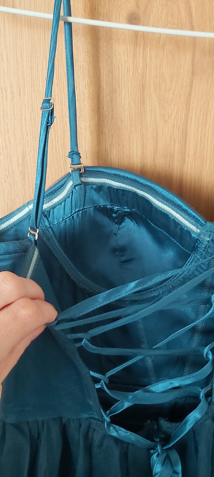 Krasne saty, zachovale. Daju sa nosit s ramienkami aj bez. Dlzka do pol lytok. Sukna je bohata, ma tri vrstvy plus spodnicka. Velmi pohodlne. Skor pre mensie prsia. Vdaka korzetovemu vrchu netreba podprsenku. Vzadu snurovanie takze vhodne aj pre M.