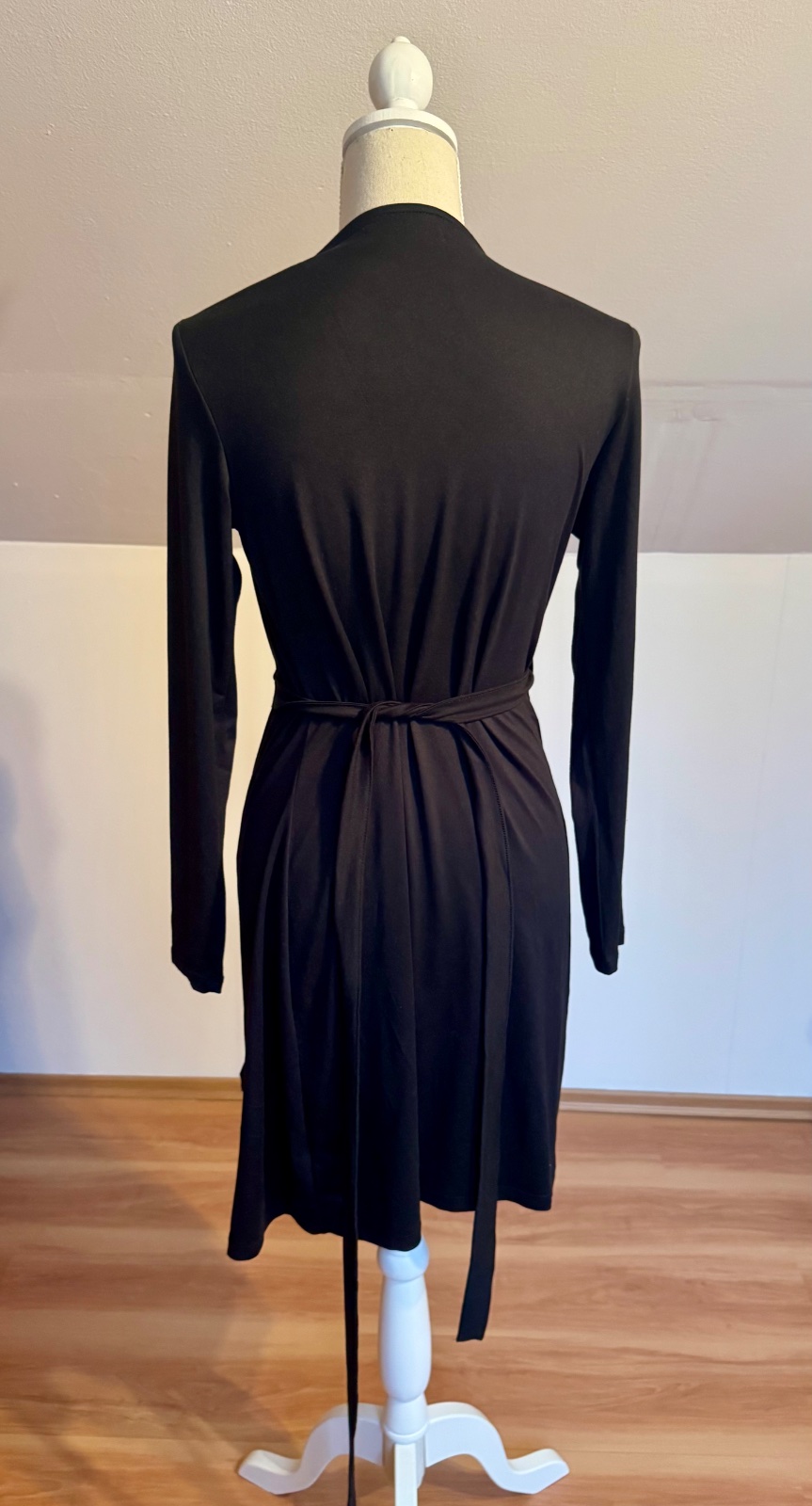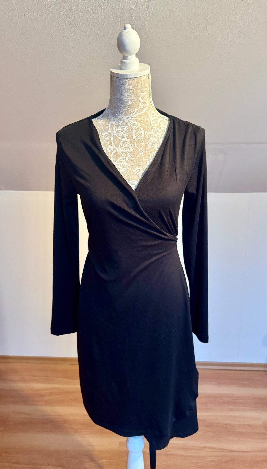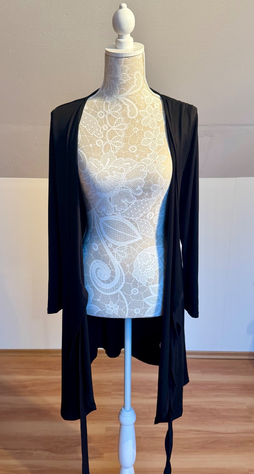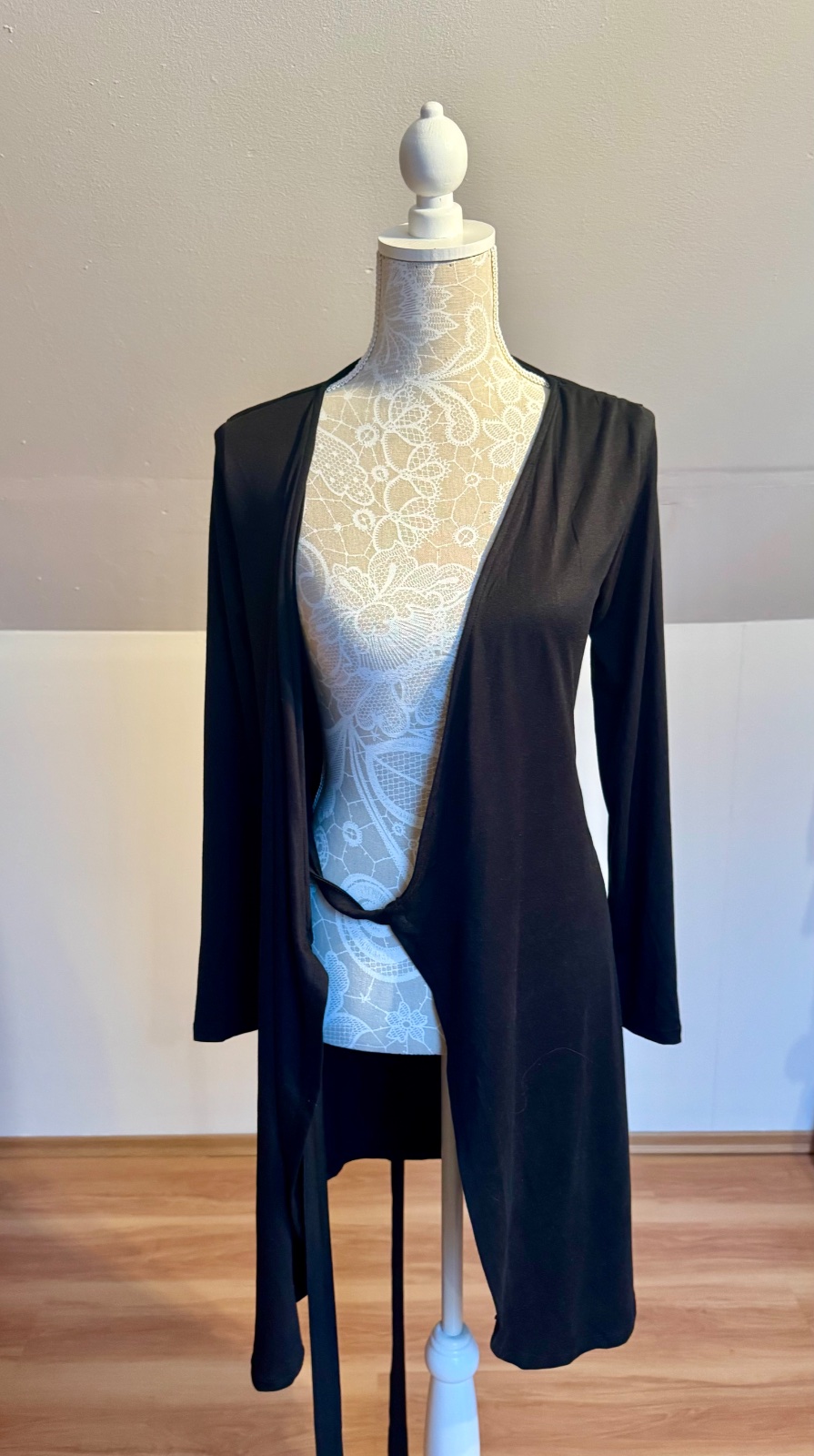 Čierne zavinovacie šaty, ktoré sa však dajú nosiť aj rozviazané ako kardigan. Mäkký elastický materiál, veľmi príjemný. Strih a materiál sa perfektne prispôsobia. Oblečené raz, takže sú bezchybné. Veľkosť M. Značka Sinsay.