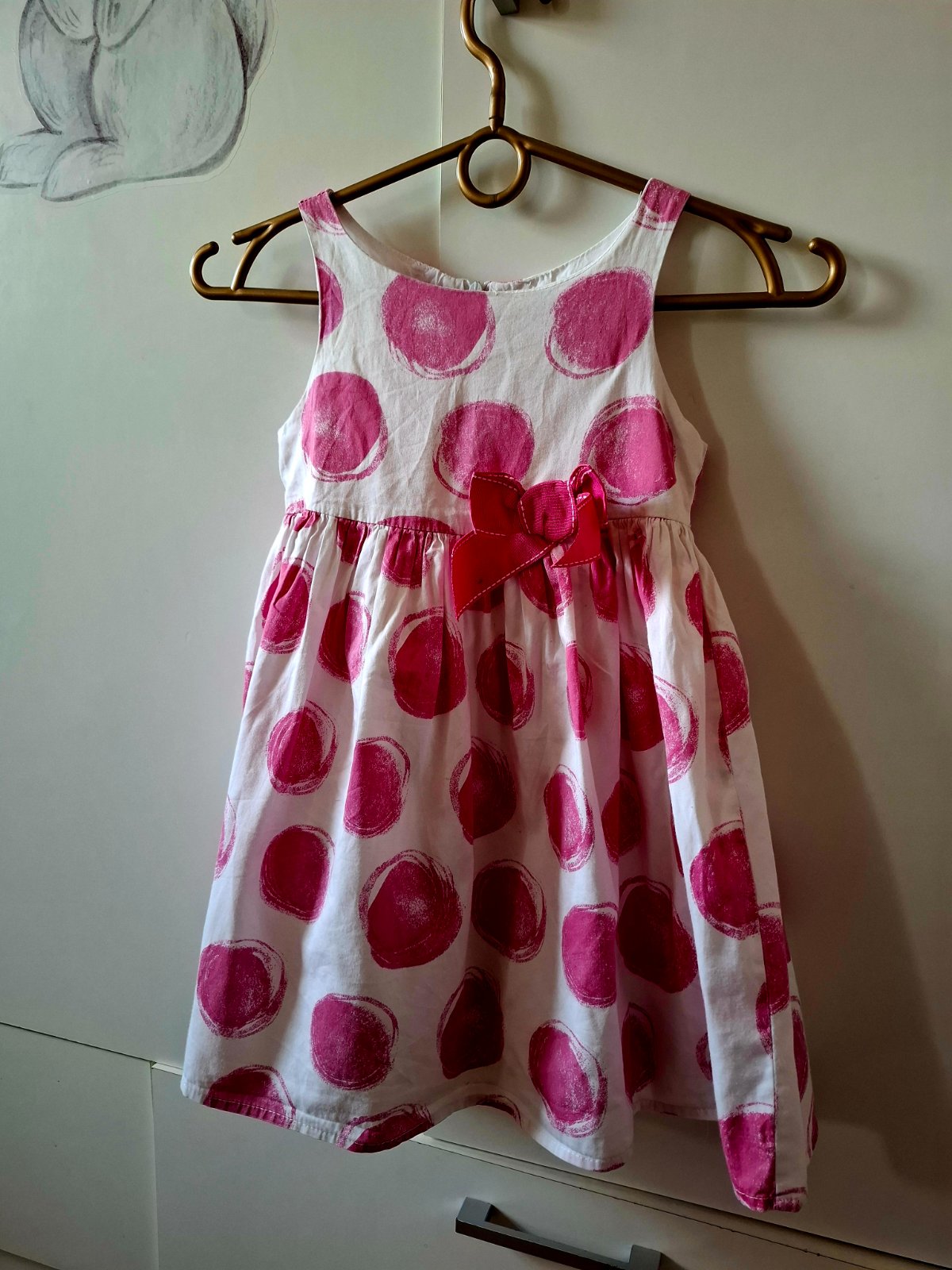 Krásne letné šaty v top stave, bez poškodení. Udaná je veľkosť 98, ale je to taká 110/116. Dcérka ich nosila ako päťročná. V prípade záujmu môžem premerať.
