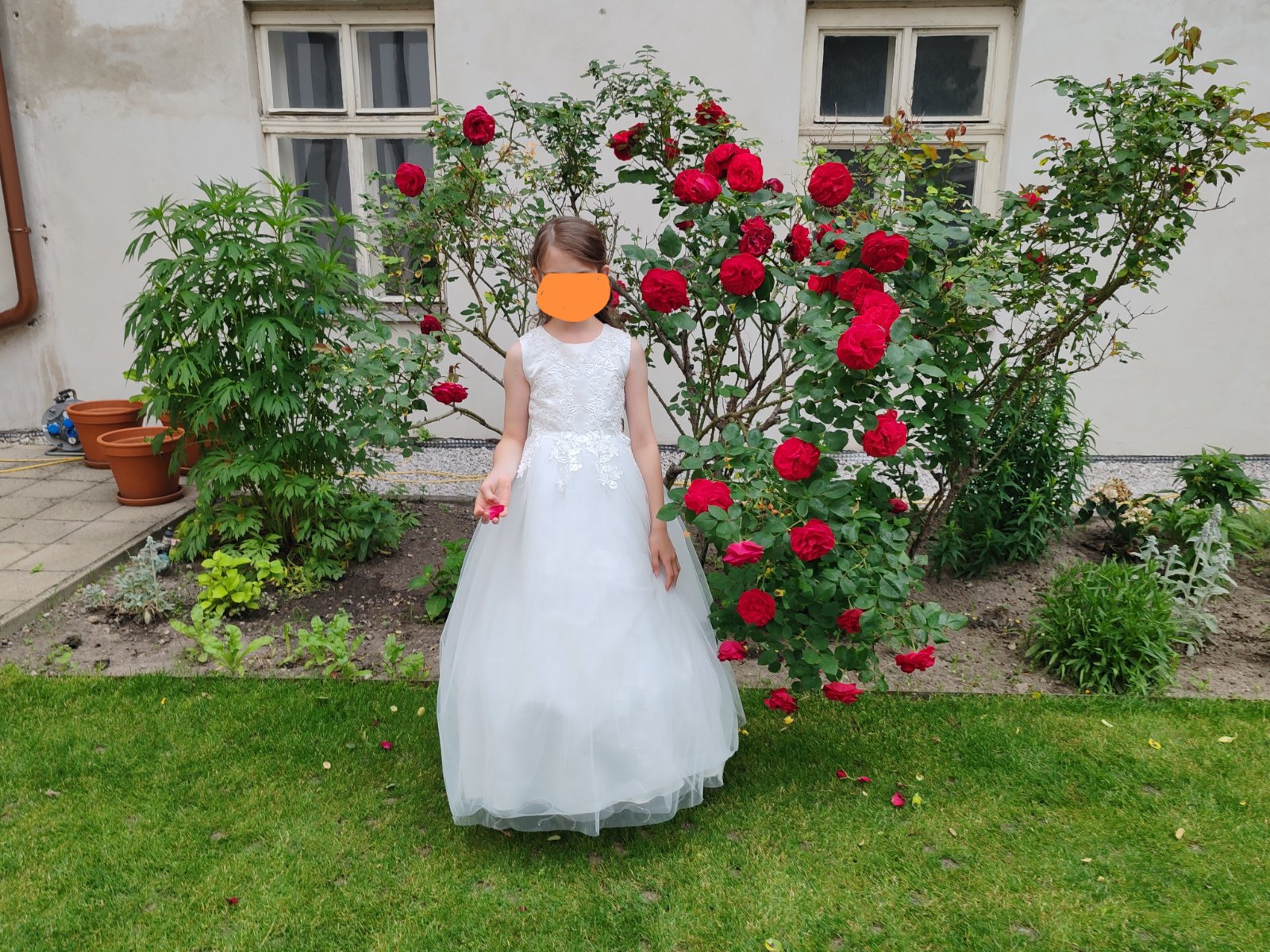 Výborný stav,off white,viac-vrstvove, dĺžka po zem,lupene ruží sú vo vrchnej časti vpredu prisite,na spodku sú vo vrstve a pohybujú sa pri pohybe-nie sú prisite, veľkosť 9 rokov,s.pod pazuchami 34 ...