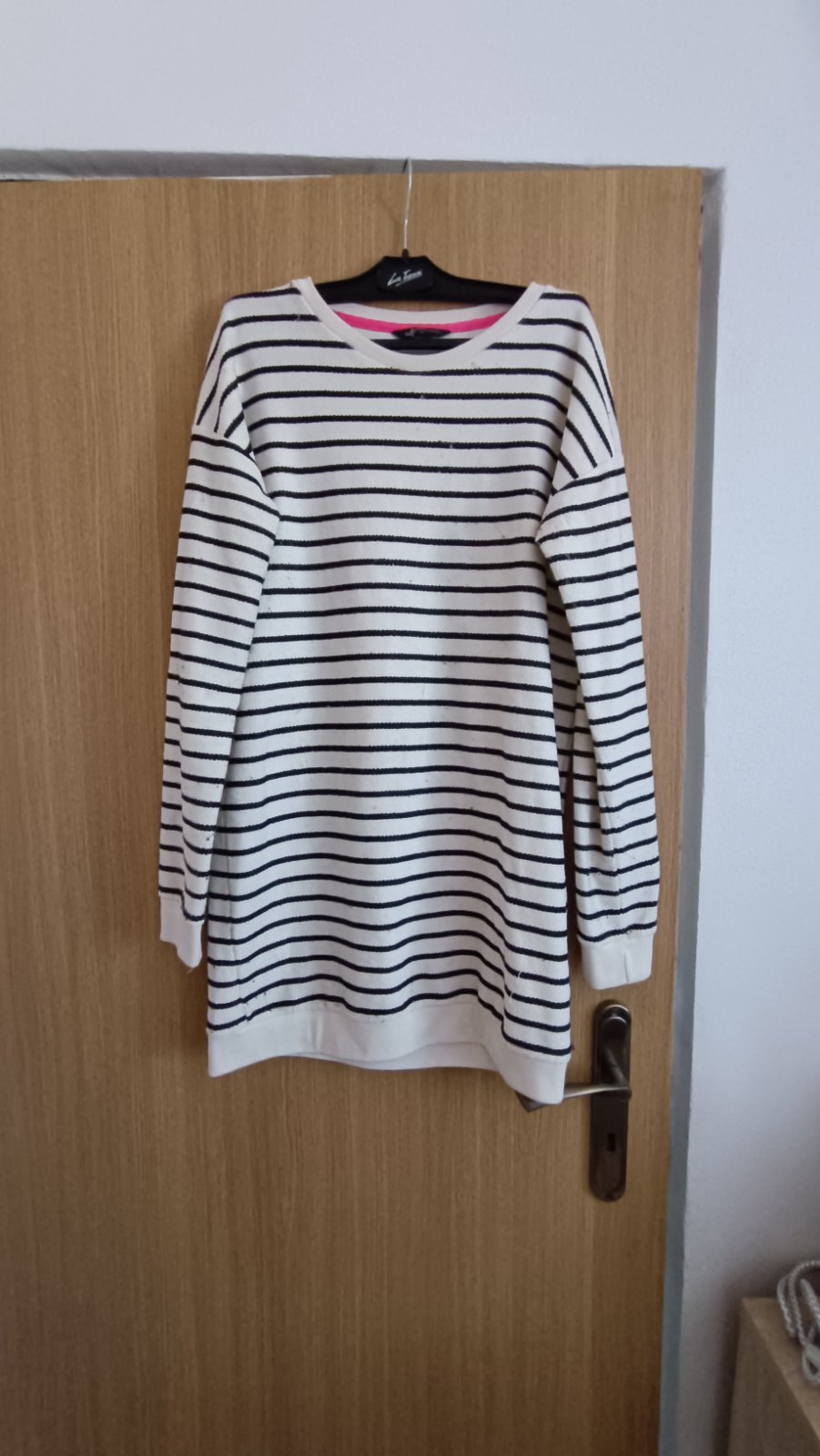 Dámske zateplené oversize šaty s dlhým rukávom, kapučnou a dvoma bočnými vreckami. Elastické. Pásikavé. Materiál:38%viskóza,30%bavlna,30%polyester, 2%elastan. Veľkosť UNI (vhodná pre M,L,XL,XXL). K...
