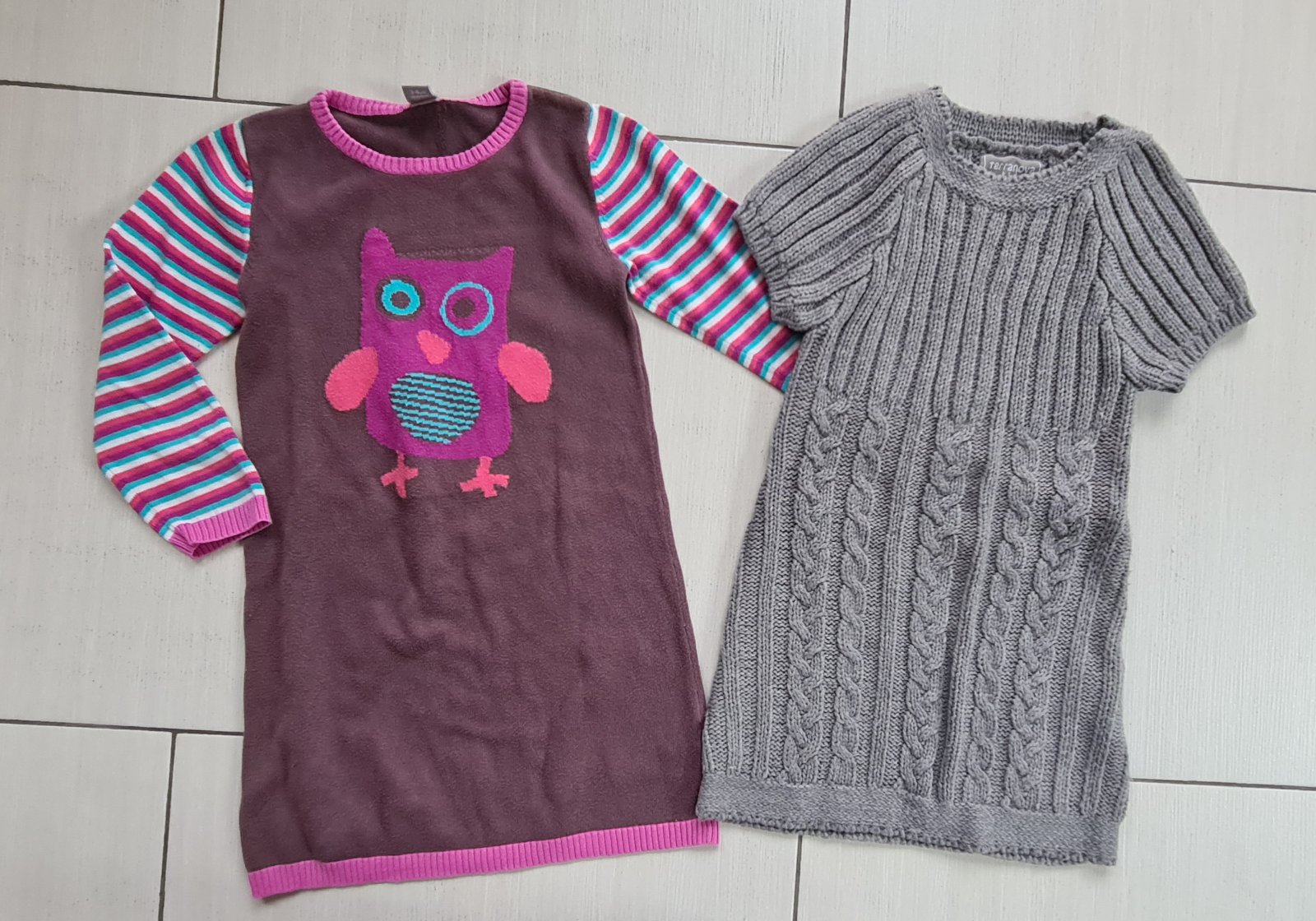 Teple šaty so sovou velkost 98/104, terranova šedé pletené šaty velkost 104-110. Nosili sme v rovnakom čase. Krasne oboje