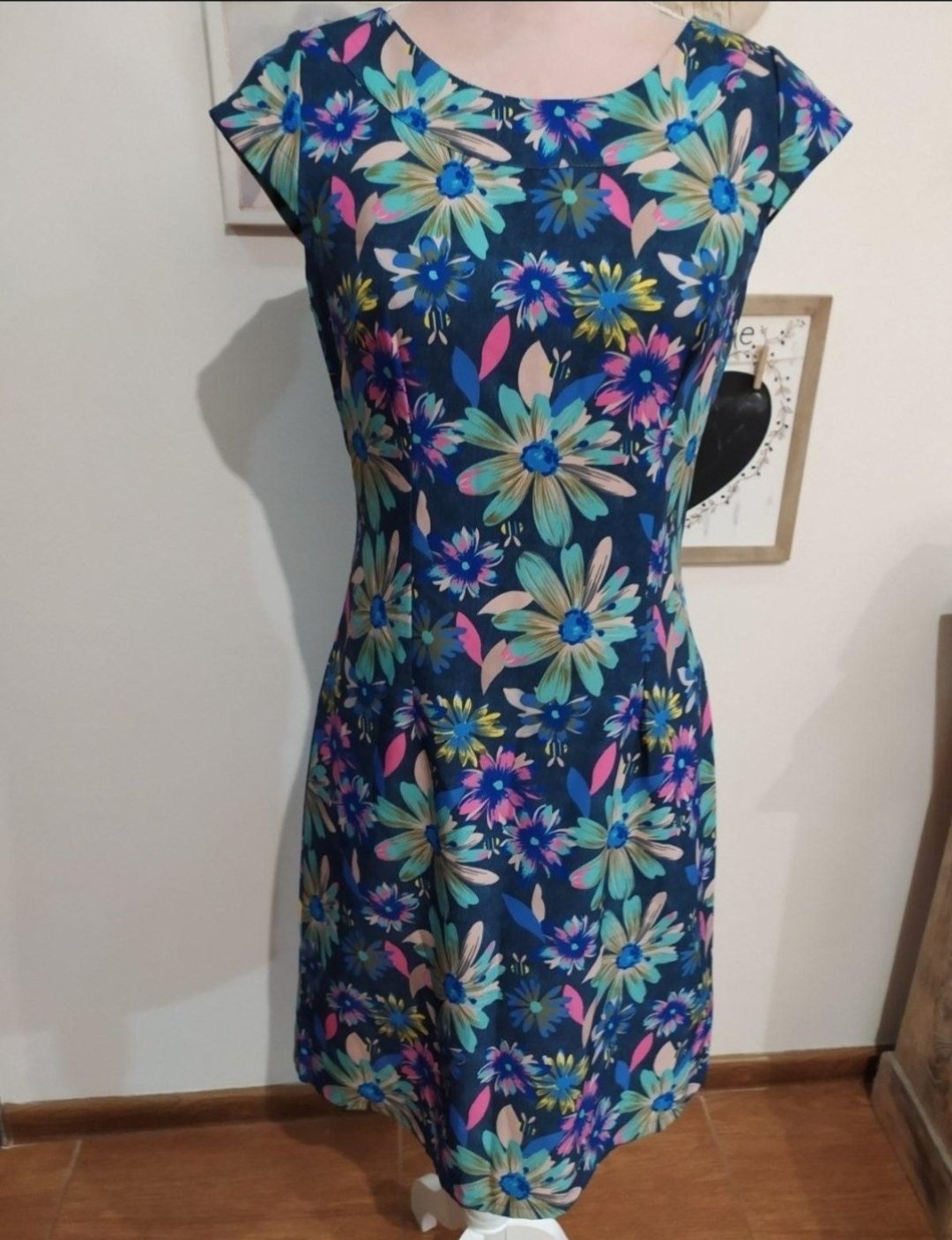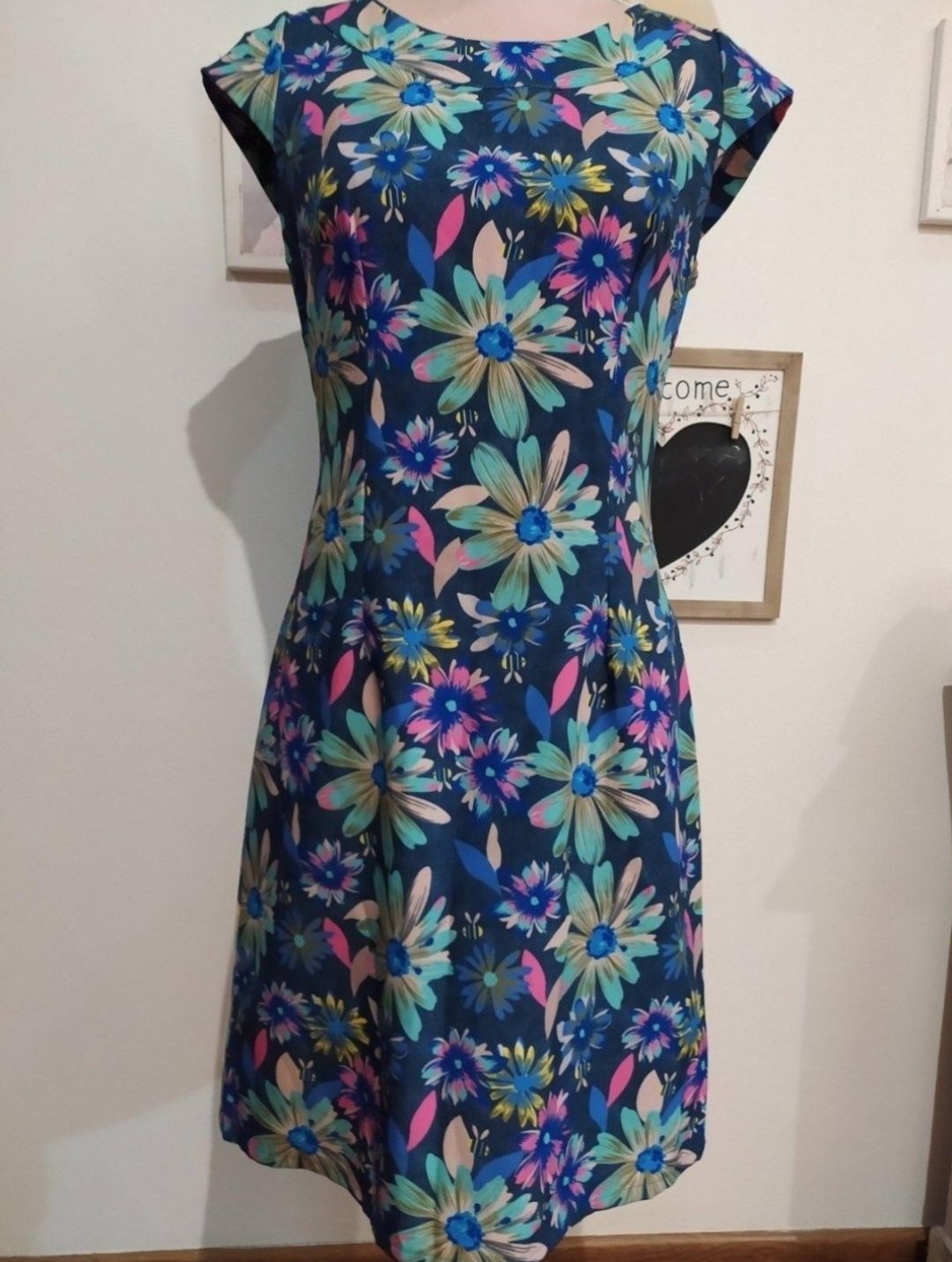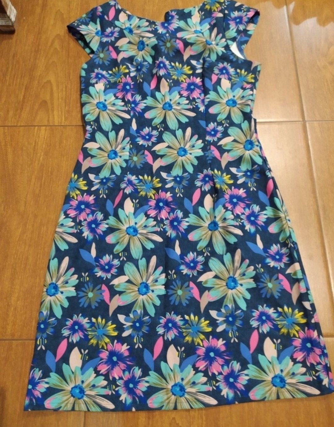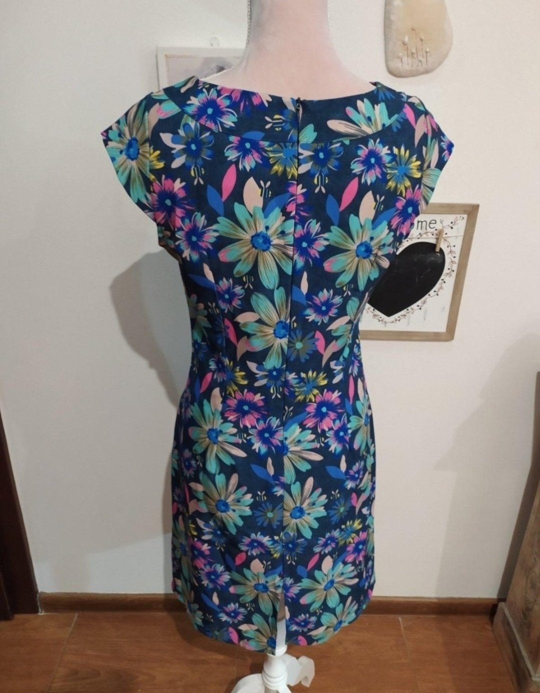 Pekné šaty ,pestré kvetované,látka s elastánom ,pekne sa prisposobia na postave.modrý podklad posobi ako rifľovina.Top stav,vzadu zips