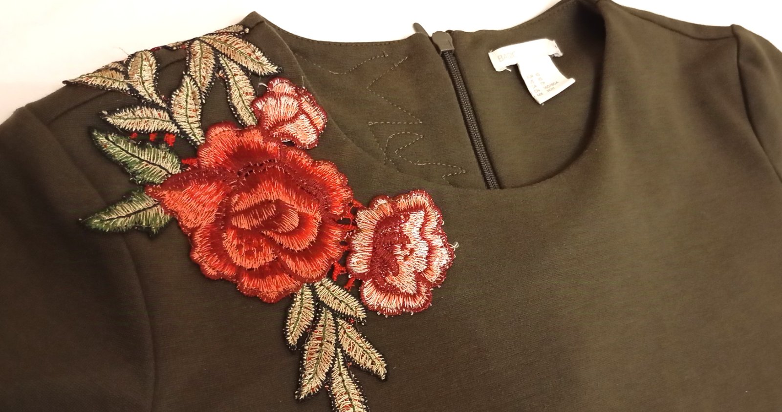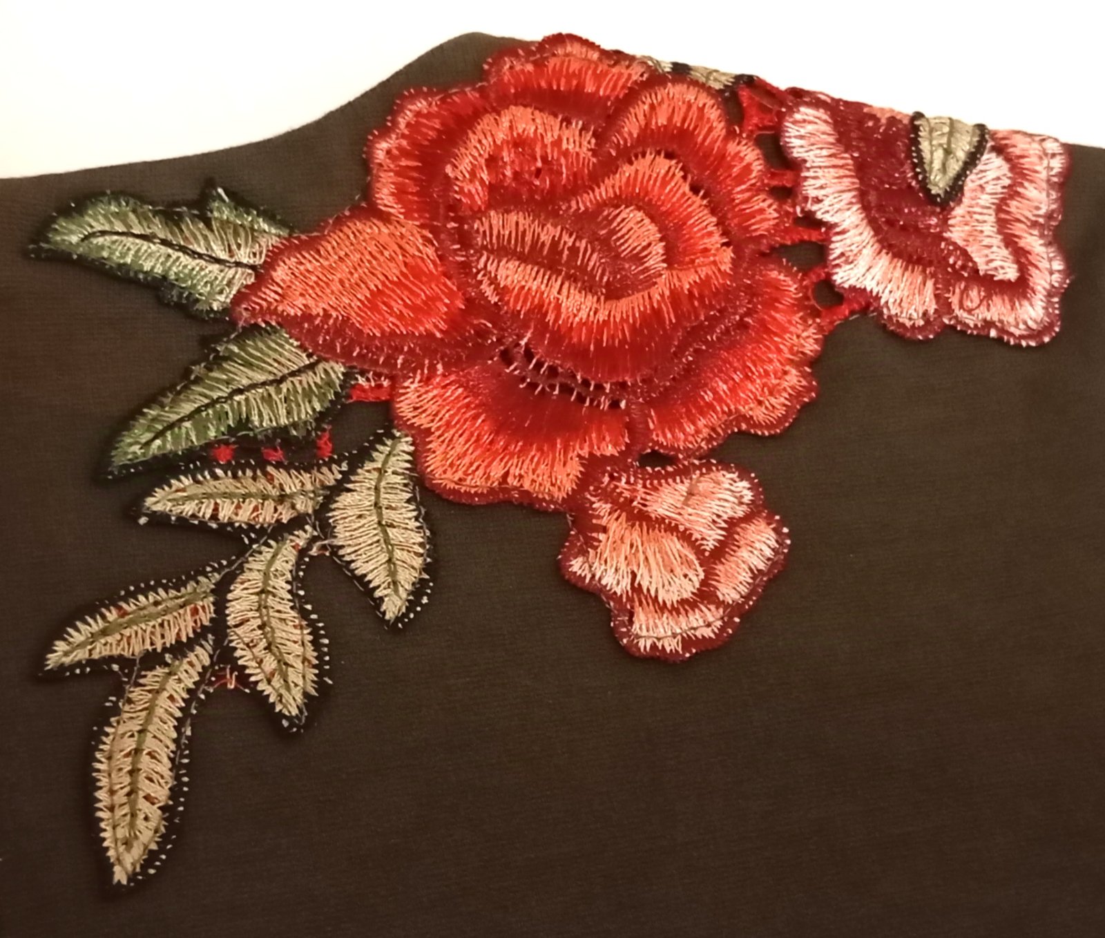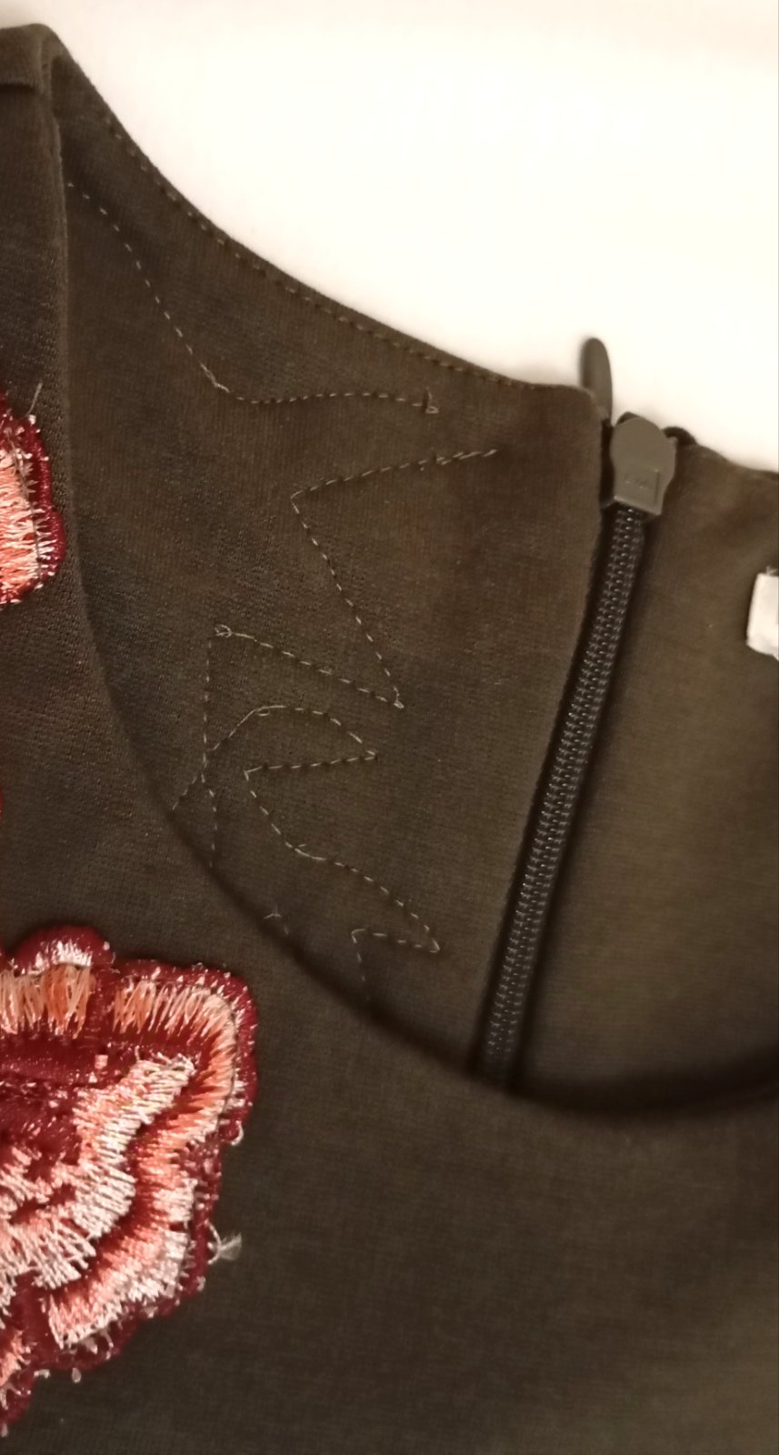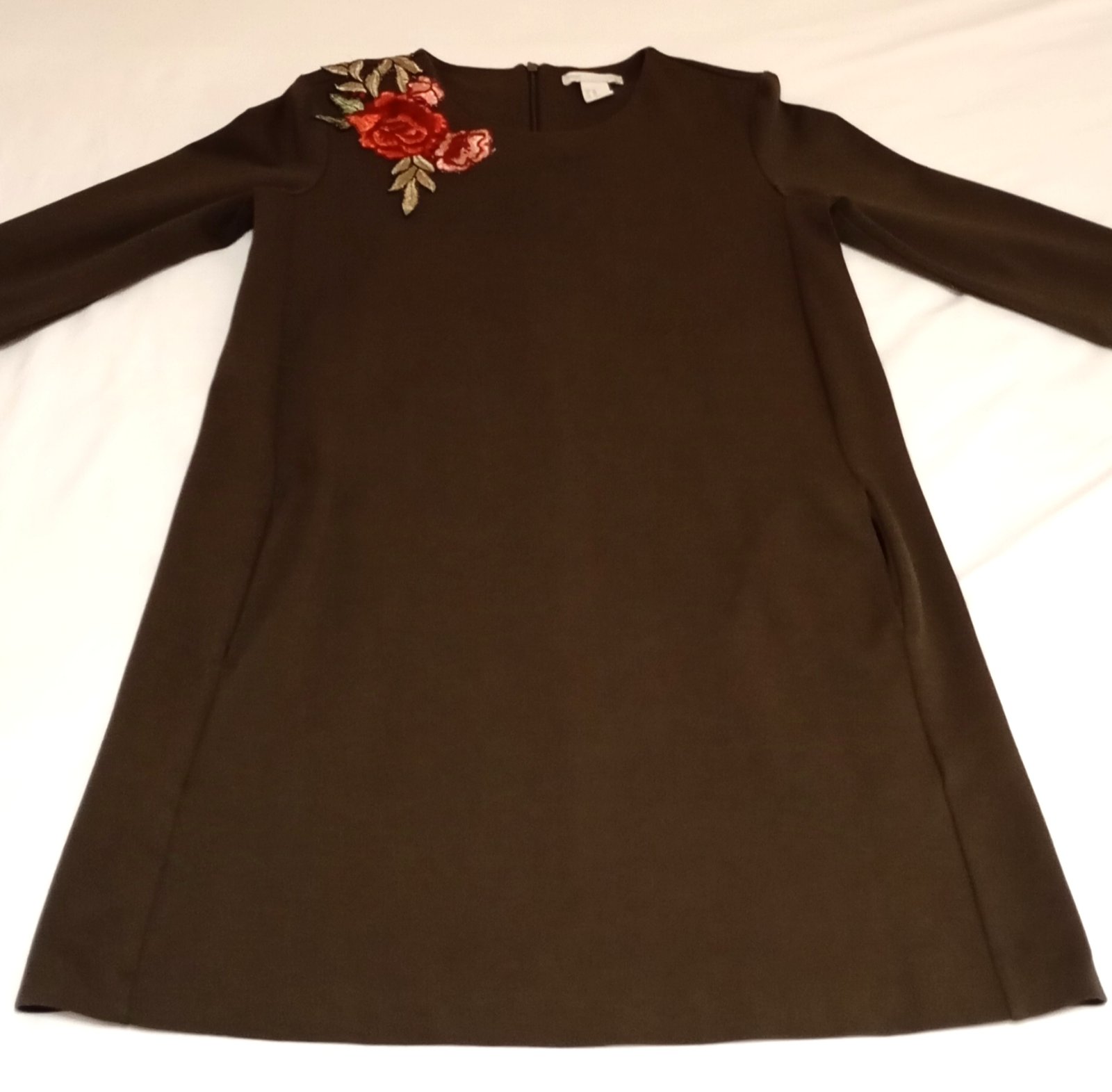 Trochu hrubšie, elegantné šaty olivovej farby s trištvrťovými rukávmi, nášivkou ruží okolo jedného pleca, dvomi vreckami a zipsom na chrbte.