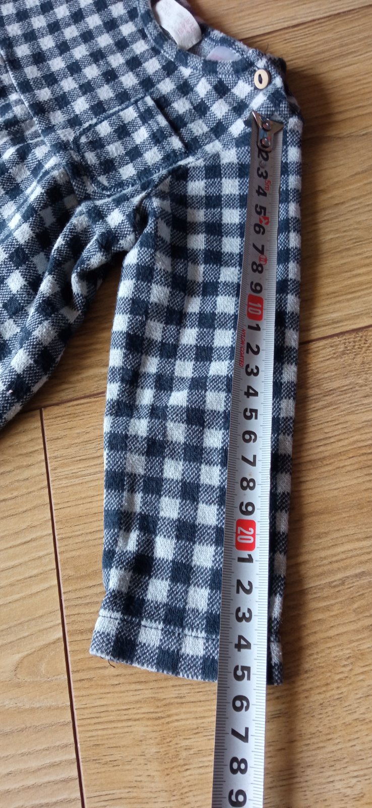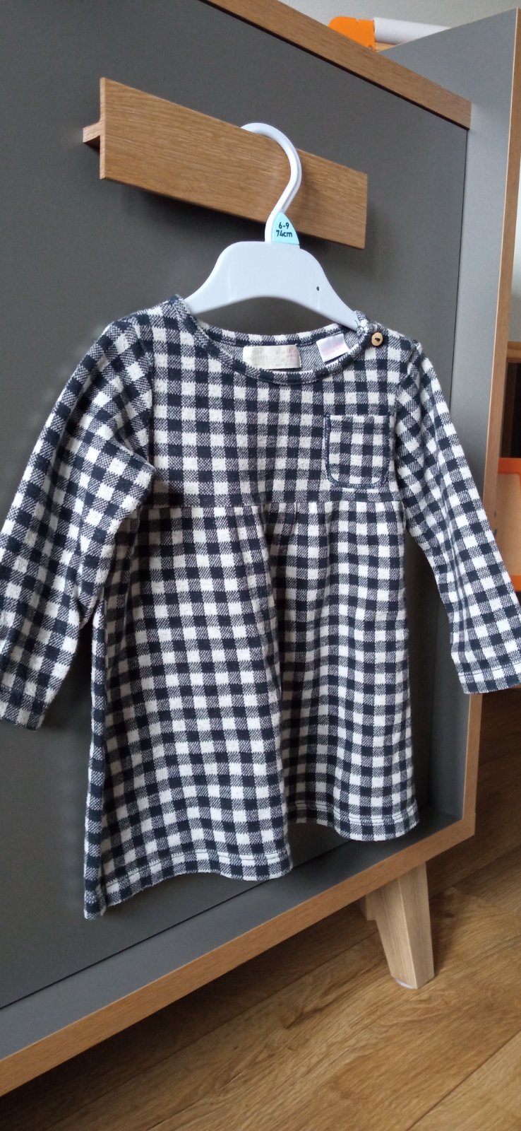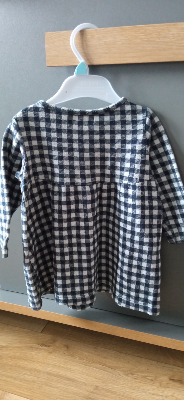 Predám kockované dievčenské šaty z hrubšej bavlny vhodné do prechodného a zimného obdobia. Veľkosť je 80 ale pre užšie ramená sú vhodné aj na veľkosť 74. Dcérka ich obliekla aj pri veľkosti 86 v 16 mesiaci. Rozmery viď foto. Obliekanie cez hlavu s gombíkom na boku